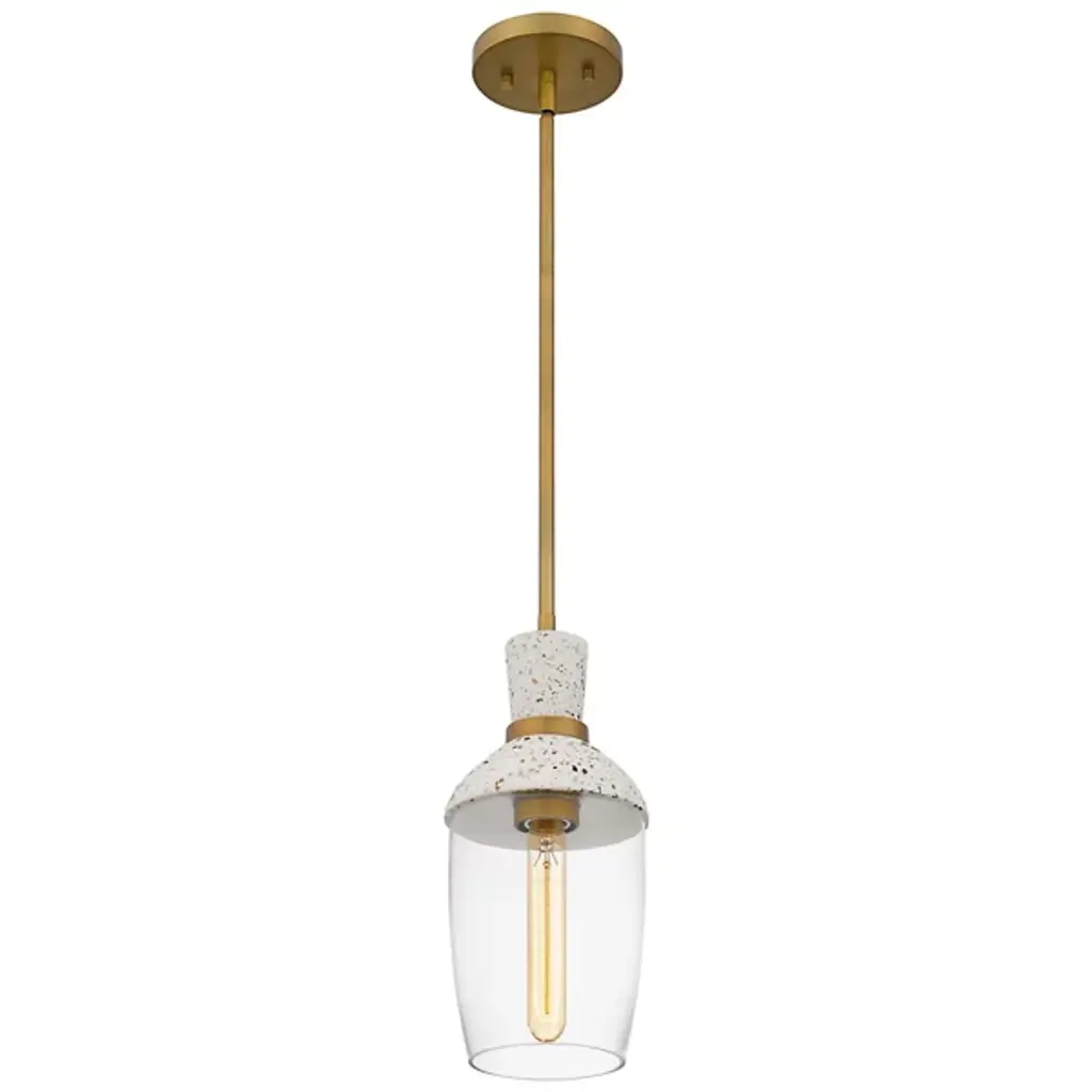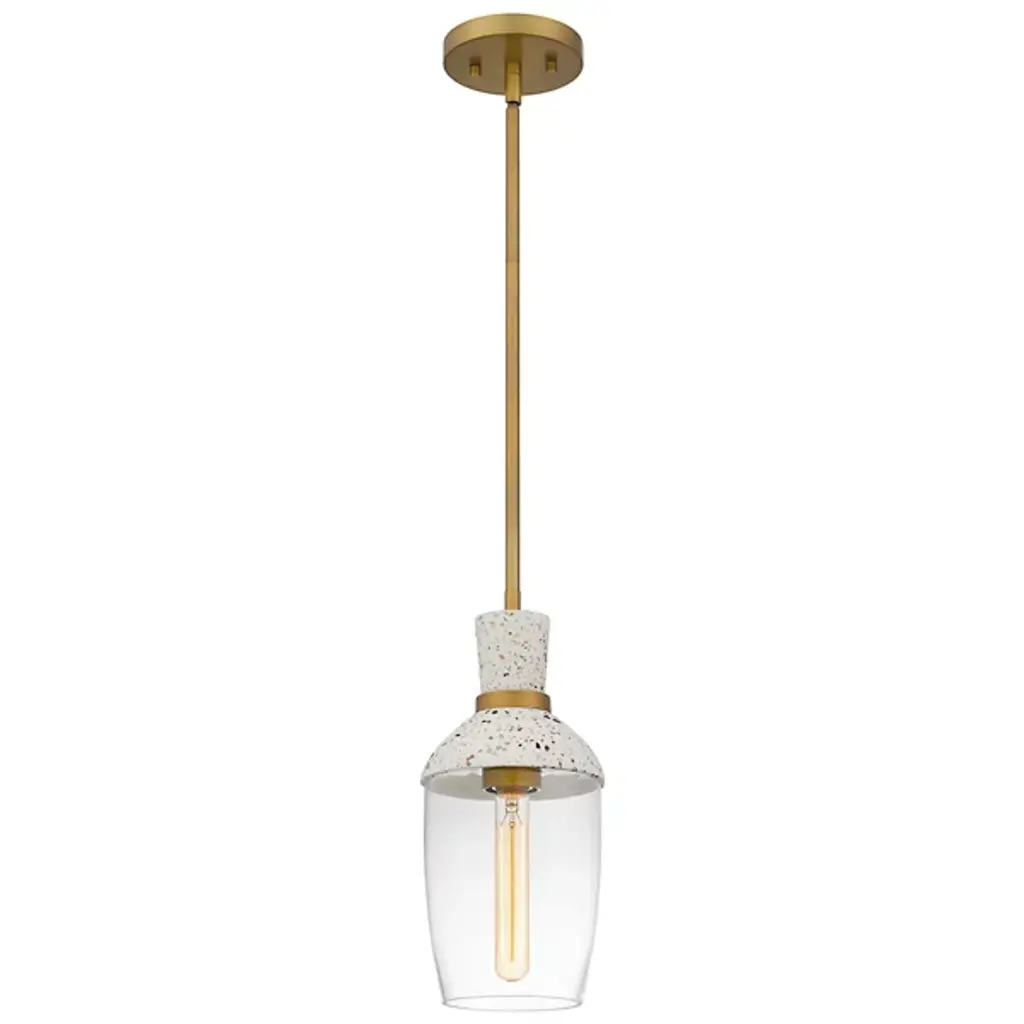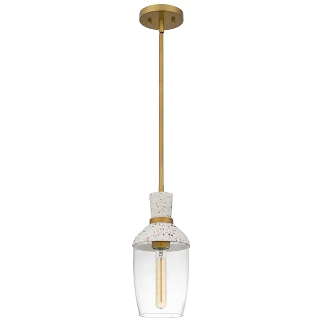 The Springsteen Mini Pendant from Quoizel combines a streamlined silhouette with industrial styling, making it a striking addition to any space. Its clear glass and unique speckled terrazzo create drama and style, while the aged brass finish adds a hint of luster. Whether hung alone or in a grouping over a kitchen island, bar area, or table, the Springsteen Mini Pendant offers a modern update to your decor, seamlessly blending functionality with aesthetic appeal.