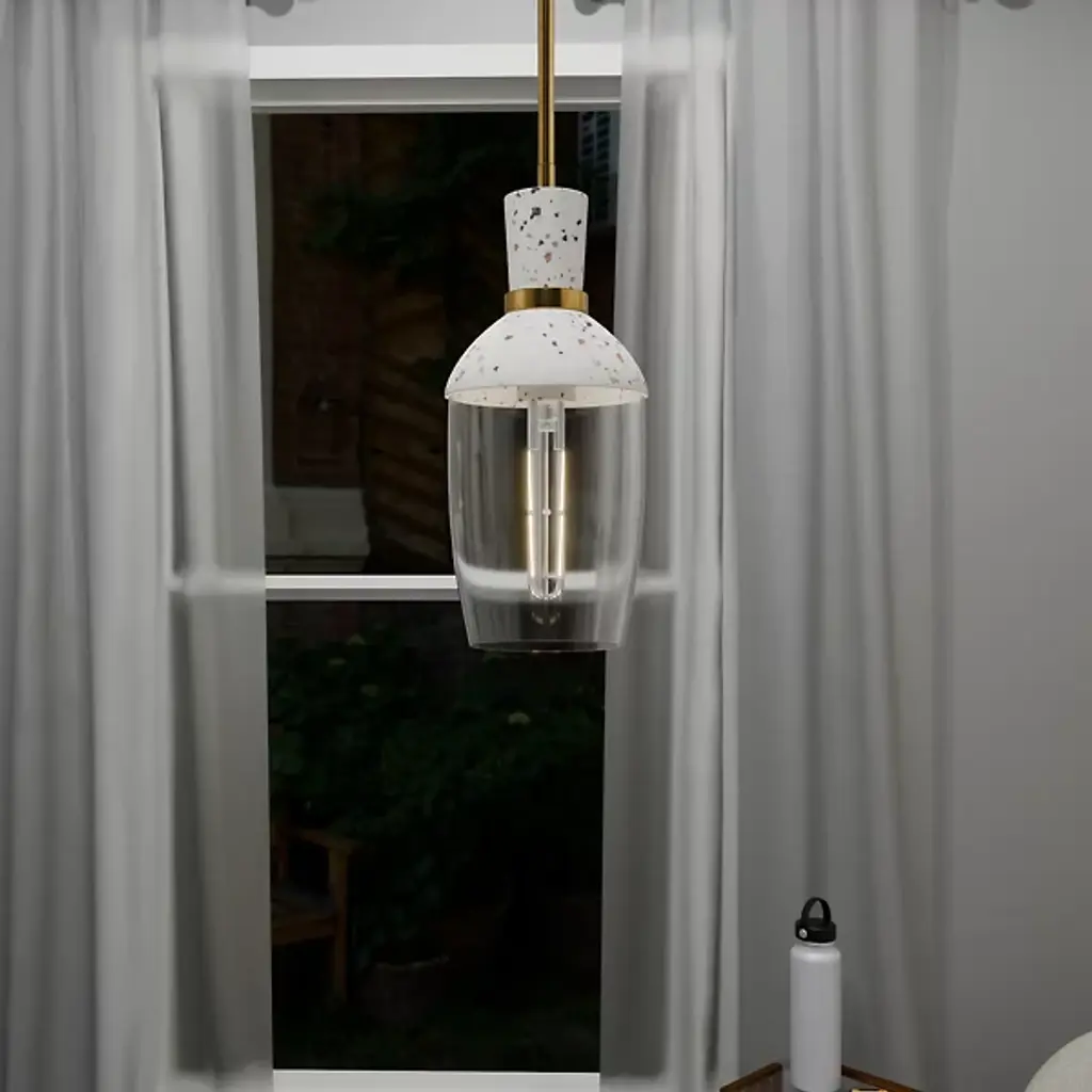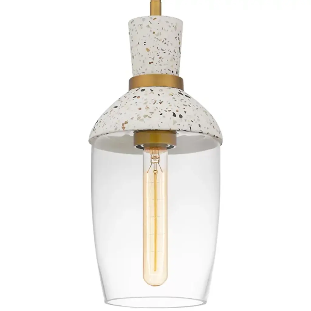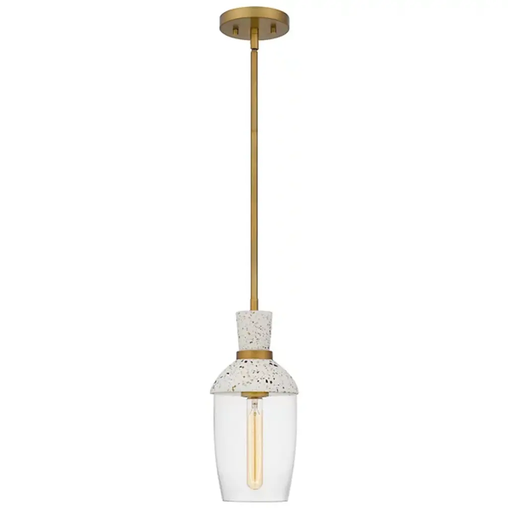 The Springsteen Mini Pendant from Quoizel combines a streamlined silhouette with industrial styling, making it a striking addition to any space. Its clear glass and unique speckled terrazzo create drama and style, while the aged brass finish adds a hint of luster. Whether hung alone or in a grouping over a kitchen island, bar area, or table, the Springsteen Mini Pendant offers a modern update to your decor, seamlessly blending functionality with aesthetic appeal.