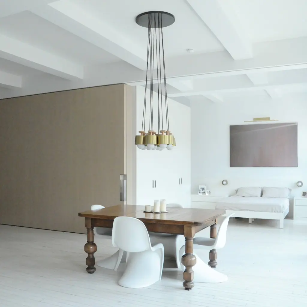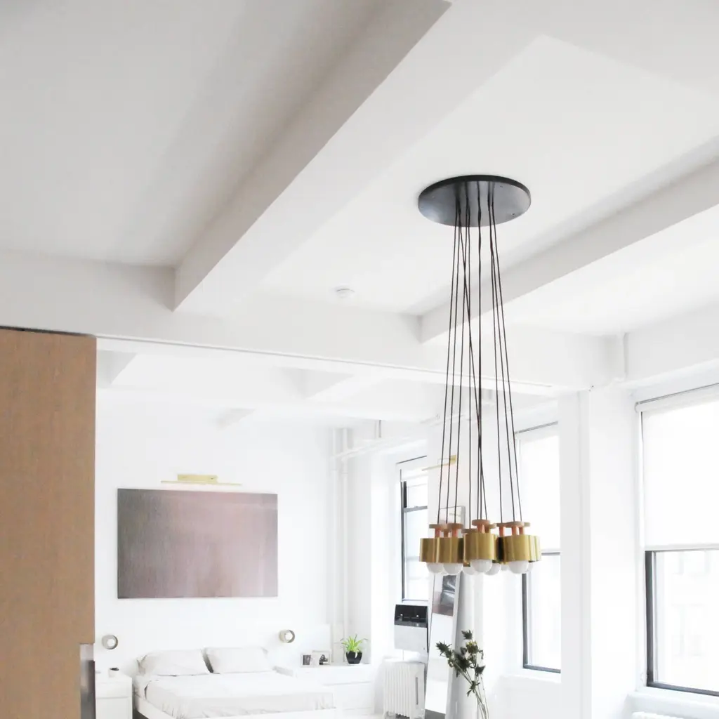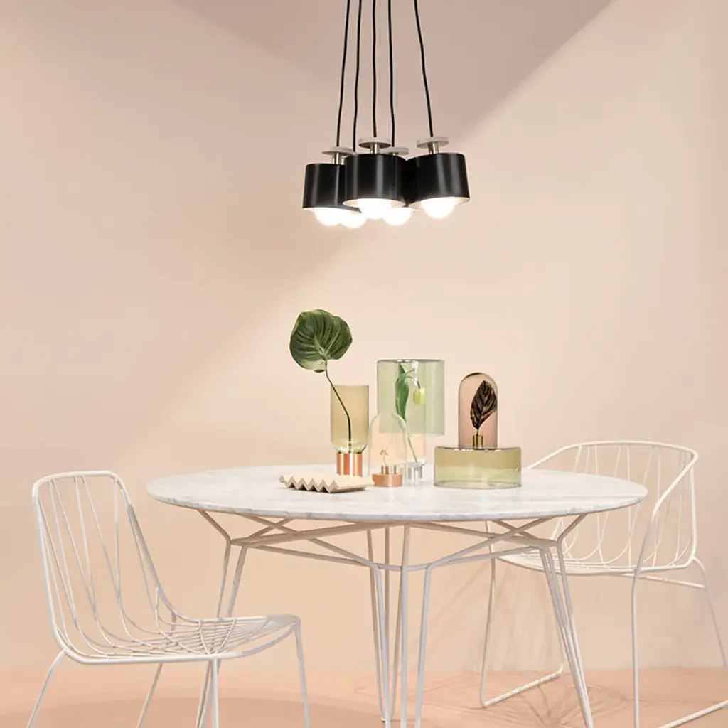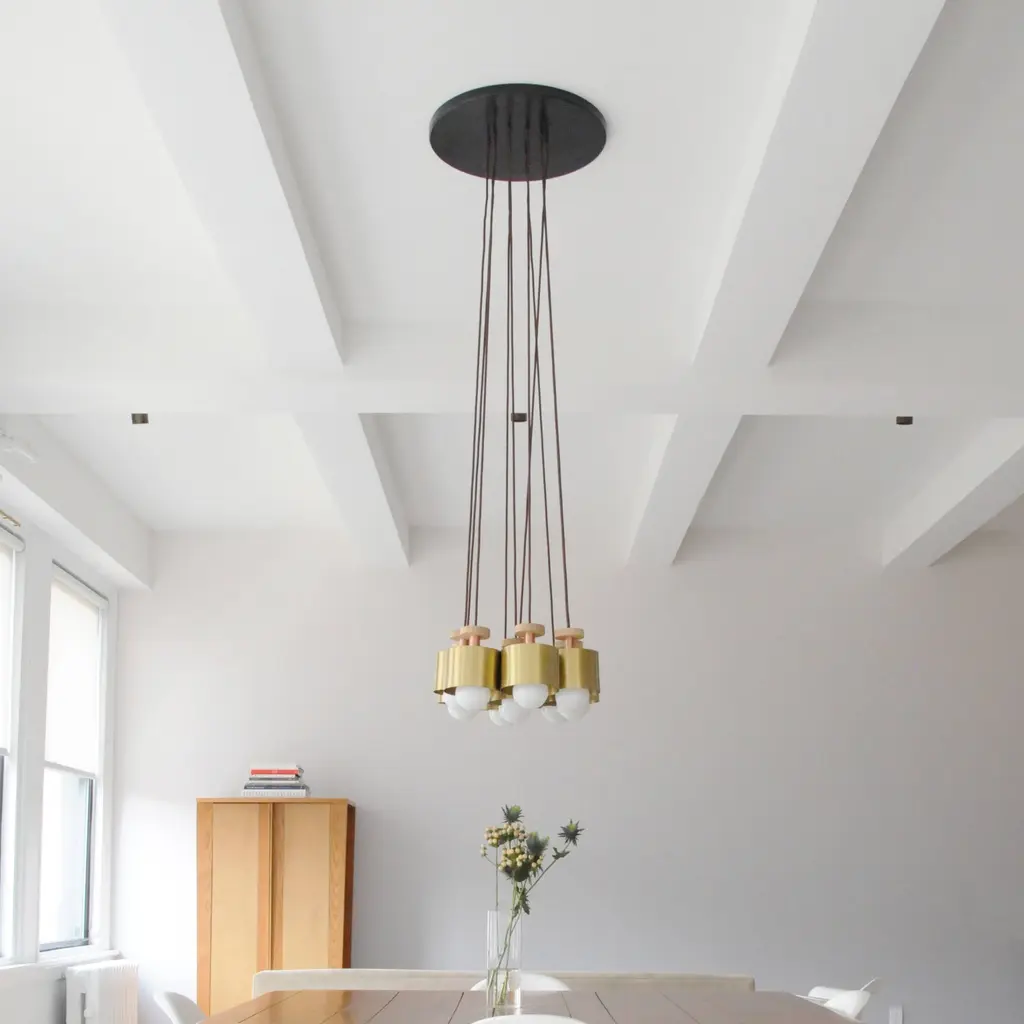 Ladies & Gentlemen studios' clustered Spun pendant is a tour-de-force of lighting drama and intrigue. As if they were fashioning jewelry, designers Dylan Davis and Jean Lee treated the globe lightbulb like a jewel that they were fitting into a complementary "setting." Spun's options include a polished brass, blackened brass, or frosted glass shade for the surround. The white interior reflector adjusts to highlight the exposed bulb much like a precious gem. In 3- or 5-piece clusters; custom configurations are available (inquire at A+R).