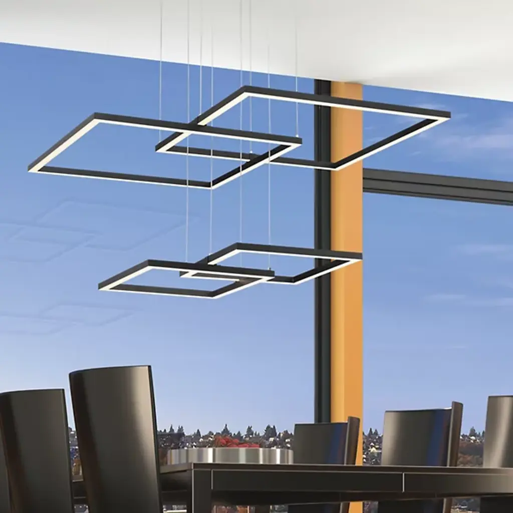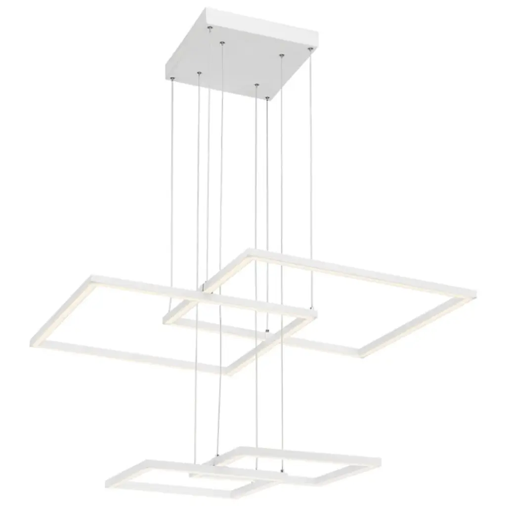 A powerful lesson in geometry. The Squared LED Pendant by Access Lighting descends from the ceiling, making a strong statement. A two-tiered design with small and large squared Acrylic shades that emit clean, white light downward. Cable suspended from a large square ceiling mount, the smaller square shades float below a larger set, each made up of a series of overlapping and interconnected lines. The thoughtful design is the perfect modern statement in a large open, ceiling foyer or living room.
