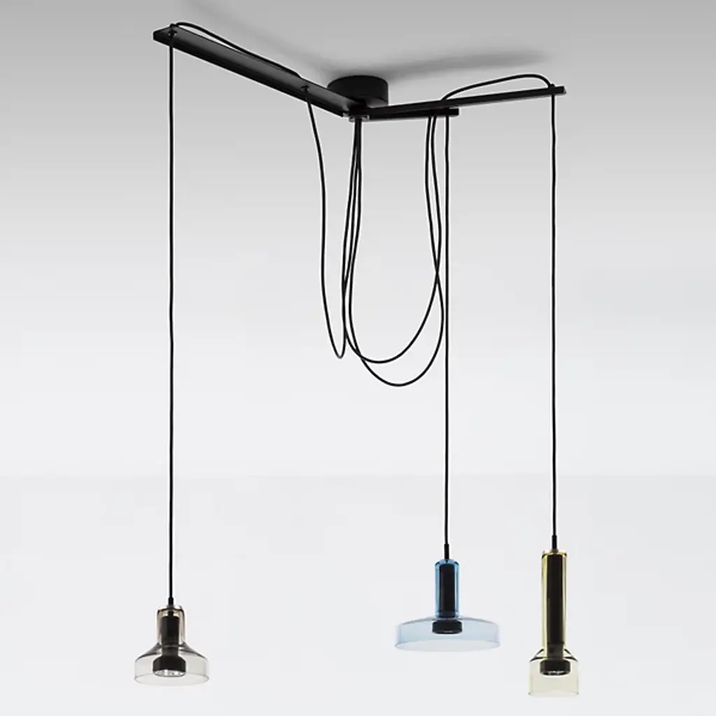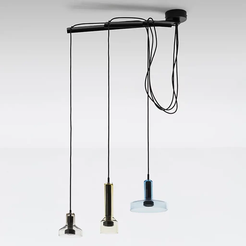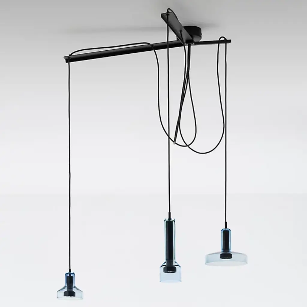 The Stablight Multi-Light Pendant by Danese Milano, designed by artist Arik Levy, brings together the unique yet complementary geometric shapes of each of the three Stablight pendants. The inspiration comes from Levy’s own Stab Vases and the same techniques of traditional glassblowing coupled with the use of a wooden mold to create the final shape are employed.