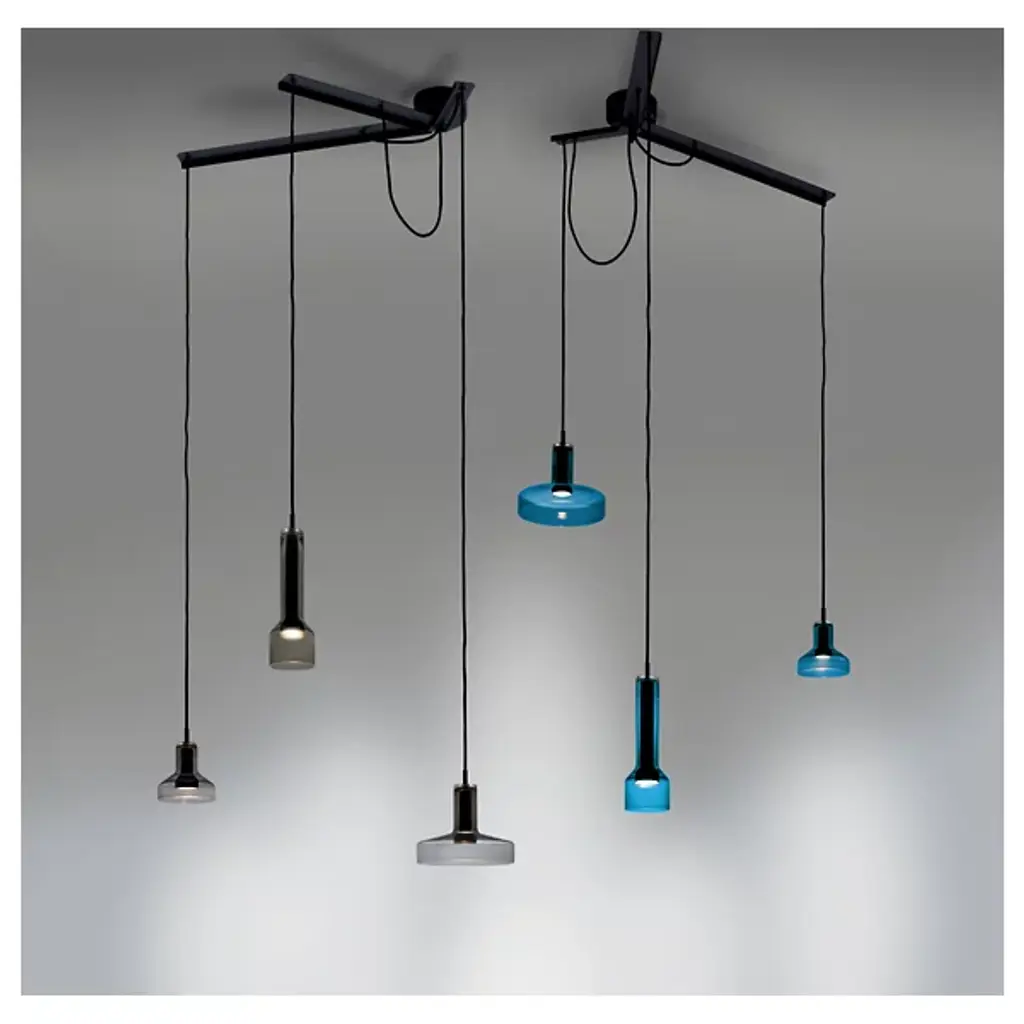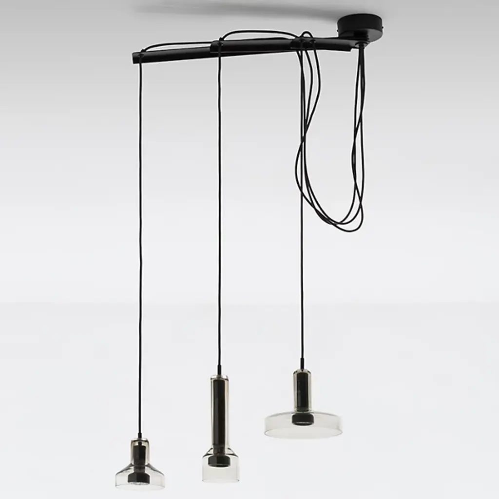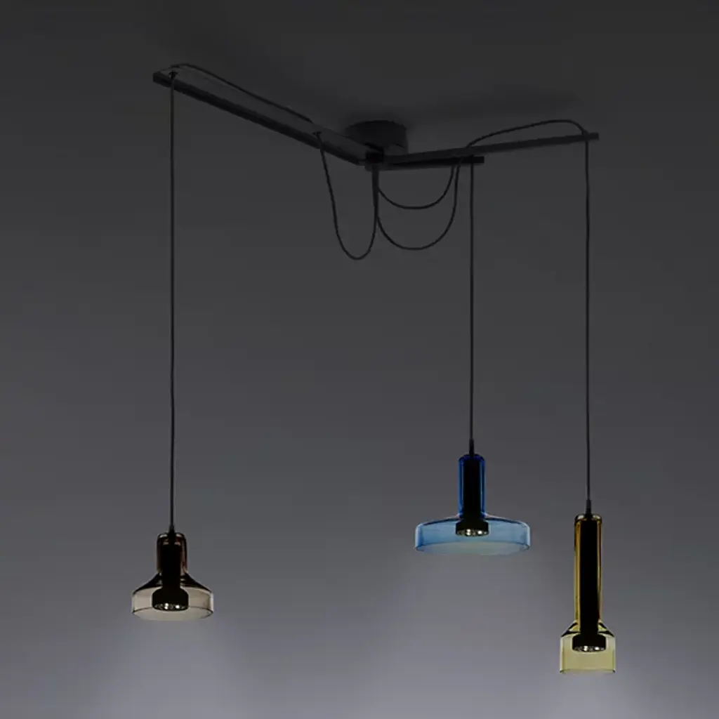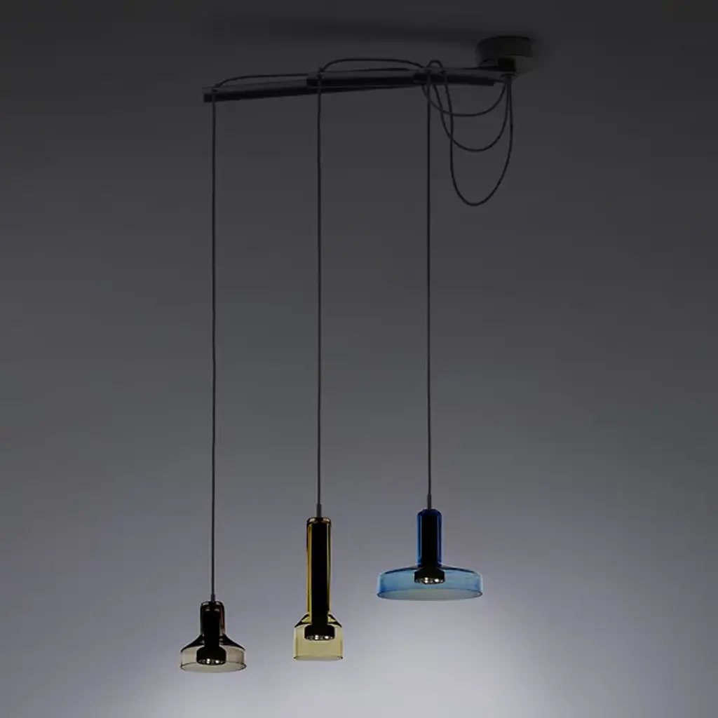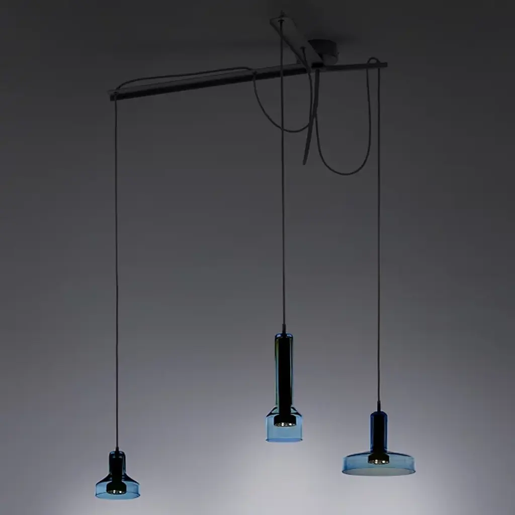 The Stablight Multi-Light Pendant by Danese Milano, designed by artist Arik Levy, brings together the unique yet complementary geometric shapes of each of the three Stablight pendants. The inspiration comes from Levy’s own Stab Vases and the same techniques of traditional glassblowing coupled with the use of a wooden mold to create the final shape are employed.