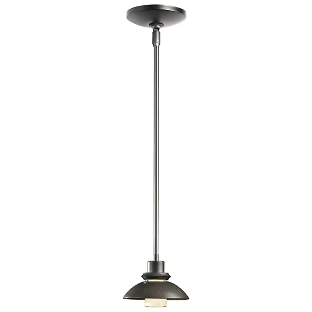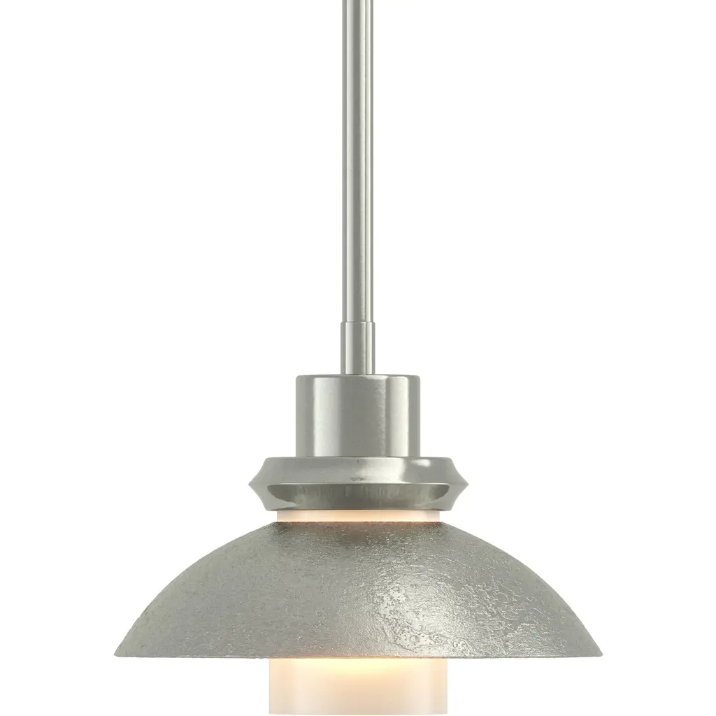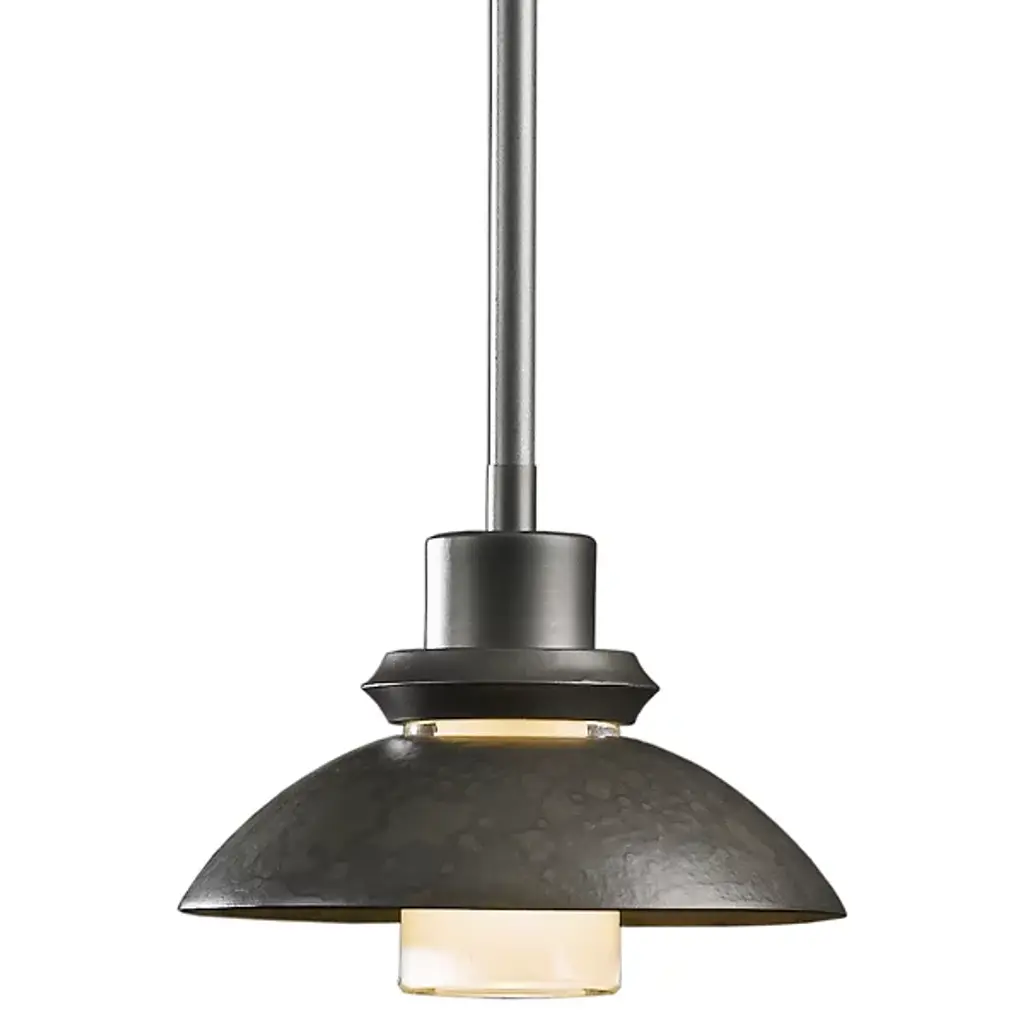Hand-forged and crafted, the Hubbardton Forge Staccato Mini Pendant is a handsome balance of strength and delicacy. A flared wrought iron shade gives the look a rough, earthy quality while the hand-blown glass diffuser suggests a gentler, welcoming tone.