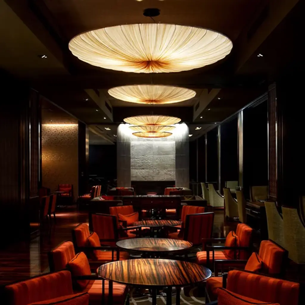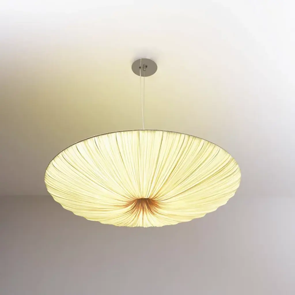 An elegant disc of texture and illuminations. The Stand By 33'' Pendant by Aqua Creations brings a refined look and spectacular illumination to your home. The handmade shade showcases a round disc profile encased in pleated silk bringing artful, haute couture vibe to any space. The silk shade houses two lamps and casts a softened light over a large space. This hanging fixture is a refined addition to modern interiors and looks especially perfect in living spaces, dining halls, kitchens, and bedrooms.