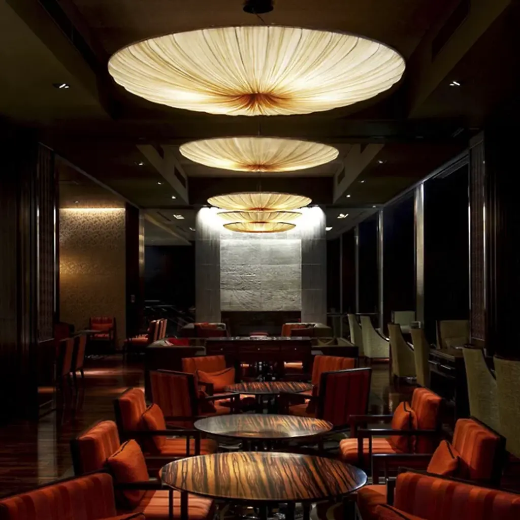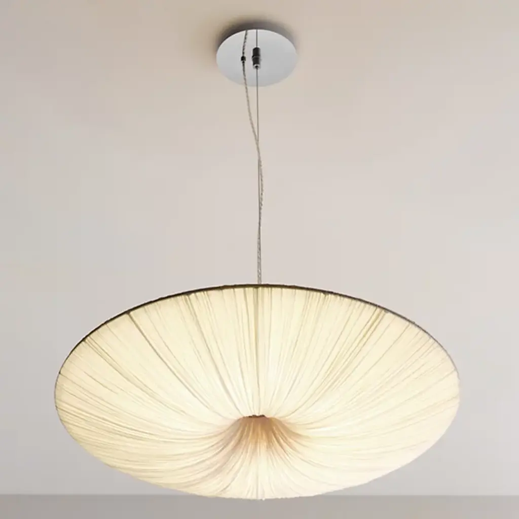 An elegant disc of texture and illuminations. The Stand By 33'' Pendant by Aqua Creations brings a refined look and spectacular illumination to your home. The handmade shade showcases a round disc profile encased in pleated silk bringing artful, haute couture vibe to any space. The silk shade houses two lamps and casts a softened light over a large space. This hanging fixture is a refined addition to modern interiors and looks especially perfect in living spaces, dining halls, kitchens, and bedrooms.