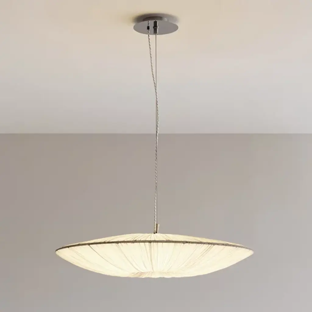 An elegant disc of texture and illuminations. The Stand By 33'' Pendant by Aqua Creations brings a refined look and spectacular illumination to your home. The handmade shade showcases a round disc profile encased in pleated silk bringing artful, haute couture vibe to any space. The silk shade houses two lamps and casts a softened light over a large space. This hanging fixture is a refined addition to modern interiors and looks especially perfect in living spaces, dining halls, kitchens, and bedrooms.