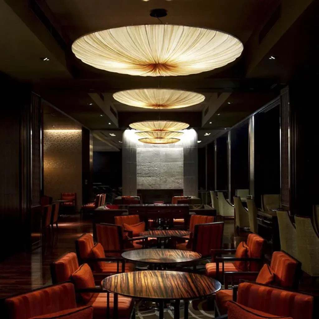 An ethereal display of neatly pleated illumination. The Stand By Pendant by Aqua Creations brings an air of sophistication and character to your home. It features a round disc shade, enveloped in pleated tussar silk to create the signature sculptural look. This handmade shade is suspended from a custom-made metal pole and houses four lamps that produce warm lighting across a wider space. Whether on its own or in clusters, this fixture brings a distinctive flair to contemporary spaces.