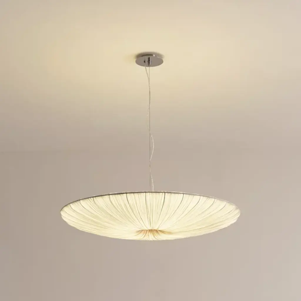 An ethereal display of neatly pleated illumination. The Stand By Pendant by Aqua Creations brings an air of sophistication and character to your home. It features a round disc shade, enveloped in pleated tussar silk to create the signature sculptural look. This handmade shade is suspended from a custom-made metal pole and houses four lamps that produce warm lighting across a wider space. Whether on its own or in clusters, this fixture brings a distinctive flair to contemporary spaces.
