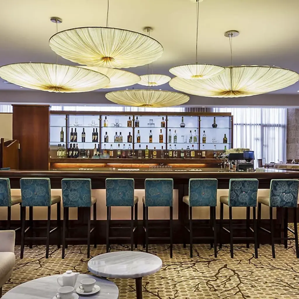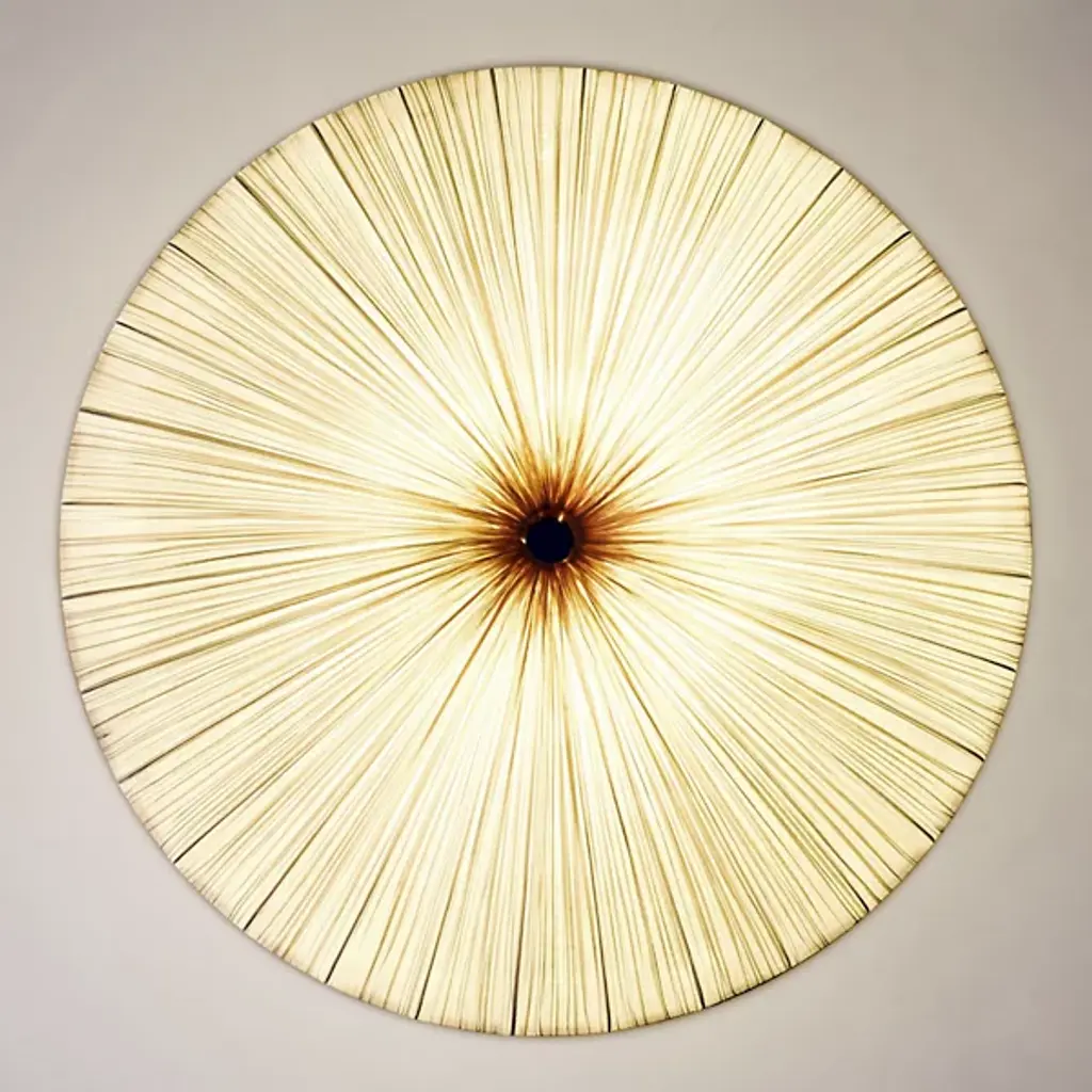 An ethereal display of neatly pleated illumination. The Stand By Pendant by Aqua Creations brings an air of sophistication and character to your home. It features a round disc shade, enveloped in pleated tussar silk to create the signature sculptural look. This handmade shade is suspended from a custom-made metal pole and houses four lamps that produce warm lighting across a wider space. Whether on its own or in clusters, this fixture brings a distinctive flair to contemporary spaces.