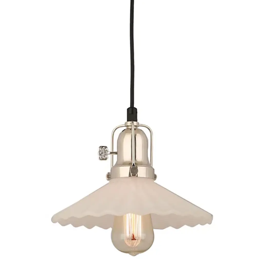 The Stanton Pendant by Hi-Lite is a bold and handsome addition to spaces. Pairing a fun, flared glass shade that has a wavy edge with an industrial-style metal top, this pendant is simply suspended by a single cord. A visible bulb peeks out below the shade to offer a bright touch to surroundings, and the top features hardware detailing that rounds out the mix of materials that compose this design.