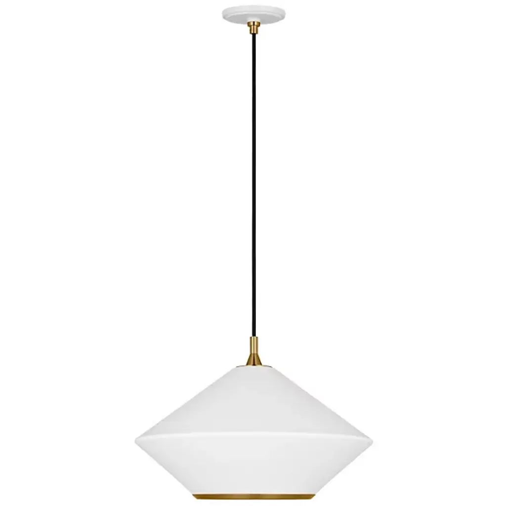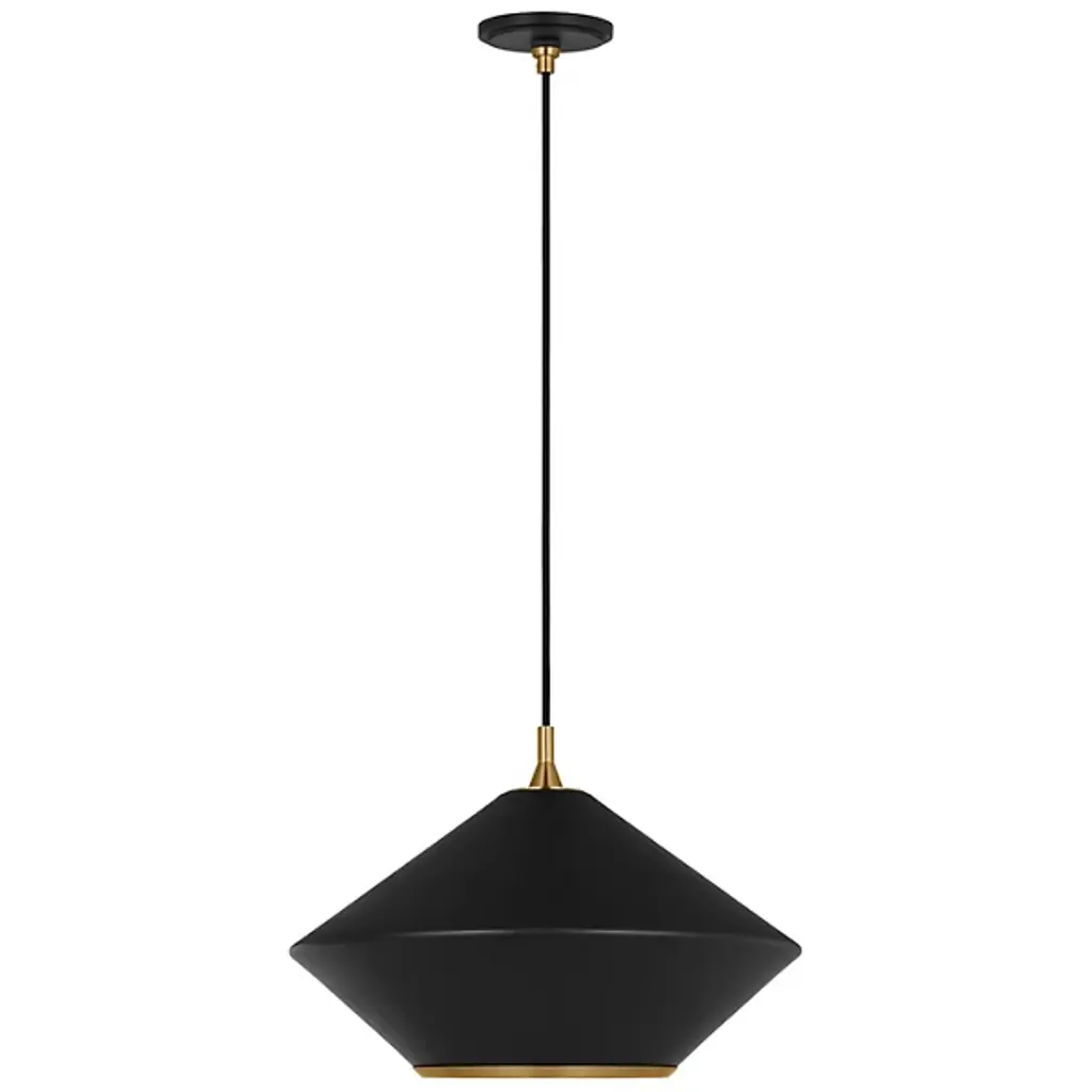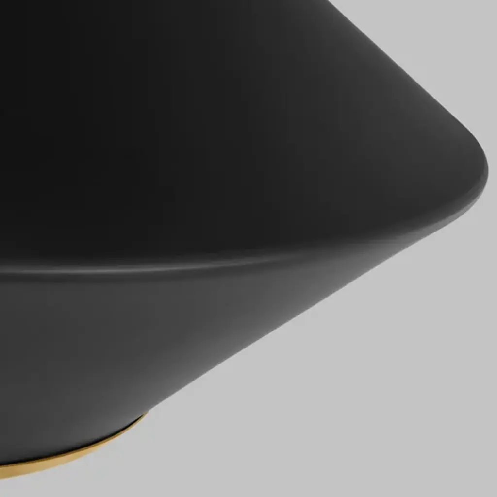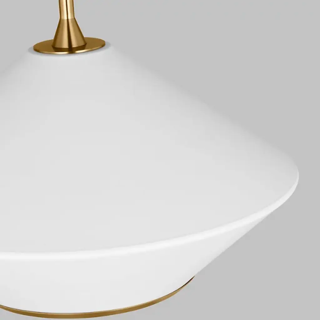 The Stanza Pendant from Visual Comfort Studio conducts a stately concerto of appealing, retro style. A tall, spindly fixture racing down from a striking stepped disc canopy, it places bright, damp-rated lamping inside an angular geometric shade that bevels inward and down to a smaller opening at its base. Both the light housing and shade rim are embellished by bright steel accents that contrast with the larger matte-textured material, the lower ring sparkling with reflected light that accents the direct pool of downlight broadcast from within.