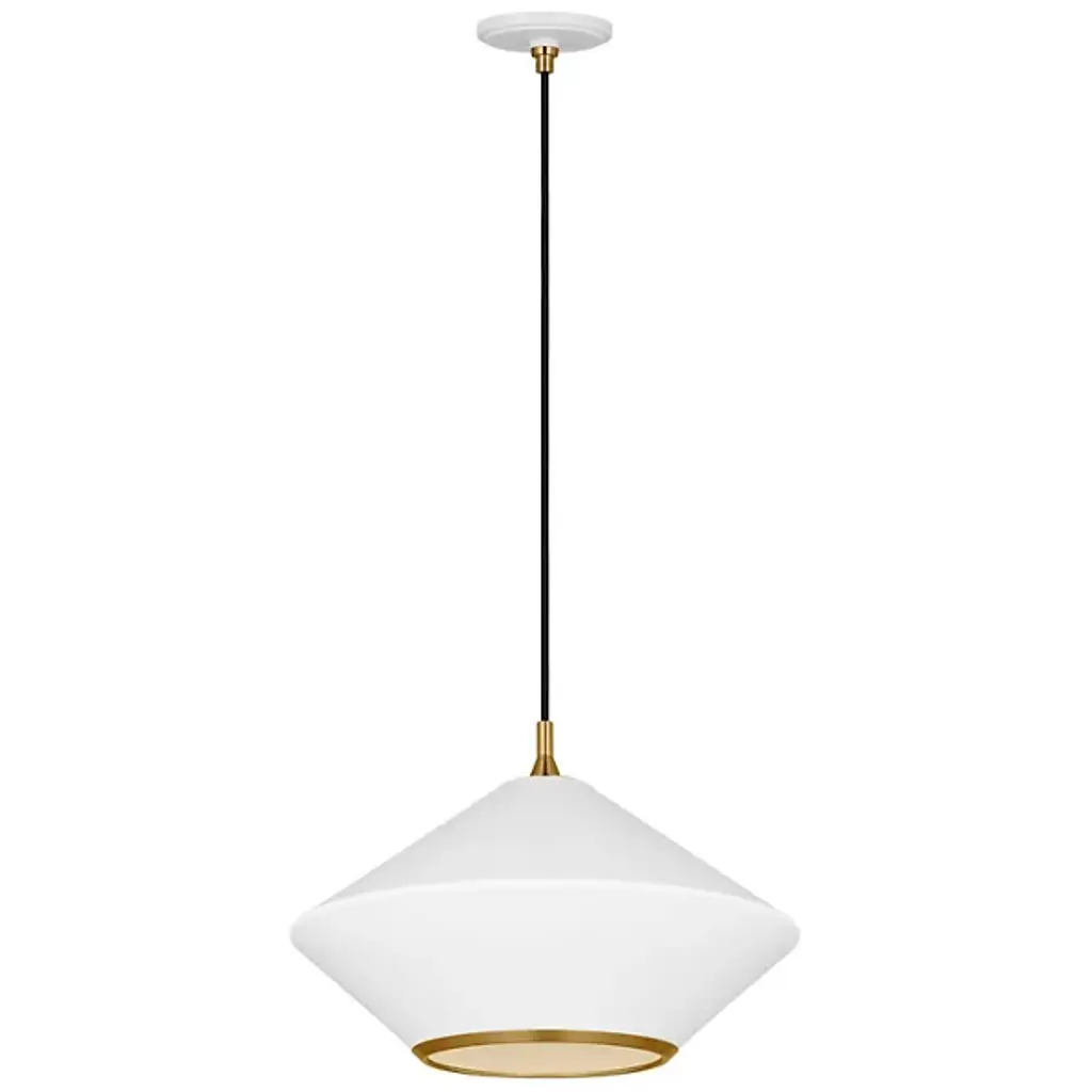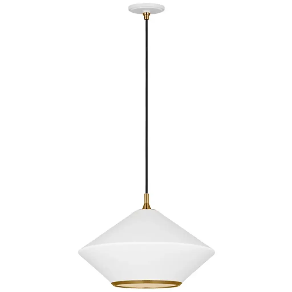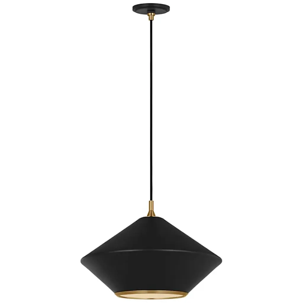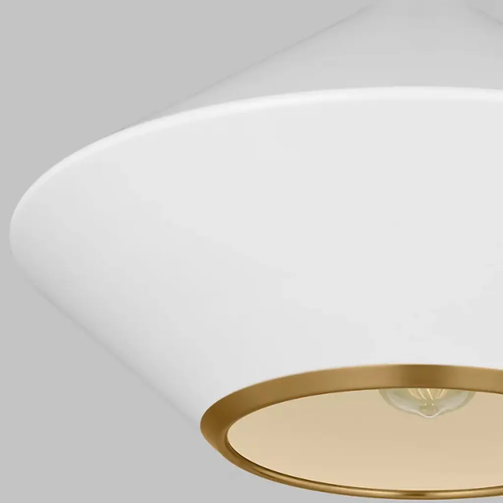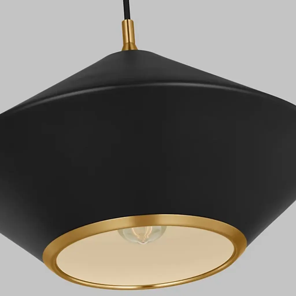 The Stanza Pendant from Visual Comfort Studio conducts a stately concerto of appealing, retro style. A tall, spindly fixture racing down from a striking stepped disc canopy, it places bright, damp-rated lamping inside an angular geometric shade that bevels inward and down to a smaller opening at its base. Both the light housing and shade rim are embellished by bright steel accents that contrast with the larger matte-textured material, the lower ring sparkling with reflected light that accents the direct pool of downlight broadcast from within.