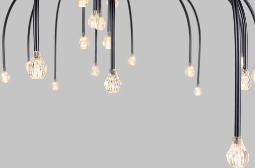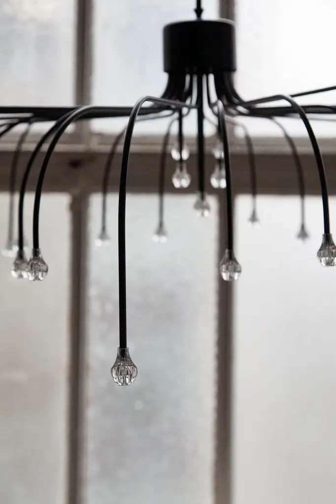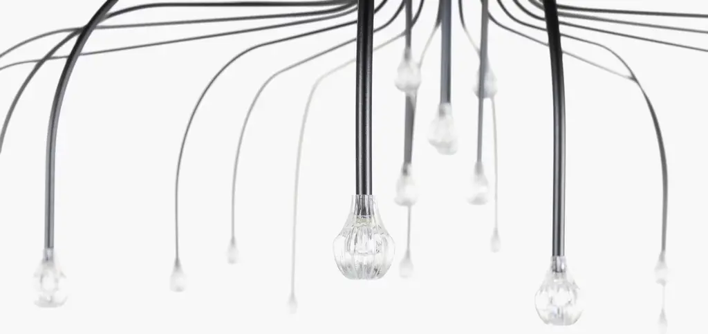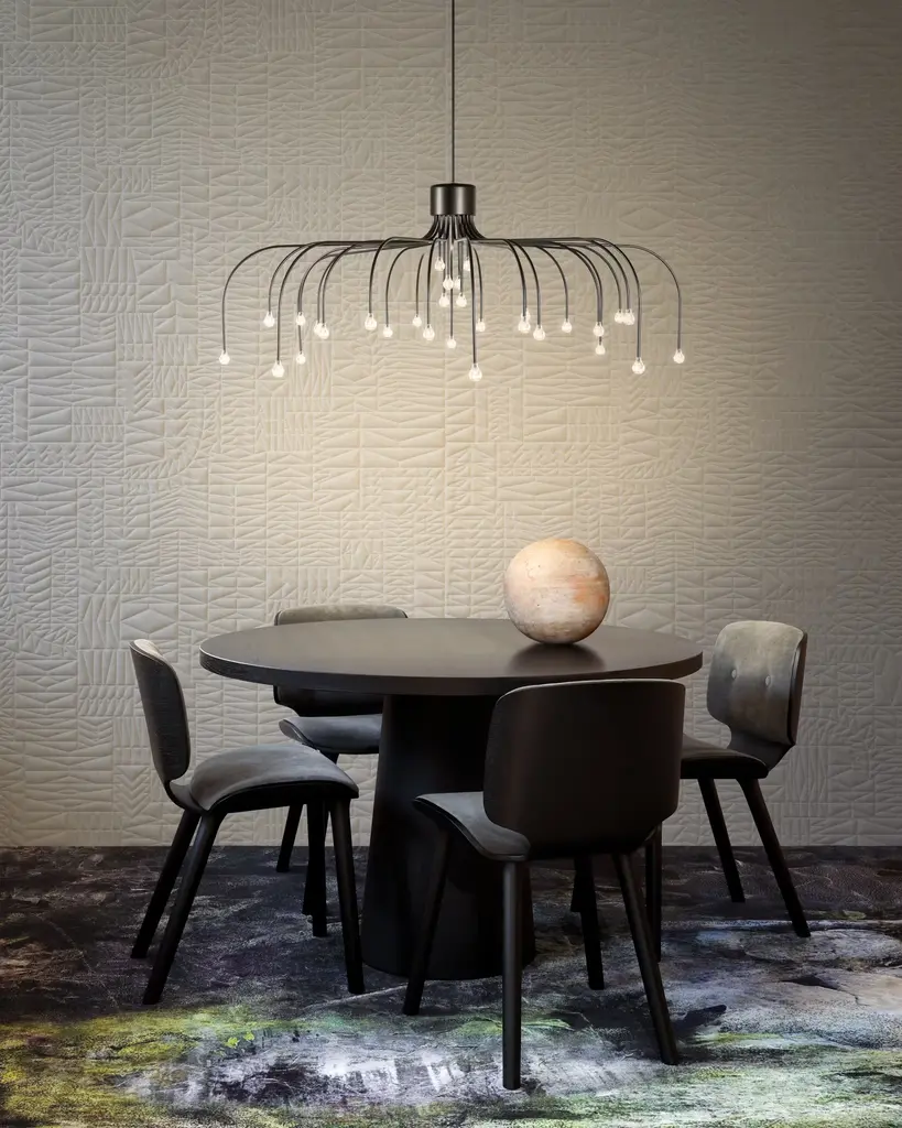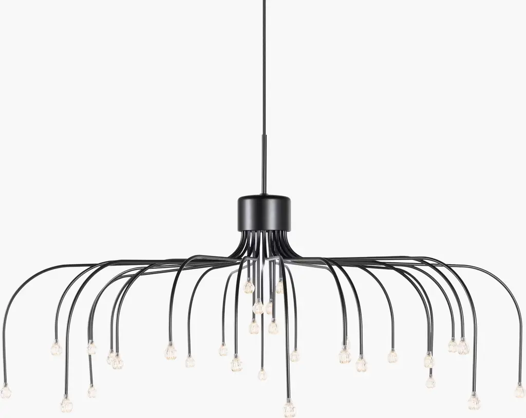 Create the feeling of a celestial night sky in your dining room with the Starfall 30 Pendant (2022). This elegant stainless-steel chandelier features a canopy of 30 slim arms of varying lengths, each punctuated by an LED light. The shower of starlight from this upside-down chandelier evokes the ethereal artistry of nature. Bulbs (included): 30 integrated LEDs. UL Listed. Made in the Netherlands.