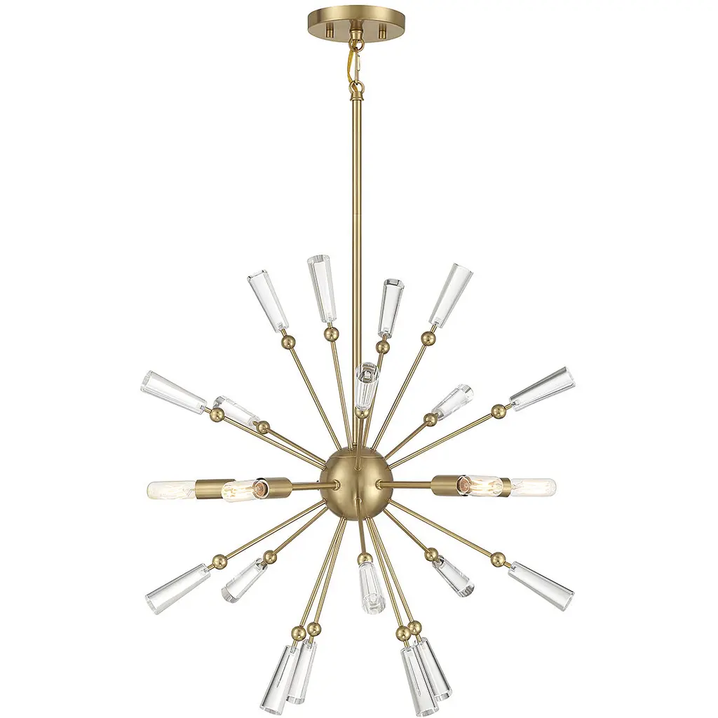 Iconic Sputnik style is reinvented with a fun new form in this 5-light pendant. Clear crystal accents decorate each arm of the structure and pair nicely with the exposed bulbs. Matte Black finish. 26" height and 26" width. Adjustable height ranges from 32" to 80". Uses five candelabra size bulbs with a max of 60 watts per bulb (not included). Supplied with four 12" downrods and one 6" downrod. Uses a dual mount hanging system for flat or sloped ceilings.
