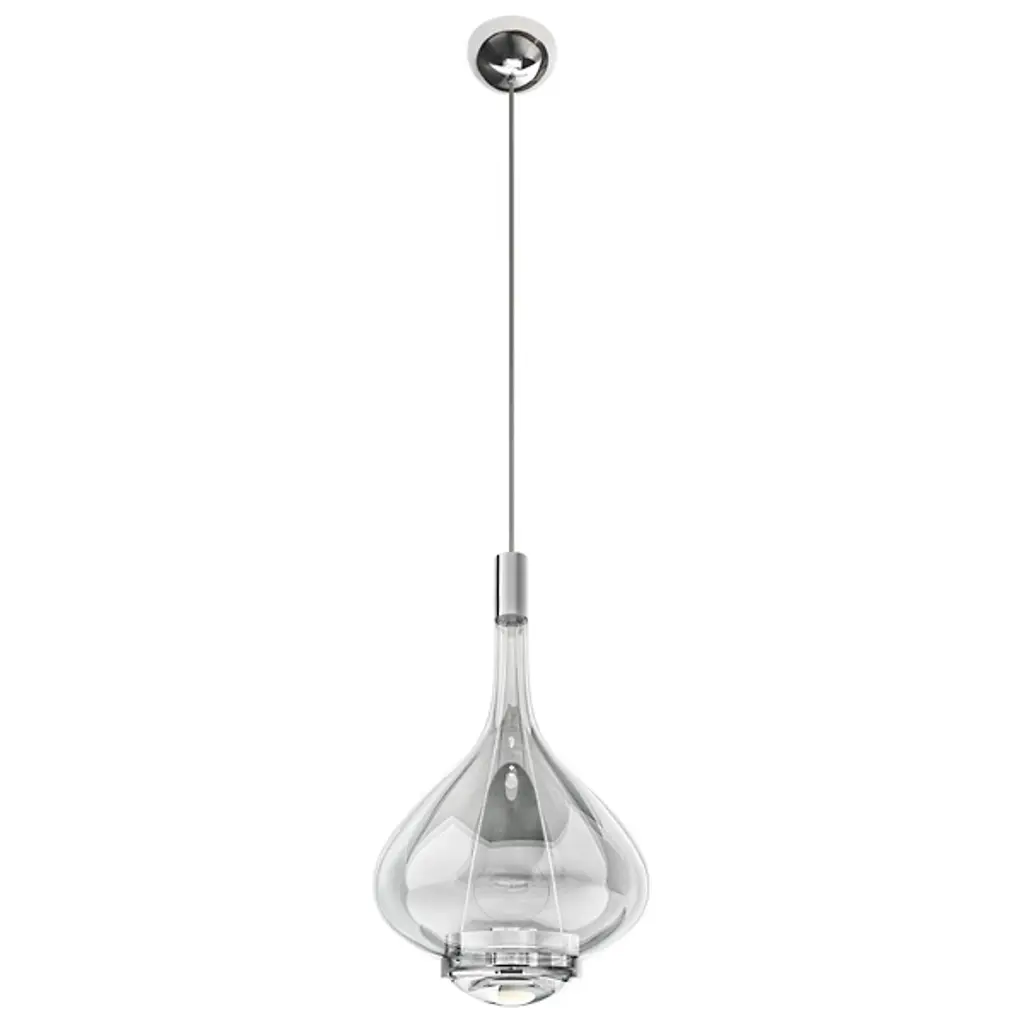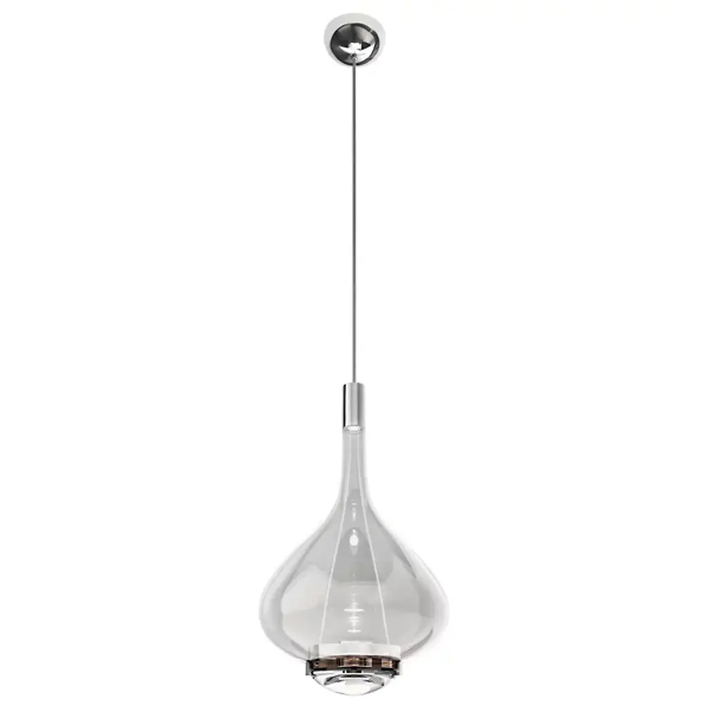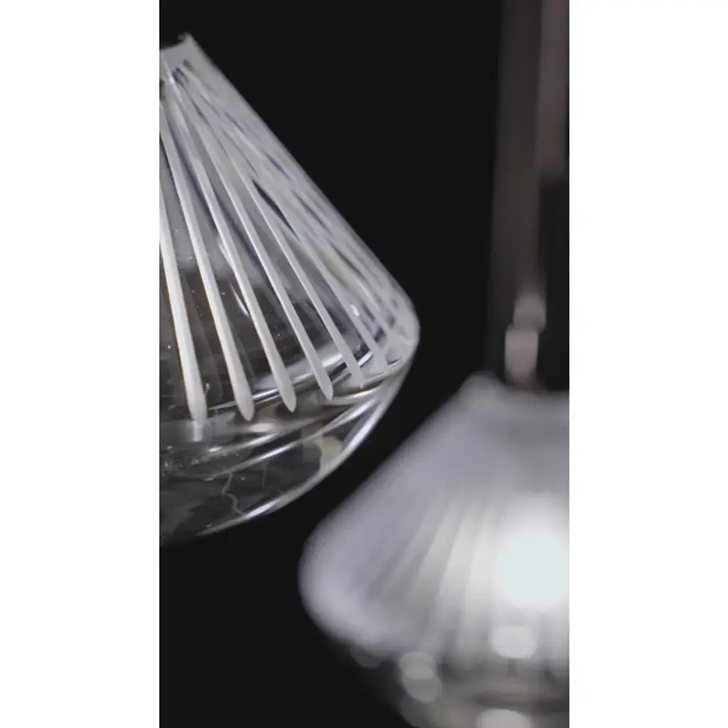 The Stellar Dust Mini Pendant from Bomma suspends particles within a spherical mouth-blown crystal form, creating depth and visual texture. Václav Mlynár and Jakub Pollág originally designed this piece with CMC Architects for J&T Bank in Prague, where its reception led to broader production. The embedded speckles appear to drift through the transparent glass, producing optical effects that shift with viewing angle. A steel frame holds the orb, with the internal inclusions interacting with light as it passes through the crystal body.