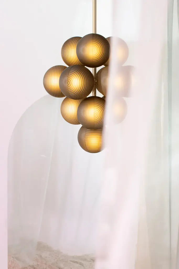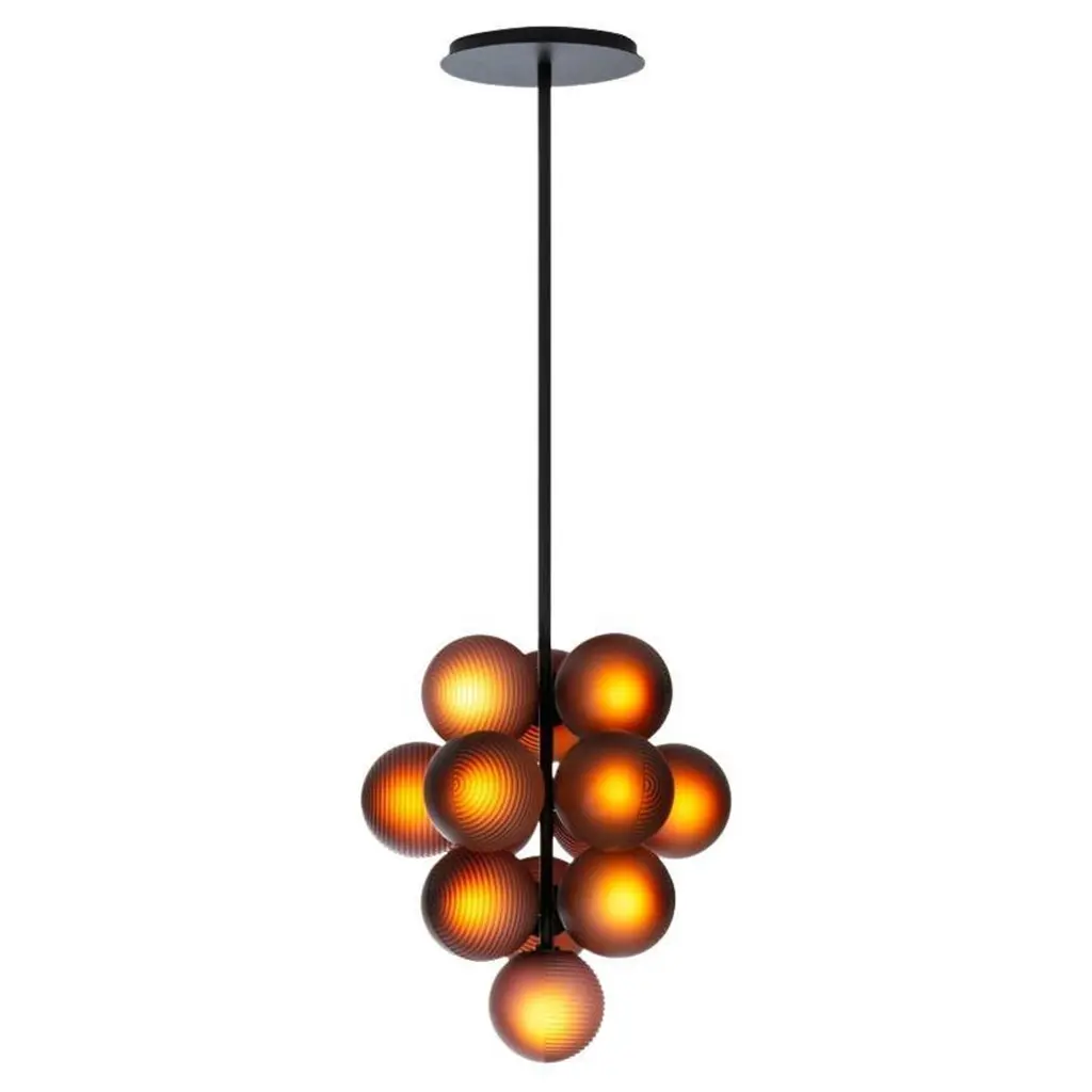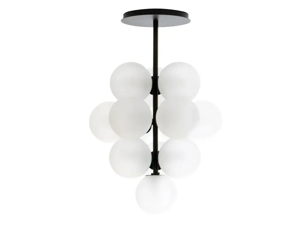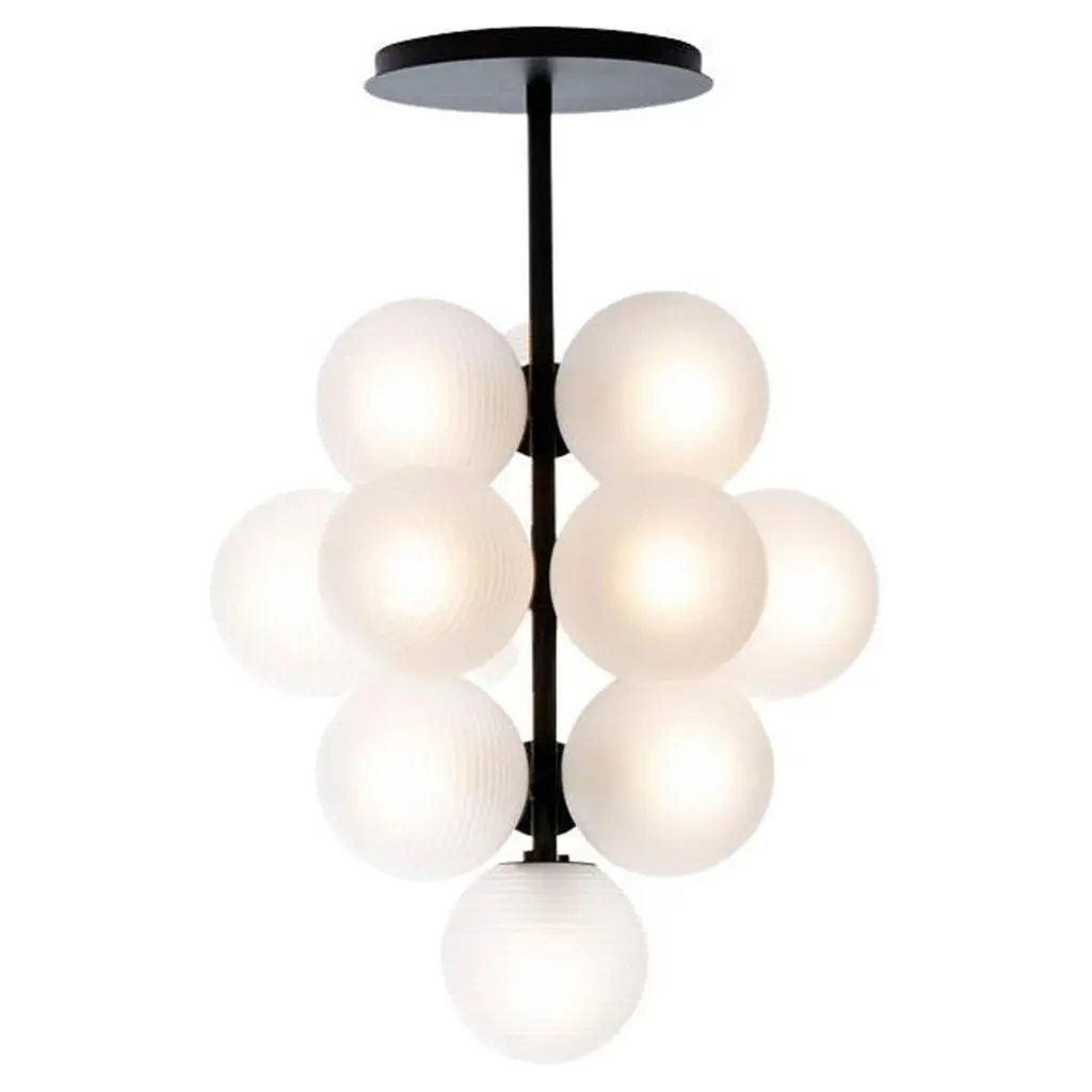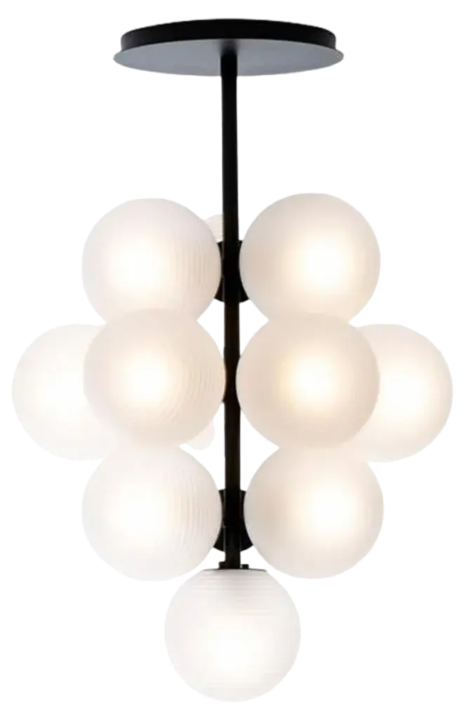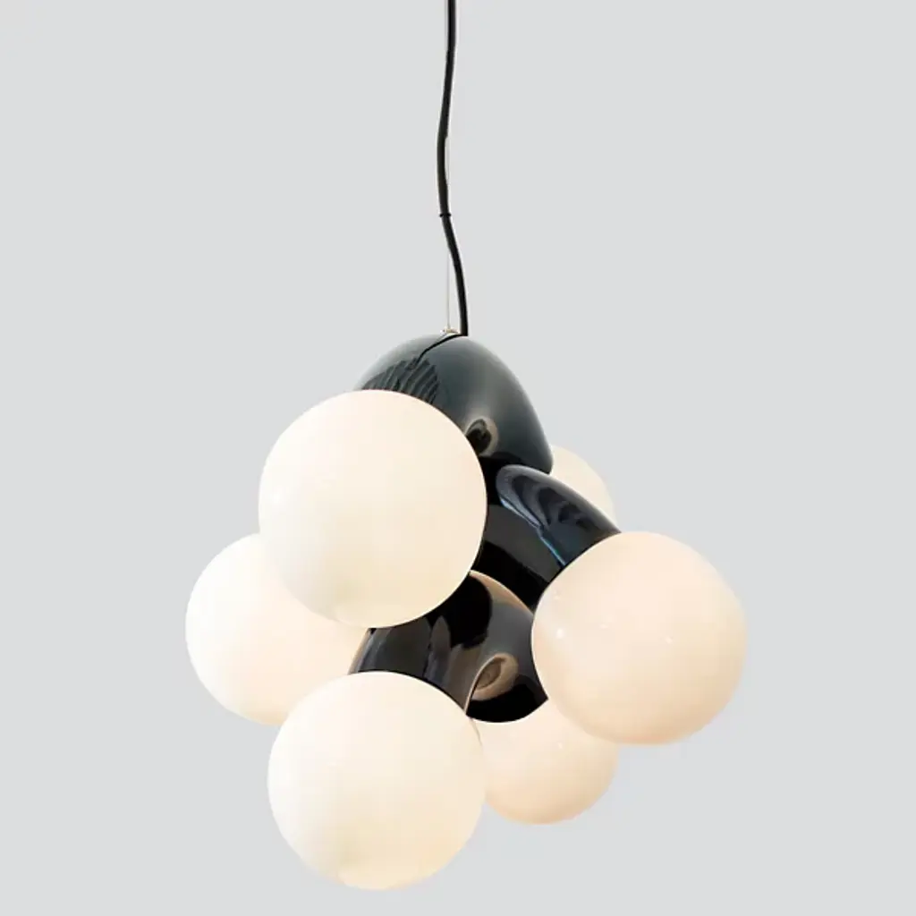 Adding to a growing galaxy of illumination, the Stellar Grape Pendant lamp appears as if a constellation of stars has fallen to earth. A frosted acetate finish, delicately adding just the right glow to your interior, softens each textured blown glass globe. Brought together by a black powder coated steel frame, this suspended family will leave you star gazing.Each piece is created from handblown glass with a frosted acetate finish to one side. Bubbles, streaks and other variations in size and colour are part of the production process. The stand and base are produced from black powder coated steel.