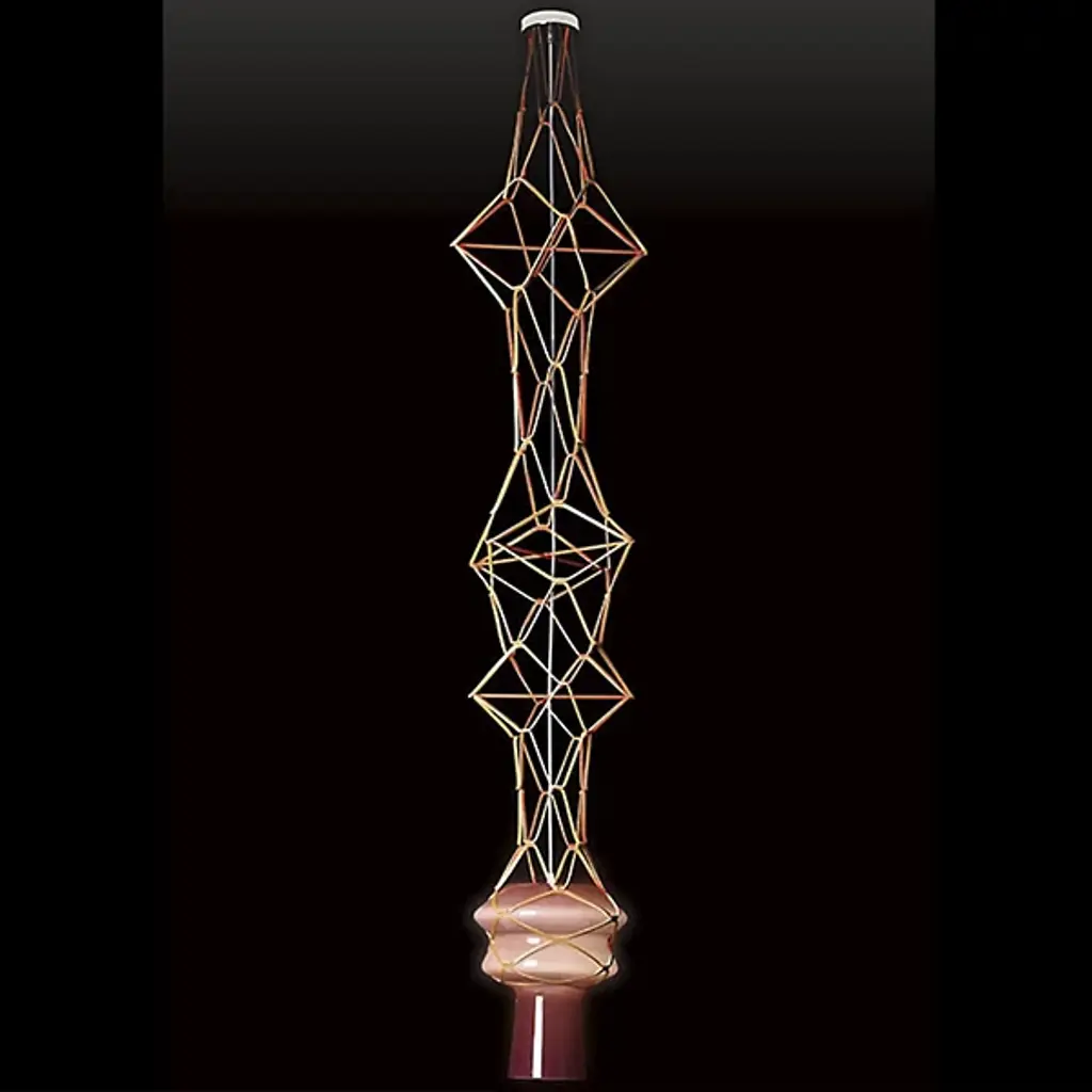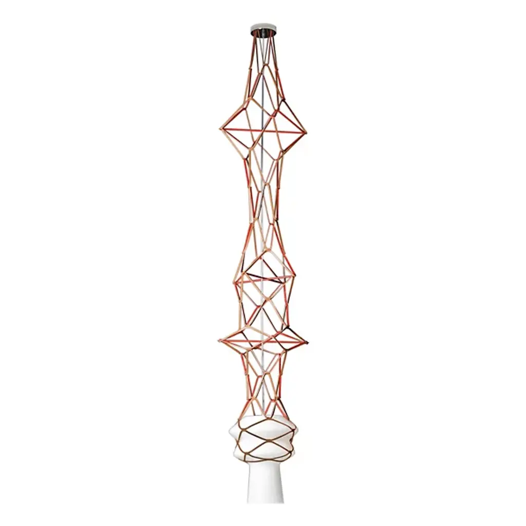 The Stelle Filanti Pendant from Venini is designed by Atelier Oi. This pendant beautifully marries metal and leather, creating a lovely amalgamation that reflects the craftsmanship behind its design. The shade, made from fine glass, nicely tempers the light from an LED. With a standard dimmer, Stelle lets you adjust the lighting to set the ambiance as you desire. Meticulously made in Italy, Stelle embodies the legacy of Italian craftsmanship and design. The pendant's framework forms gorgeous star-like silhouettes that naturally draw your attention.