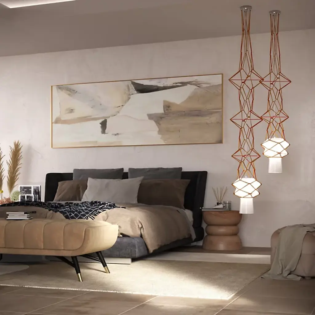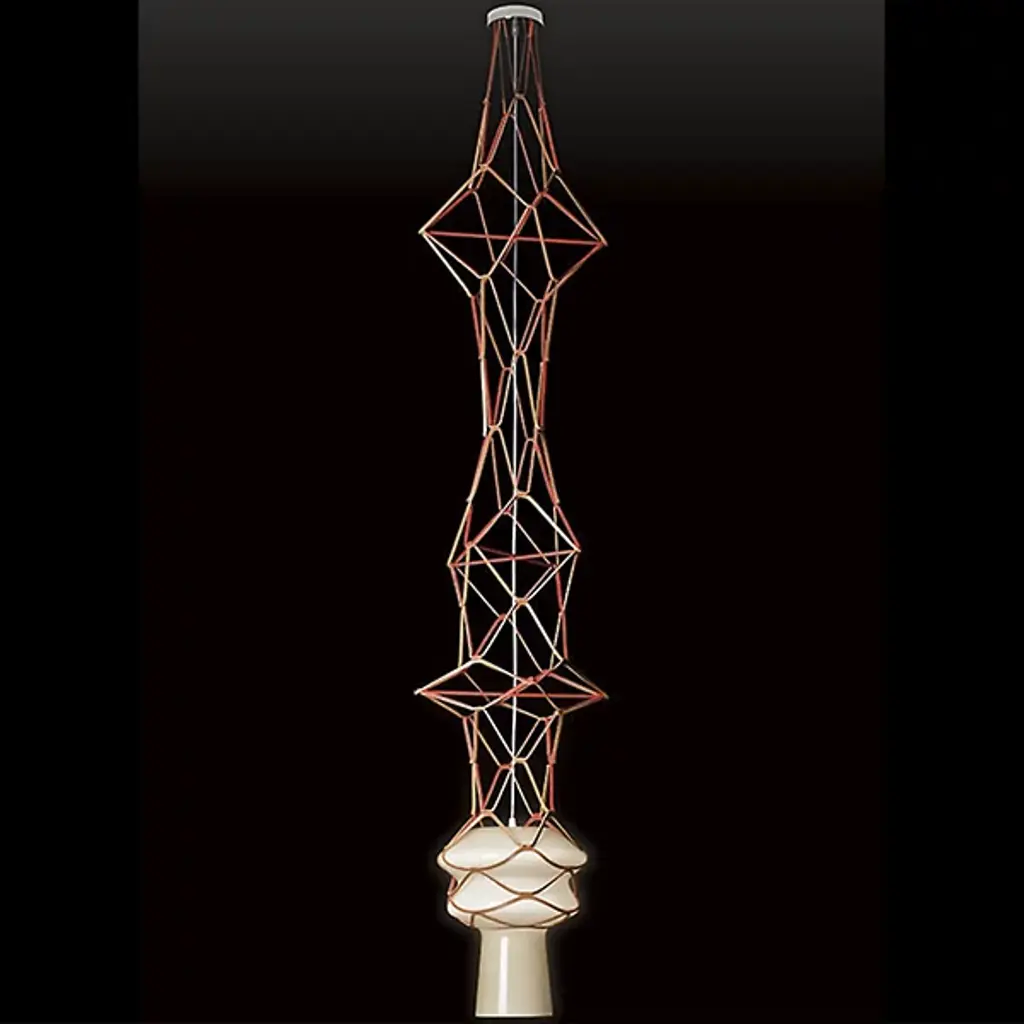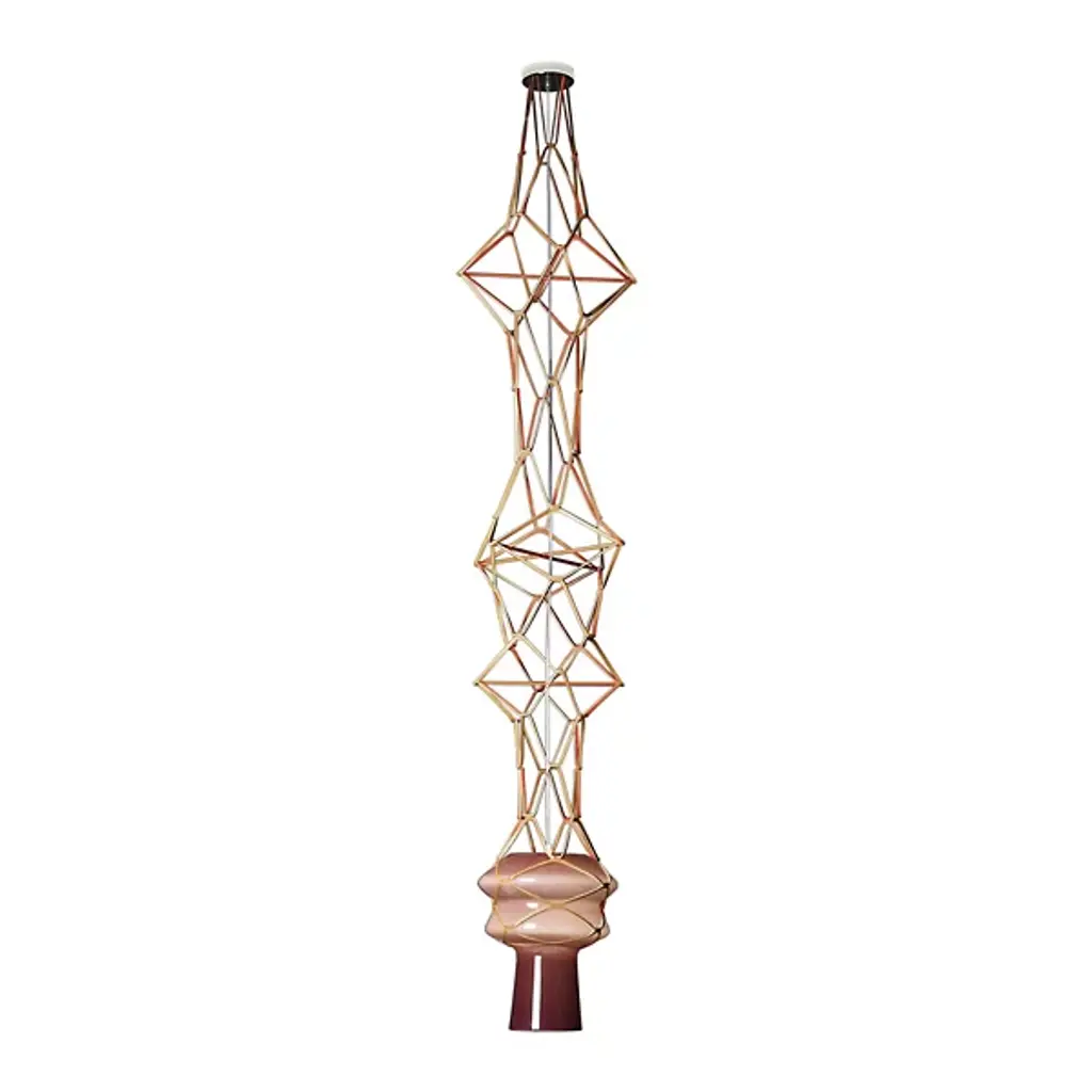 The Stelle Filanti Pendant from Venini is designed by Atelier Oi. This pendant beautifully marries metal and leather, creating a lovely amalgamation that reflects the craftsmanship behind its design. The shade, made from fine glass, nicely tempers the light from an LED. With a standard dimmer, Stelle lets you adjust the lighting to set the ambiance as you desire. Meticulously made in Italy, Stelle embodies the legacy of Italian craftsmanship and design. The pendant's framework forms gorgeous star-like silhouettes that naturally draw your attention.