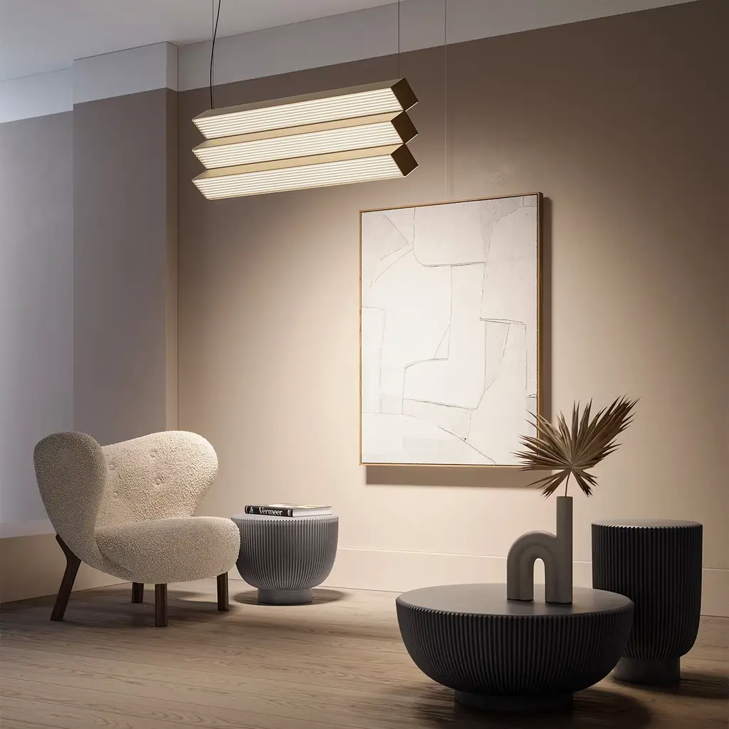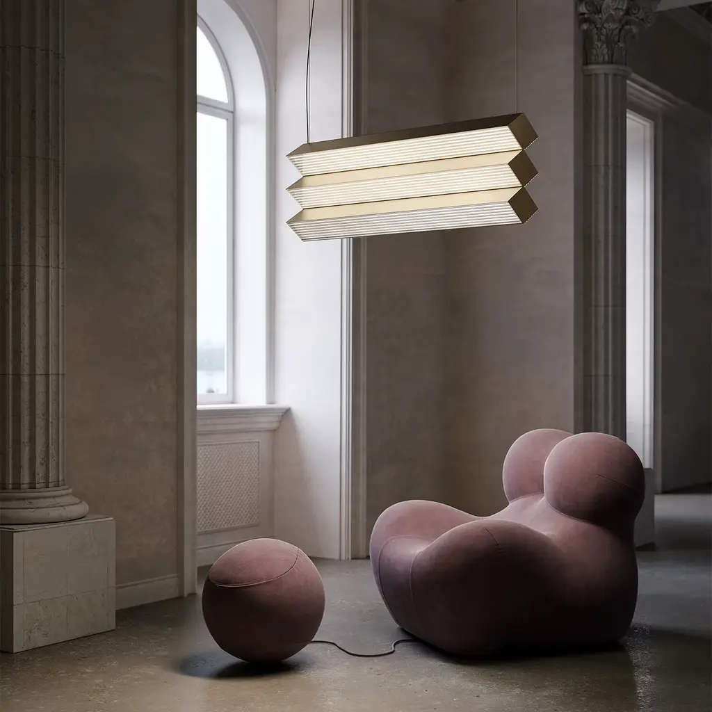 Suspended over a dining table, a desk, or a bar corner, this pendant lamp will always strike with its well-proportioned geometric volumes. Three juxtaposed elements reminiscent of sticks comprise the structure in a satin-golden nickel finish, which is matched by the bar serving as a ceiling mount. Three ridged Plexiglas elements filter the light, creating a dynamic aesthetic.
