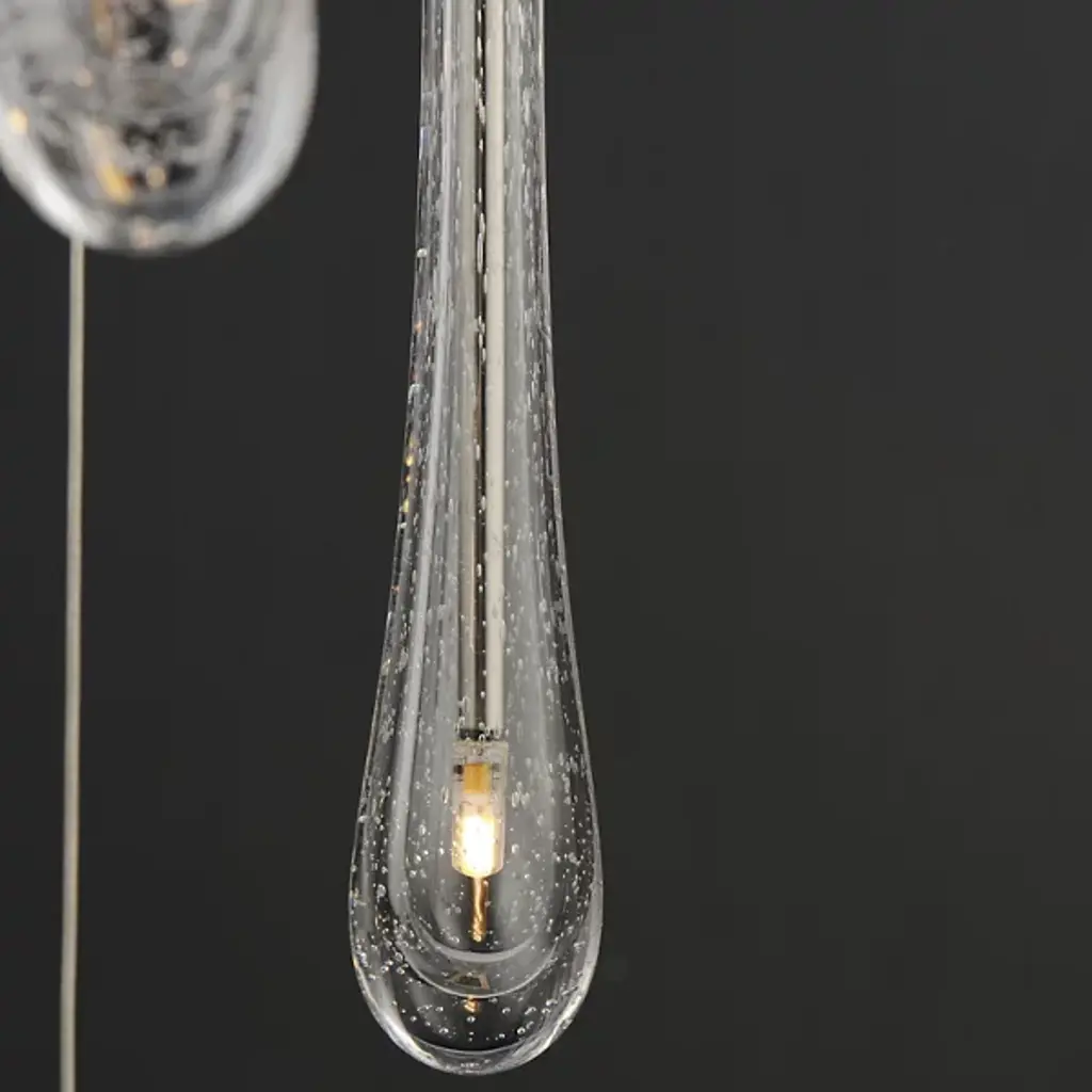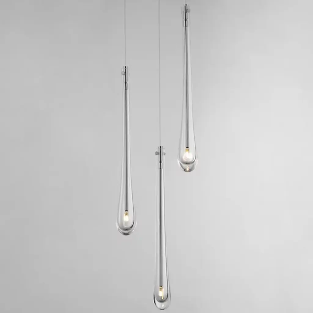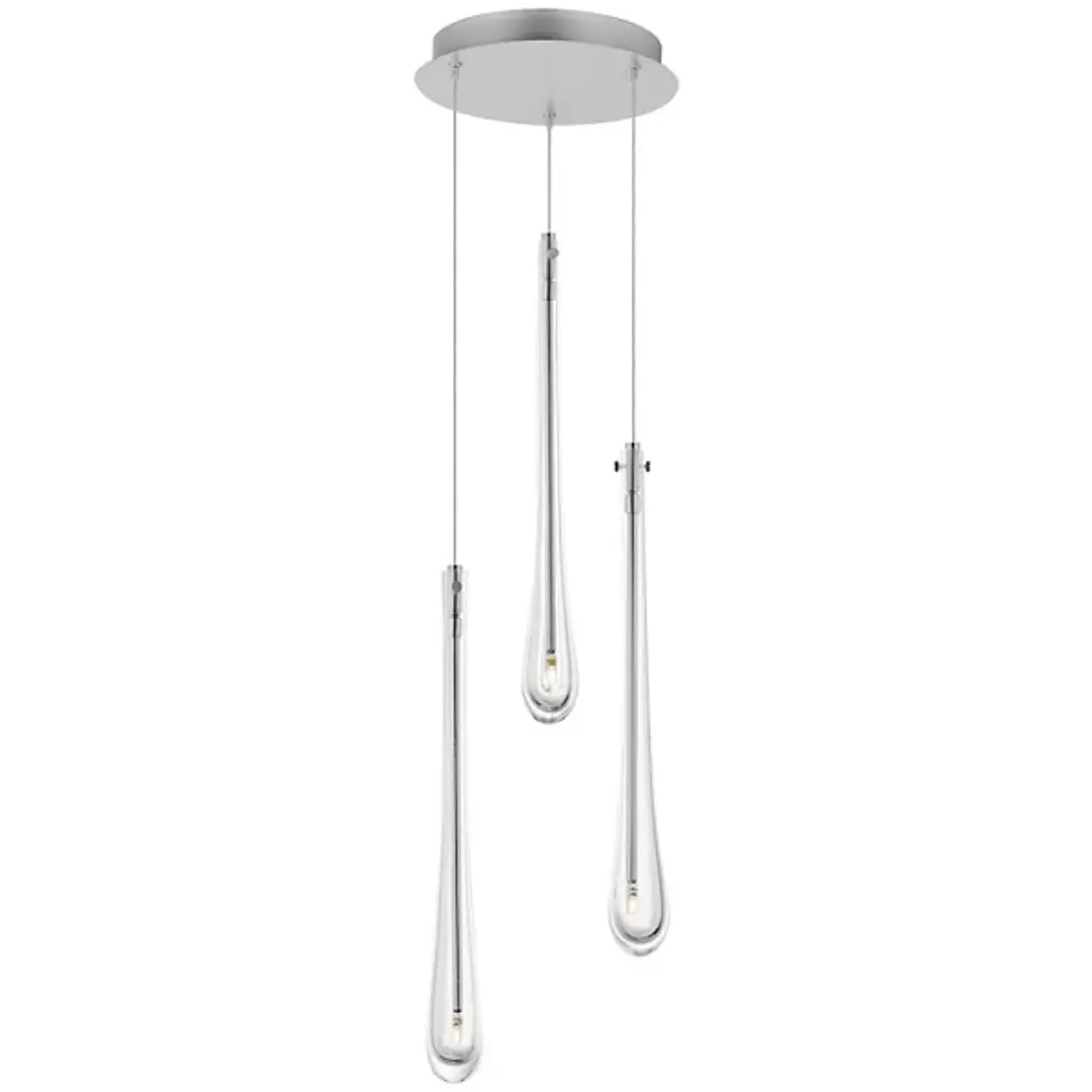 The Stillo 3-Light Pendant from ET2 Lighting showcases a classic teardrop glass shade that is elevated using substantially dense glass that is hand blown in elongated forms and curated into various color combinations. Suspended within the long, slender glass is a similarly long and slender socket to illuminate an energy-efficient LED G4 lamp at the base of the glass. The slender tube running within the glass also supports the glass with elegantly flat thumb screws in coordinating finishes.