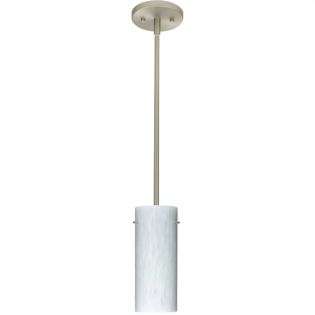 Stilo 10 is a classic open-ended cylinder of handcrafted glass, a shape that will stand the test of time. Our Carrera glass is a classic yet modern décor that gives off a soft white light. Clear molten glass is rolled in alabaster powder like frit, and then blown into shape with a semi-clear frosted white inner finish. This décor is created by rolling molten glass in small bits of white called frit. The smooth satin finish on the clear outer layer is a result of an extensive etching process. This blown glass is handcrafted by a skilled artisan, utilizing century-old techniques passed down from generation to generation. Each piece of this décor has its own artistic nature that can be individually appreciated. The stem pendant fixture is equipped with an adjustable telescoping section, 4 connectable stem sections (3", 6", 12", and 18") and low Profile flat monopoint canopy. These stylish and functional luminaries are offered in a beautiful Satin Nickel finish.
