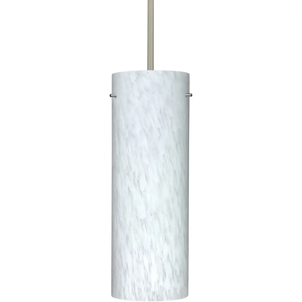 Stilo 16 is a classic open-ended cylinder of handcrafted glass, a shape that will stand the test of time. Our Carrera glass is a classic yet modern décor that gives off a soft white light. Clear molten glass is rolled in alabaster powder like frit, and then blown into shape with a semi-clear frosted white inner finish. This décor is created by rolling molten glass in small bits of white called frit. The smooth satin finish on the clear outer layer is a result of an extensive etching process. This blown glass is handcrafted by a skilled artisan, utilizing century-old techniques passed down from generation to generation. Each piece of this décor has its own artistic nature that can be individually appreciated. The cable pendant fixture is equipped with a 10' silver aircraft cable and AWM cordset, and a dome monopoint canopy. These stylish and functional luminaries are offered in a beautiful Satin Nickel finish.