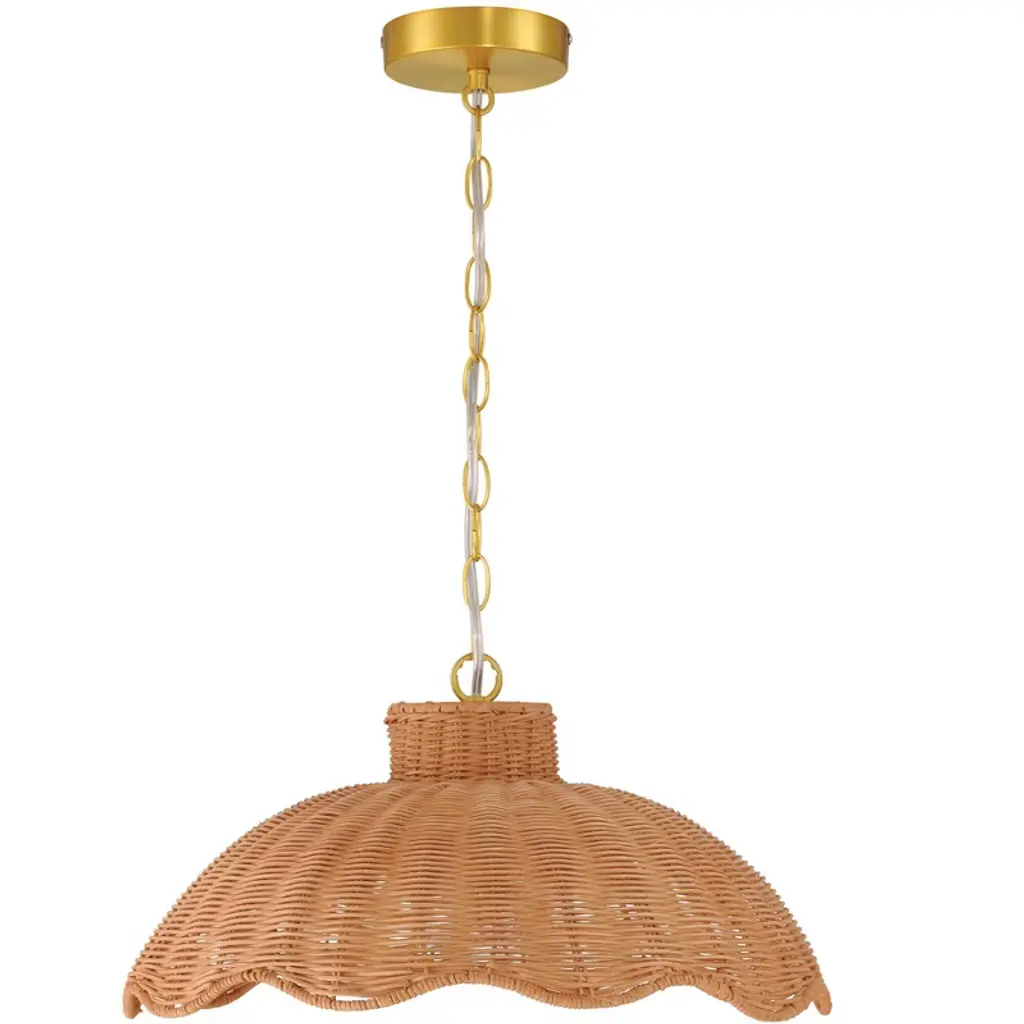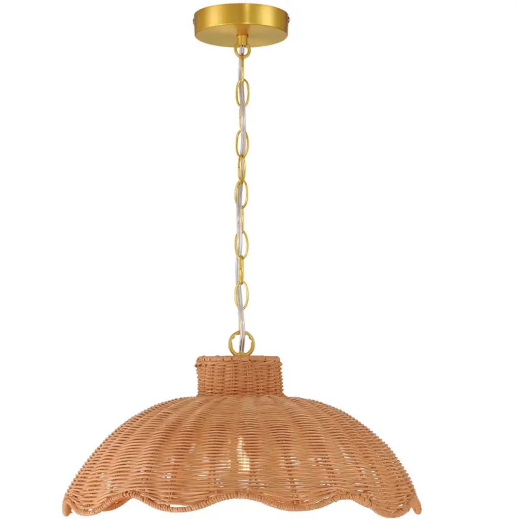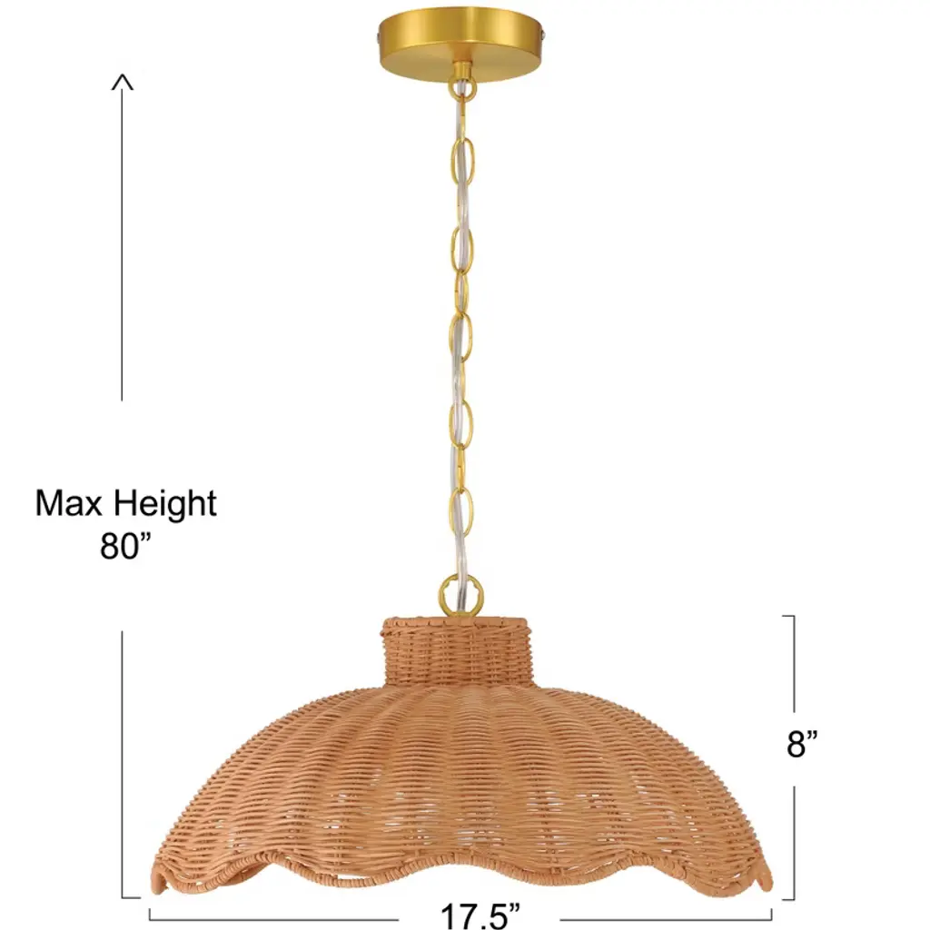 This Small Pendant Light is a celebration of artisanal craftsmanship, featuring a scalloped dome shade made from intricately woven natural rattan. It's designed to be hardwired with a 120V switch and comes with a generous 72-inch lighting chain for easy installation. The light requires a single E26 bulb, with a 60-watt rating recommended to create the perfect ambiance. Measuring 17.5 inches across and 8 inches high, it makes a statement in any room while maintaining an air of understated elegance. Its natural materials and design make it a fitting addition to spaces that cherish a Bohemian, coastal, or rustic farmhouse aesthetic. It includes a 72-inch lighting chain for easy installation, allowing for flexibility in placement within a room. The rattan material adds a touch of warmth and texture to any space, making it a versatile lighting option for the home.