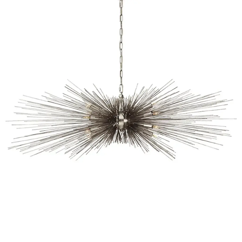A vibrant array of bursting opulence. The Strada Linear Pendant by Visual Comfort Signature, formerly known as Visual Comfort, showcases an eye-catching aesthetic reminiscent of a glowing star. Its striking quills radiate an ethereal flair and cast a mesmerizing shadow display as light emits. Complete with a chain-link cord and available in various finishes, this pendant will become an instant centerpiece of any room it's placed in.