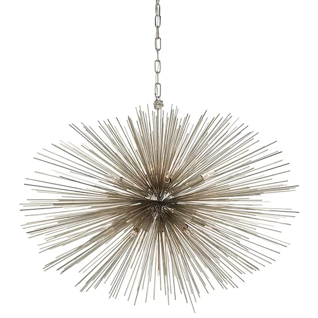 The Strada Oval Pendant by Visual Comfort Signature, formerly known as Visual Comfort, brings a mid-century modern flair to your living space, featuring an array of thin metal rods that extend from a central spherical hub. Exposed lamping hides within the partially transparent structure which gives its warm radiance a decorative, glistening quality. An ideal statement-making piece for wide open spaces such as entryways, dining rooms, and living rooms.