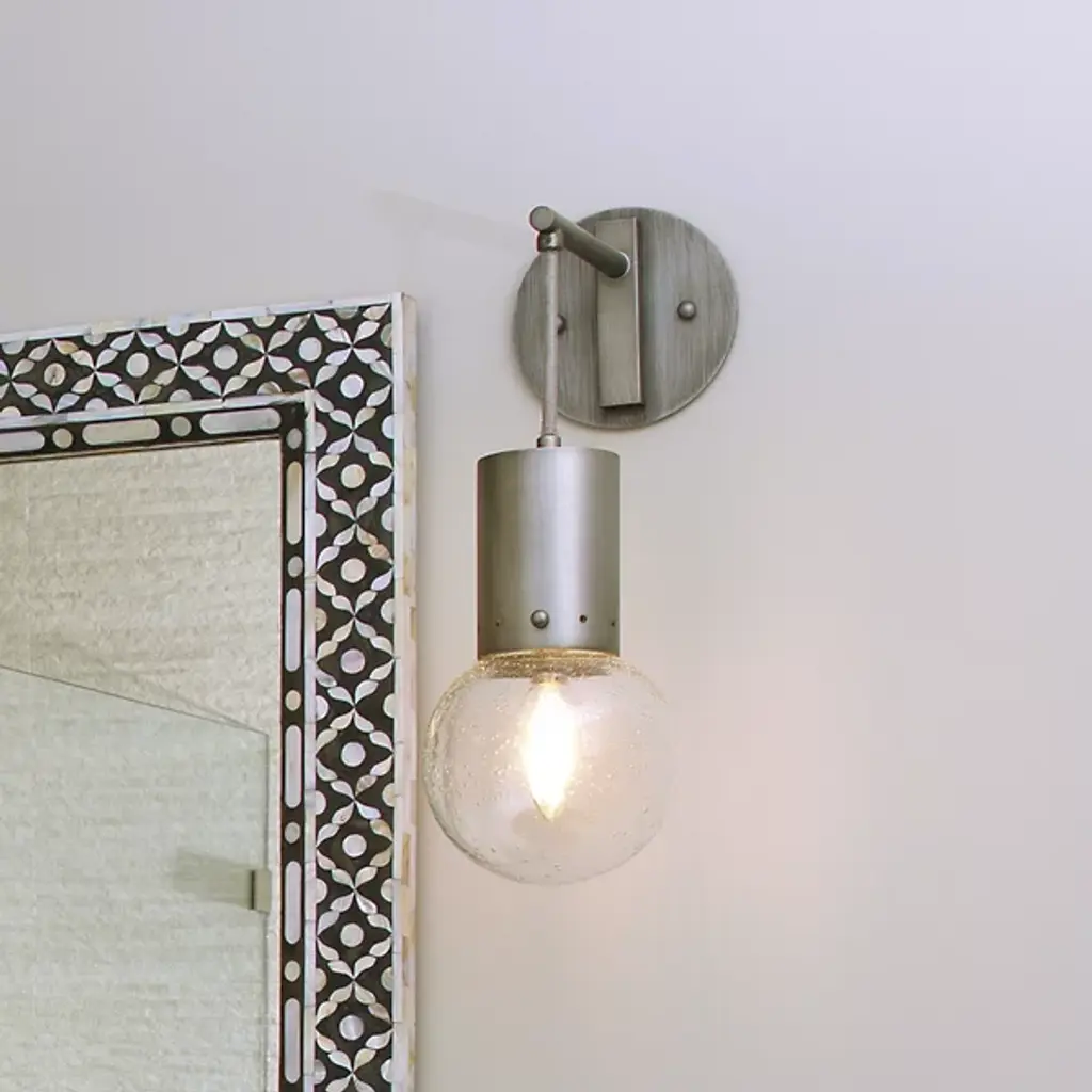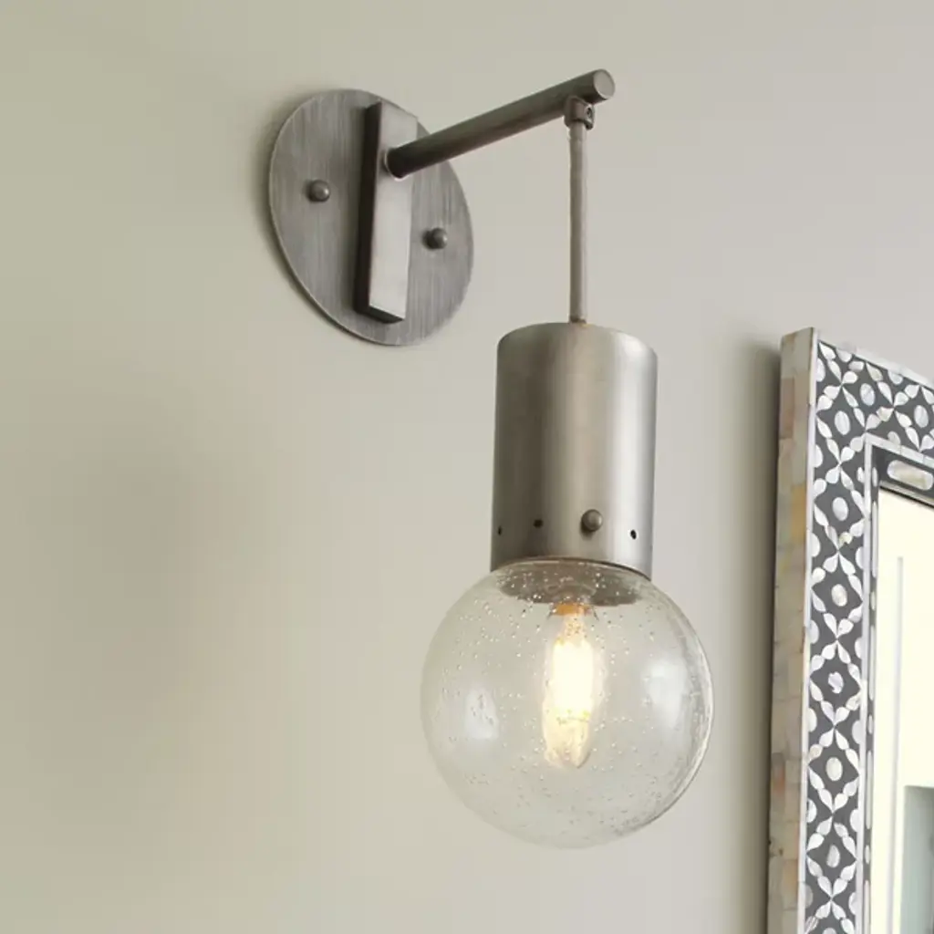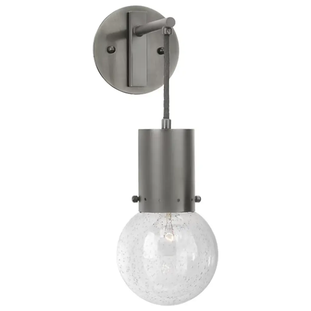 Timeless elegance. The Strada Pendant Wall Sconce by Jamie Young Co. exudes sophisticated style and relaxing luminosity. An exposed clear seeded glass bulb suspends from a steel arm and base to deliver a strong yet comforting illumination, while more than one finish choice allows you to match to what best suits your design scheme's established color layout. Place this sconce in a hallway and create an intimate atmosphere.