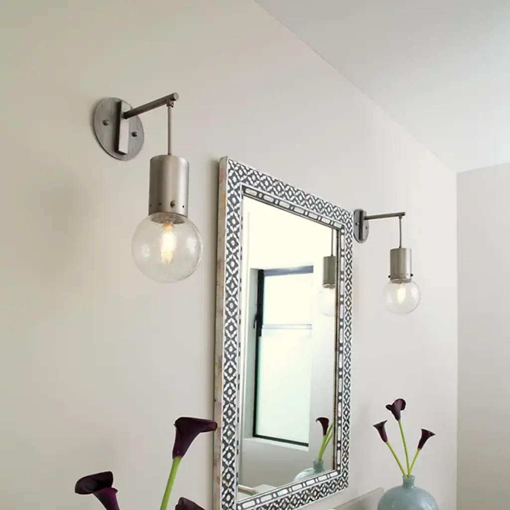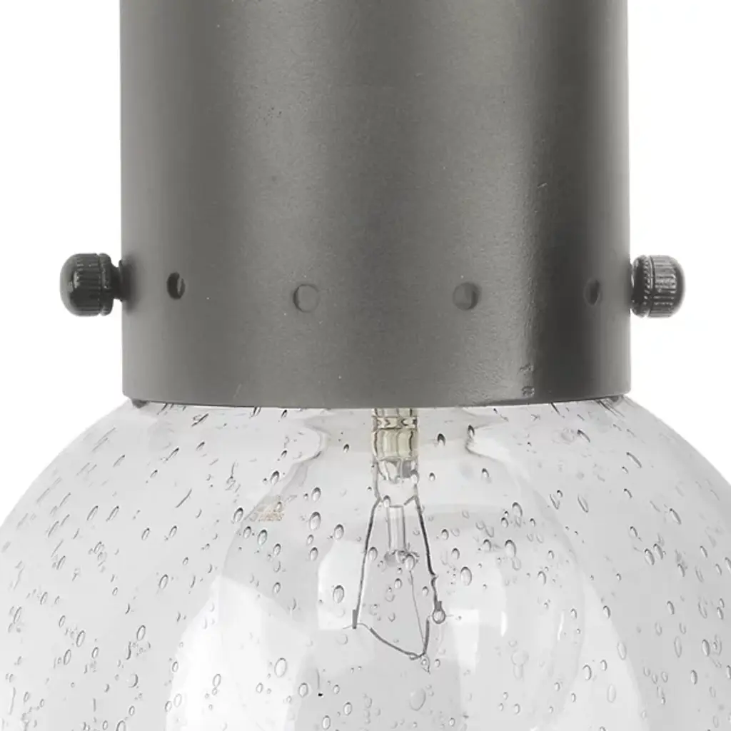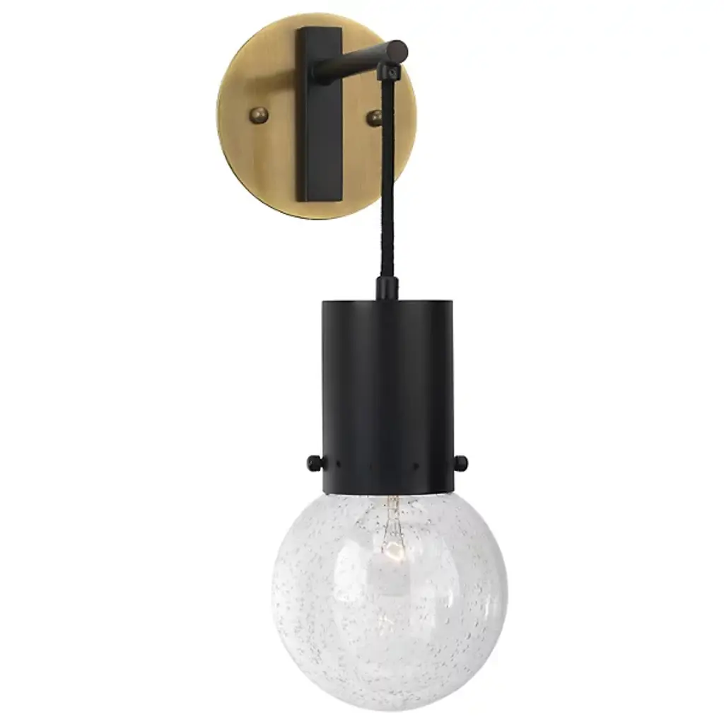 Timeless elegance. The Strada Pendant Wall Sconce by Jamie Young Co. exudes sophisticated style and relaxing luminosity. An exposed clear seeded glass bulb suspends from a steel arm and base to deliver a strong yet comforting illumination, while more than one finish choice allows you to match to what best suits your design scheme's established color layout. Place this sconce in a hallway and create an intimate atmosphere.