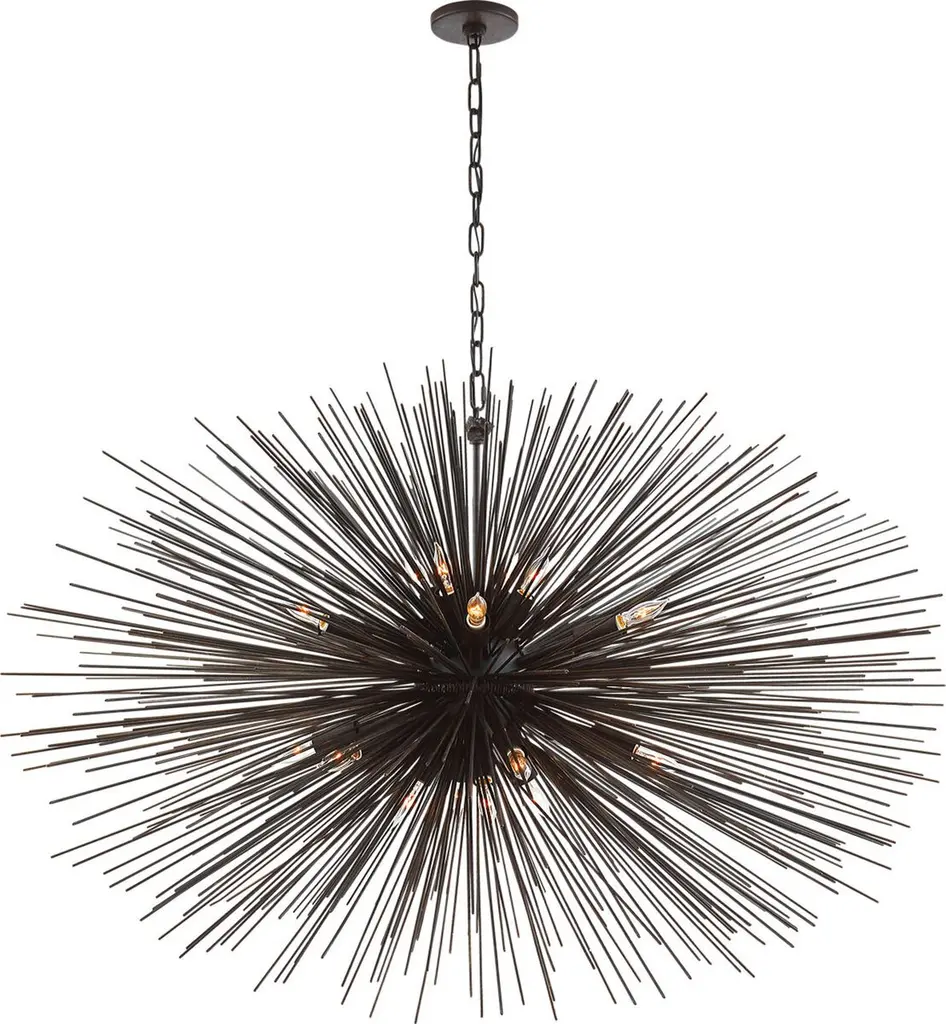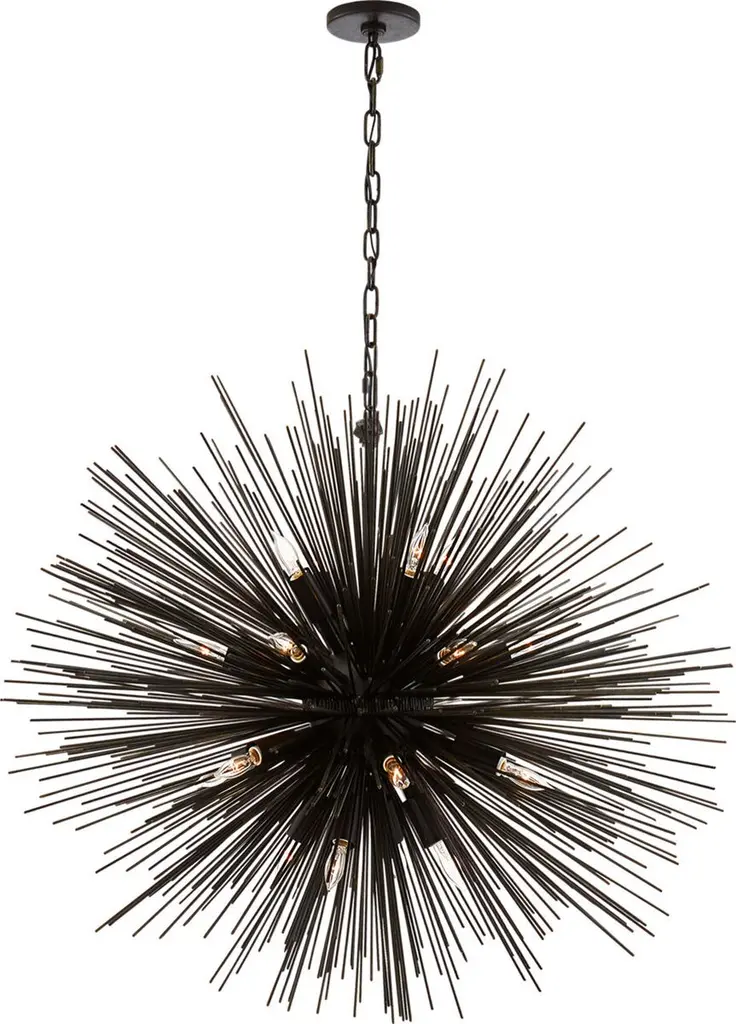 The Strada Round Pendant by Visual Comfort Signature, formerly known as Visual Comfort, will be the star of your living space with its audacious display of thin metal rods that practically burst from a central spherical hub. Lighting is provided by exposed tungsten Edison bulbs, creating a unique shimmering effect as your perspective changes. Works well for functional and decorative lighting in both contemporary and mid-century modern settings.