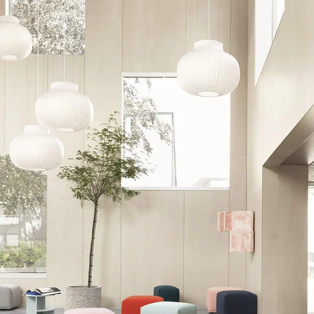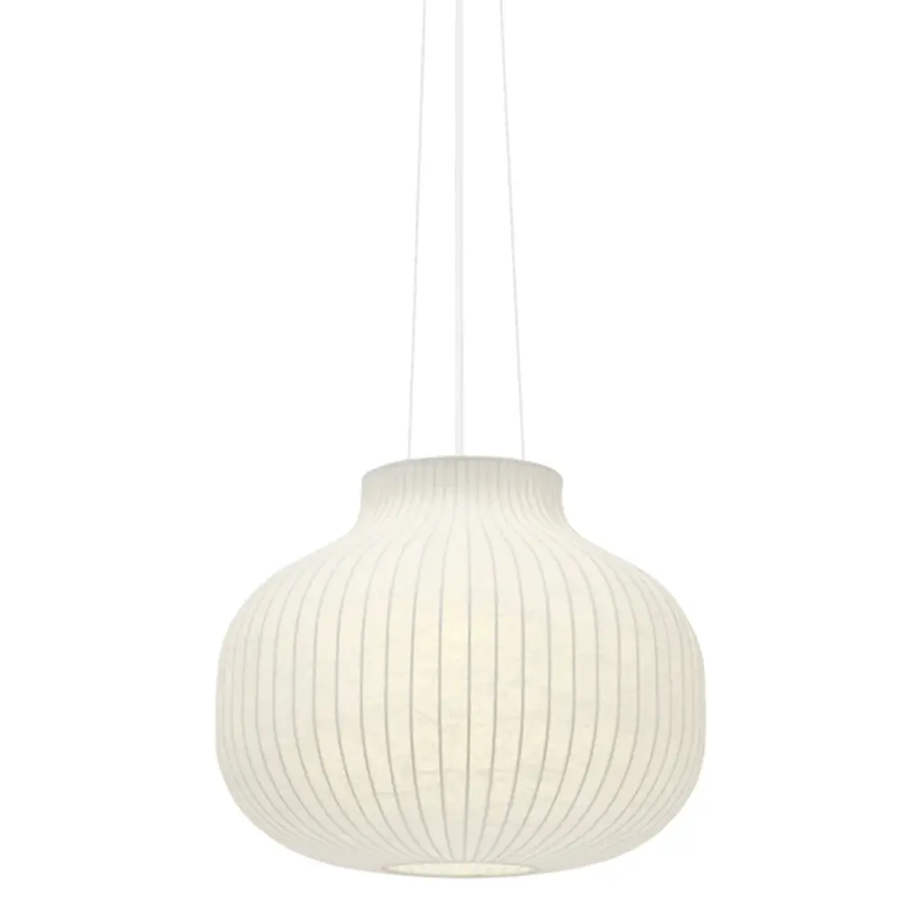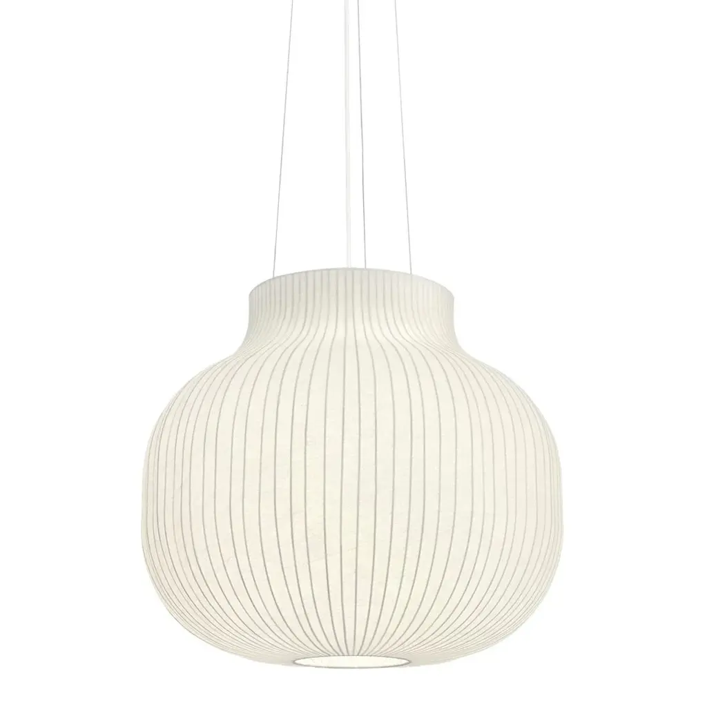 "The Strand Pendant Lamp is formed from a sprayed cocoon material with its cloud-like appearance that tightly clings to a spinning steel frame. It consists of tiny strands for a complex, intriguing structure that shrouds the light source while acting as its diffuser. With its see-through expression, the cocoon material allows for the Strand Pendant Lamp to filter light for a warm, comfortable glow. Designed in various sizes and shapes, the Strand Pendant Lamp hovers lightly in space, bringing comfort, harmony and a refined sensitivity into any room." - Benjamin Hubert, Designer Being the first-ever design by renown British designer Benjamin Hubert for Muuto, the Strand Pendant Lamp is designed with soft, playful forms for a modern expression. Made from a sprayed cocoon material with a cloud-like appearance, tightly clinging to a spinning steel frame, the design's silhouette presents a complex, intriguing structure and a new perspective on the traditional pendant lamp. With its see-through expression, the cocoon material allows for the Strand Pendant Lamp to filter light through for a warm, comfortable glow with its tiny strands shrouding the light source, while simultaneously acting as its diffuser. The wire structure of the pendant's frame becomes even more visible when the light source is on, enhancing the graphic expression of the design. Designed in various sizes and shapesthree open and two closedthe Strand Pendant Lamp provides both diffused lighting through its cocoon materials and direct lighting through its top and bottom opening, hovering lightly in space, bringing comfort, harmony and a refined sensitivity into any room. The design can be used separately or in scattered clusters and clean formations whether it be a dining area, entrance hall, lobby space or living room. Bulb Not Included