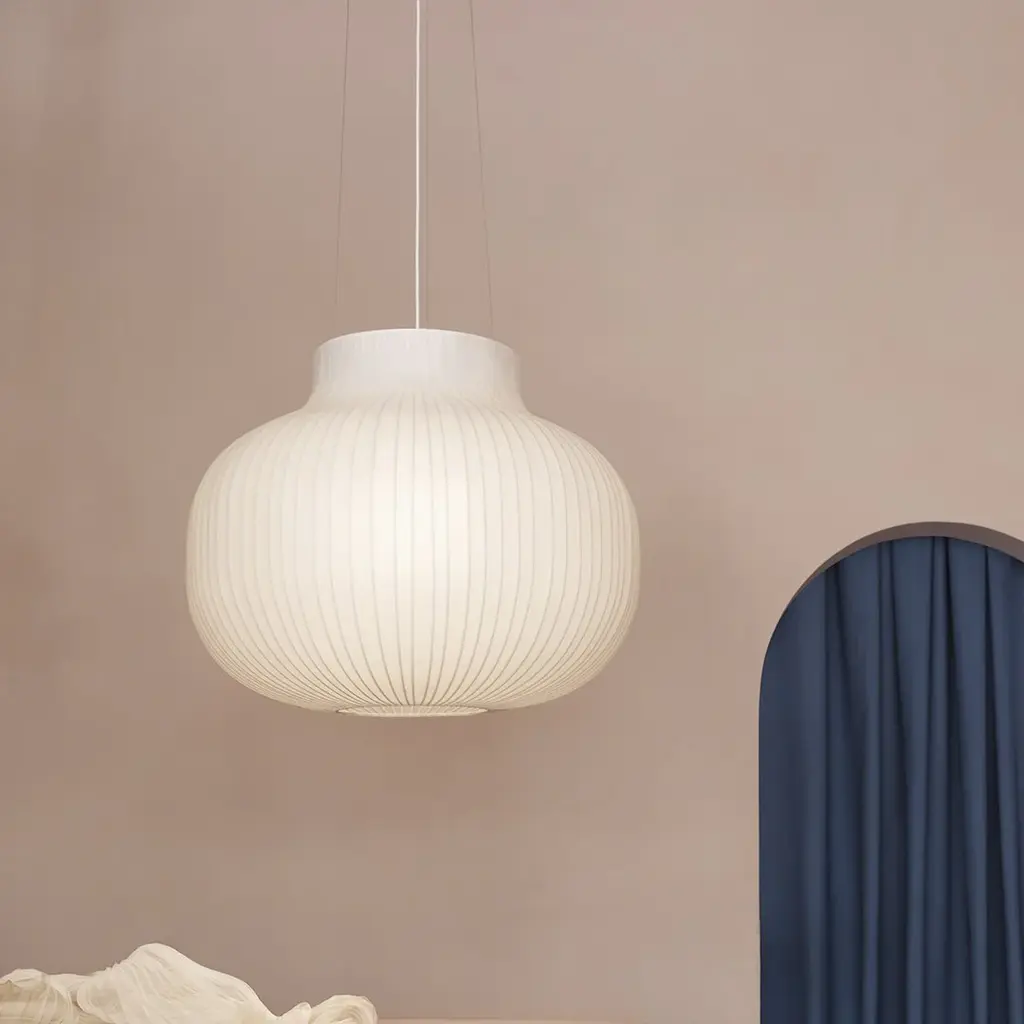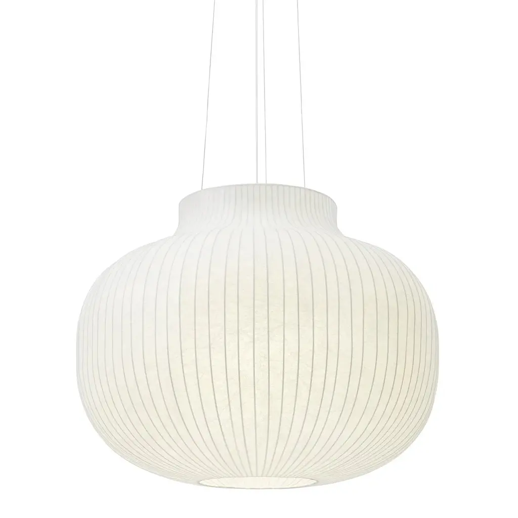 "The Strand Pendant Lamp is formed from a sprayed cocoon material with its cloud-like appearance that tightly clings to a spinning steel frame. It consists of tiny strands for a complex, intriguing structure that shrouds the light source while acting as its diffuser. With its see-through expression, the cocoon material allows for the Strand Pendant Lamp to filter light for a warm, comfortable glow. Designed in various sizes and shapes, the Strand Pendant Lamp hovers lightly in space, bringing comfort, harmony and a refined sensitivity into any room." - Benjamin Hubert, Designer Being the first-ever design by renown British designer Benjamin Hubert for Muuto, the Strand Pendant Lamp is designed with soft, playful forms for a modern expression. Made from a sprayed cocoon material with a cloud-like appearance, tightly clinging to a spinning steel frame, the design's silhouette presents a complex, intriguing structure and a new perspective on the traditional pendant lamp. With its see-through expression, the cocoon material allows for the Strand Pendant Lamp to filter light through for a warm, comfortable glow with its tiny strands shrouding the light source, while simultaneously acting as its diffuser. The wire structure of the pendant's frame becomes even more visible when the light source is on, enhancing the graphic expression of the design. Designed in various sizes and shapesthree open and two closedthe Strand Pendant Lamp provides both diffused lighting through its cocoon materials and direct lighting through its top and bottom opening, hovering lightly in space, bringing comfort, harmony and a refined sensitivity into any room. The design can be used separately or in scattered clusters and clean formations whether it be a dining area, entrance hall, lobby space or living room. Bulb Not Included