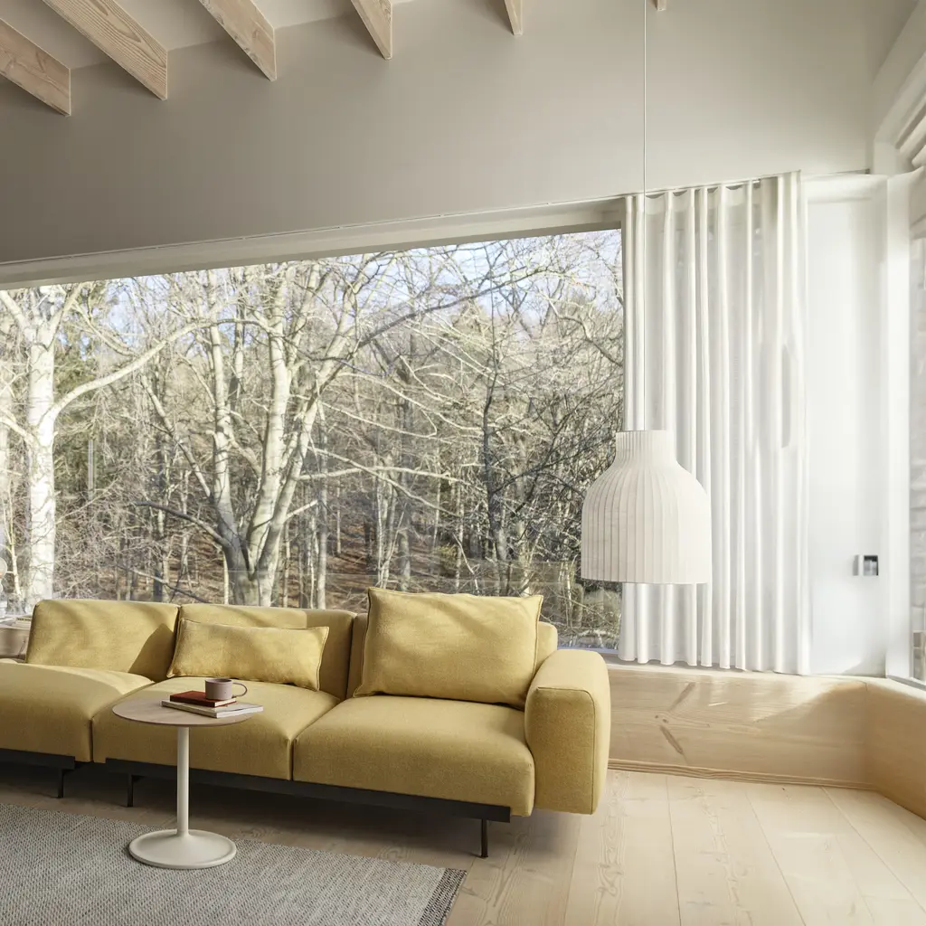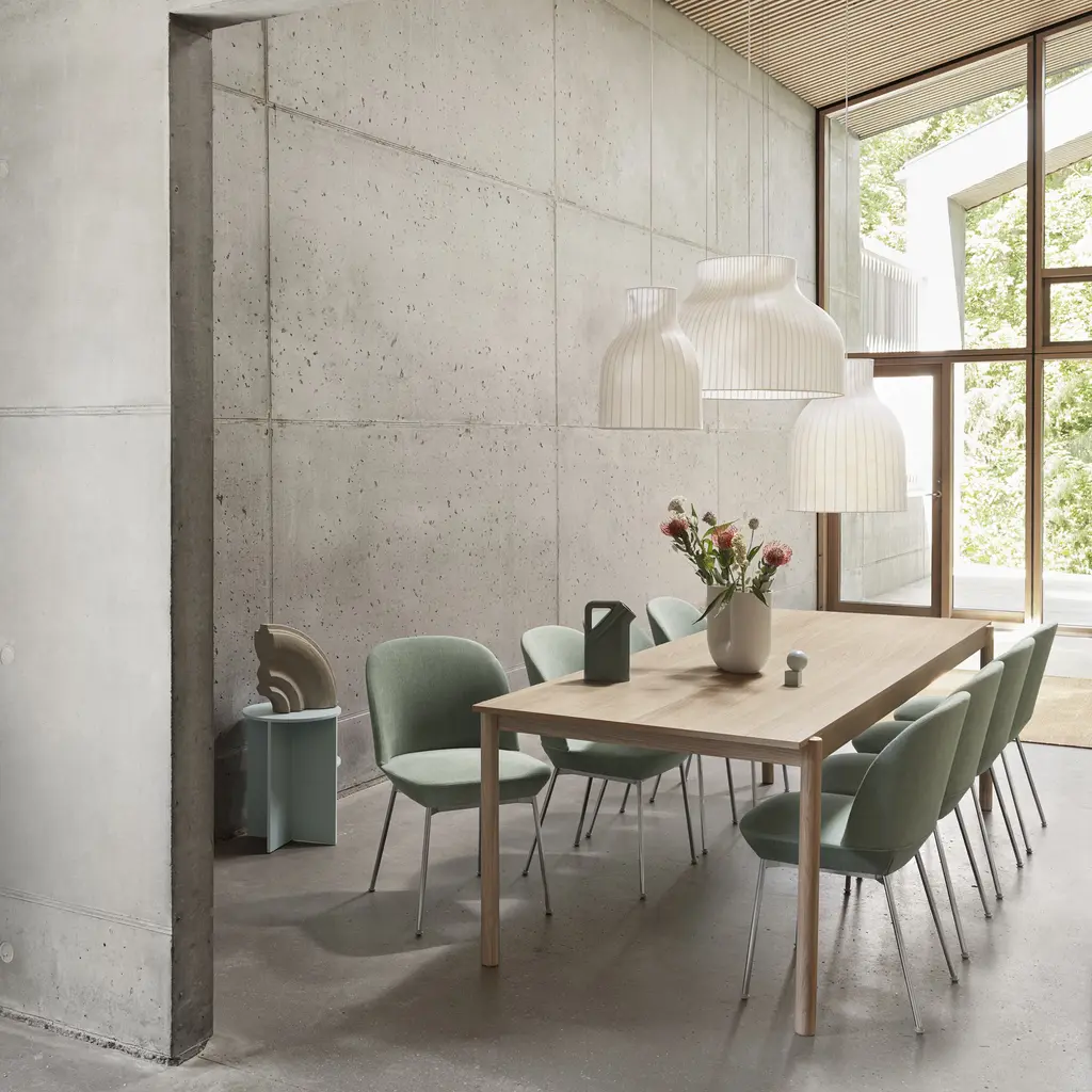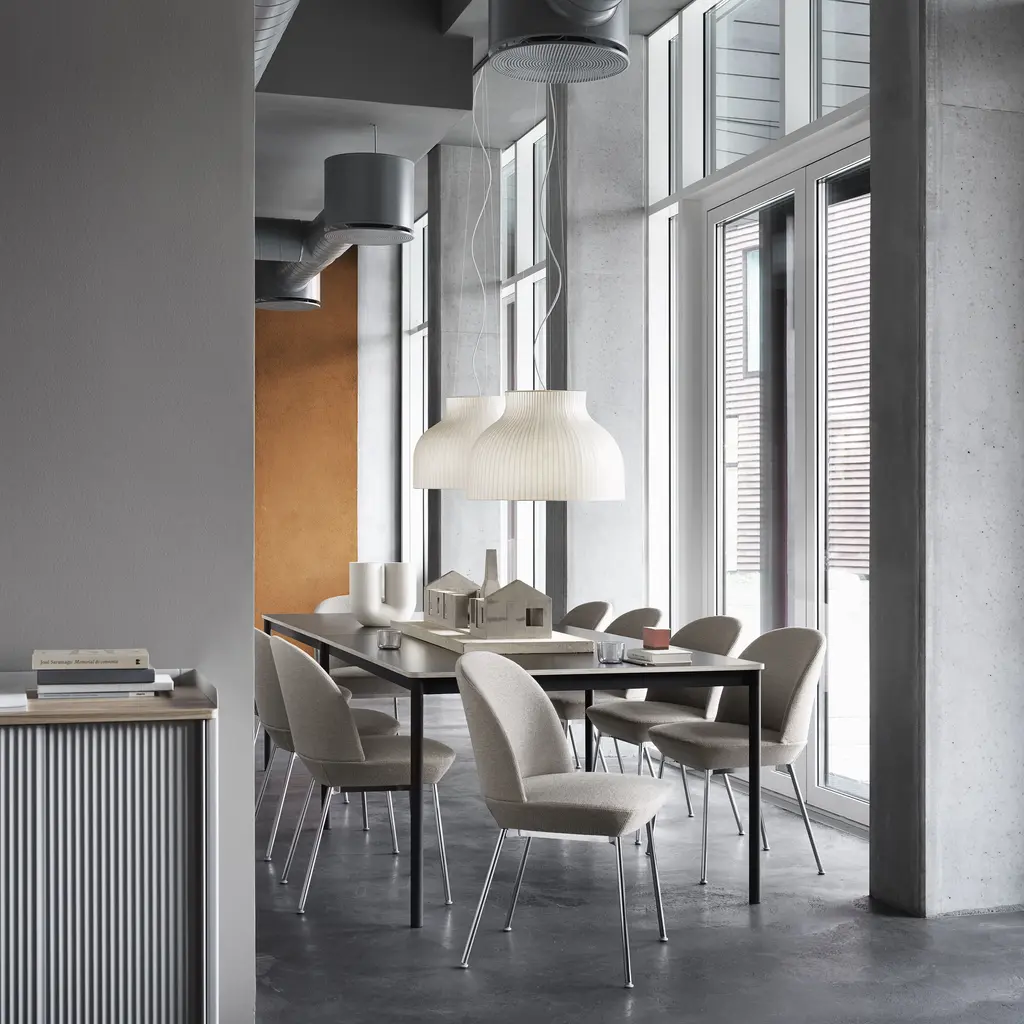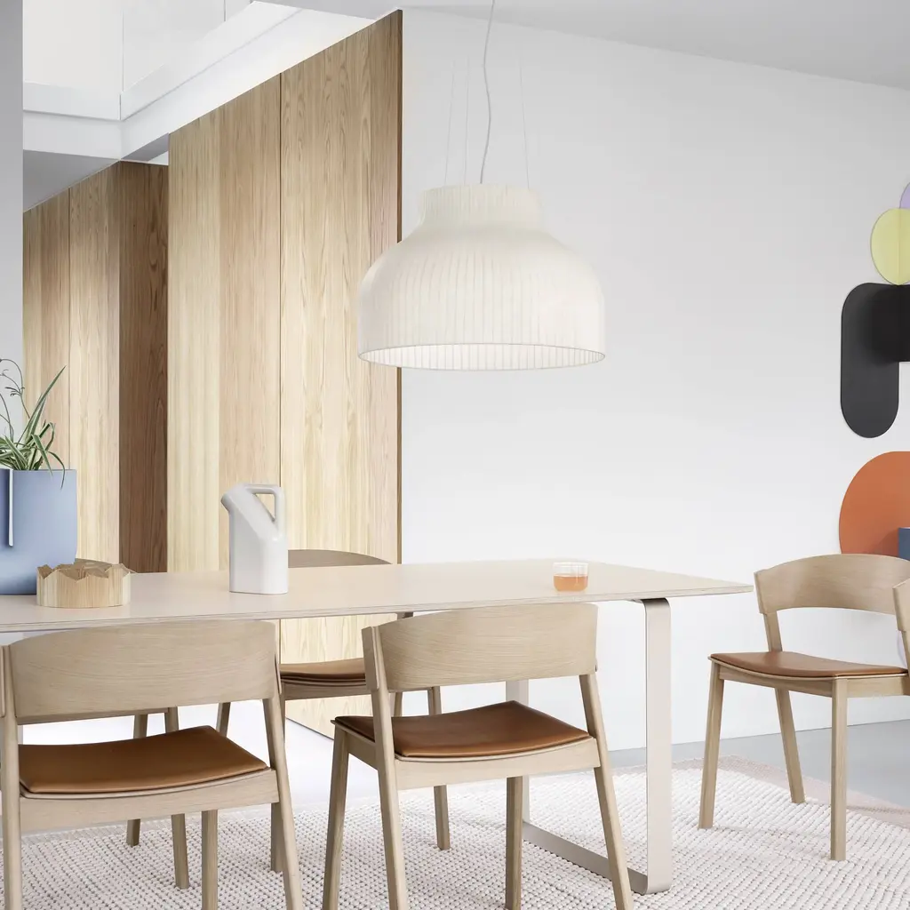 With its unique structure, Strand provides both diffused lighting and, in this variation, generous downward illumination that's especially apropos over a table. Award-winning British designer Benjamin Hubert conceives a unique pendant with a sprayed cocoon material over the pared-down steel form. The cocoon material's tiny strands coalesce into an intriguing surface while filtering the light for a warm, welcoming glow.