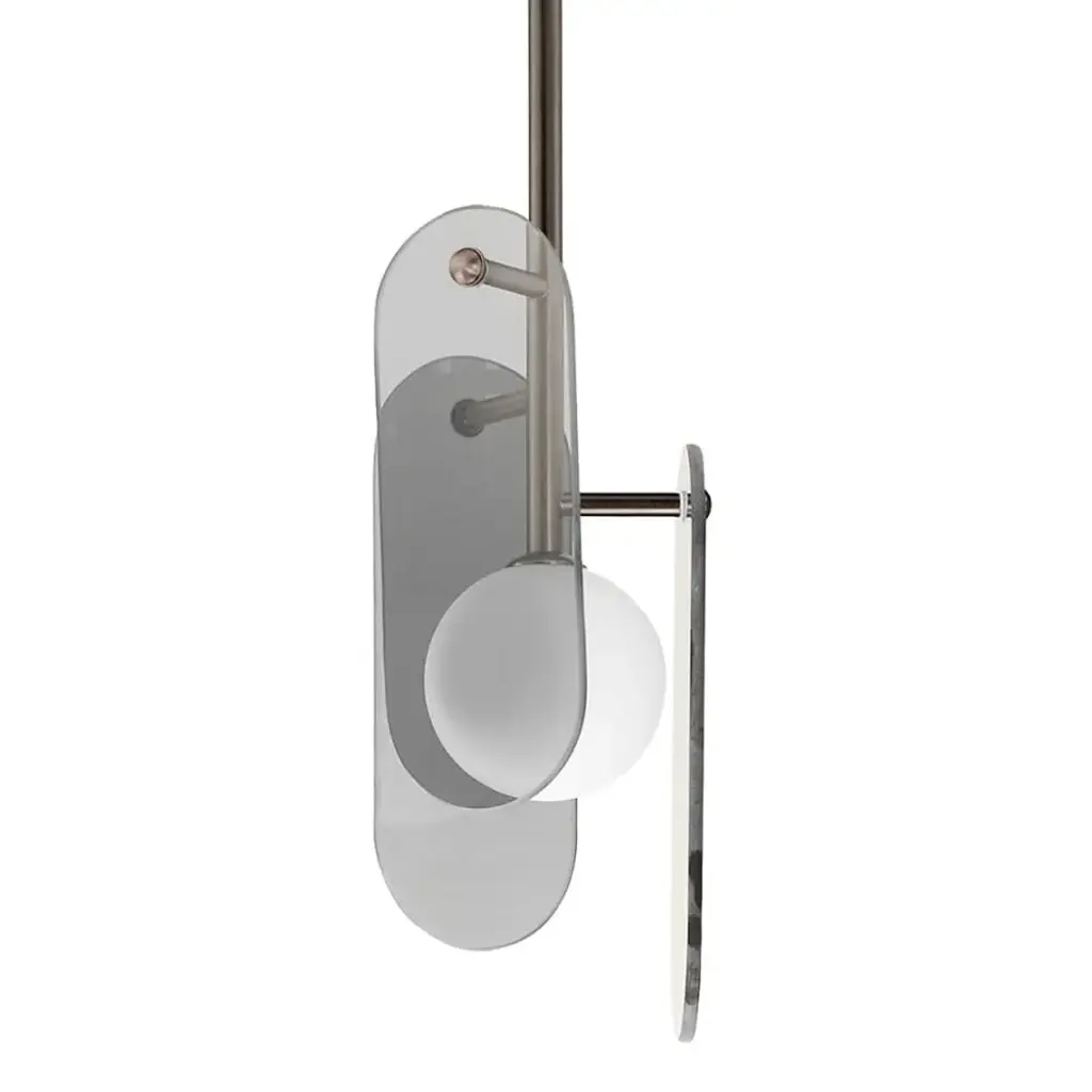 A monument to the art of glass, the Megalith collection is constructed using a robust iron stem that branches off to support various panel options. These various elliptical panels are back lit with globes of white cased glass. In this iteration of the series, various glass and stone panels are offered with retro modern appeal. With additional made-to-order configurations, this series appeals to a wide variety of applications be it suspended, or wall mounted.Features:Dimensions:Electrical Specifications: