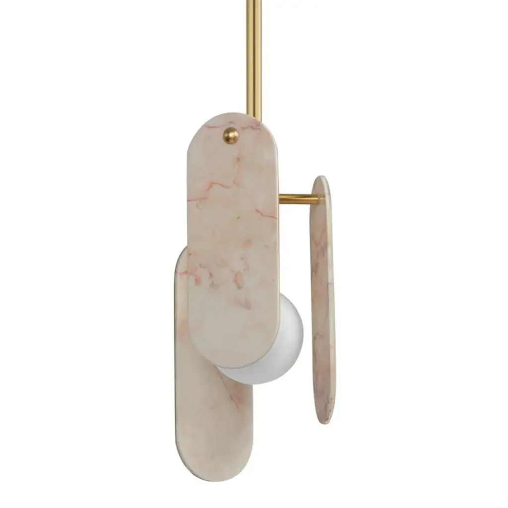 A monument to the art of glass, the Megalith collection is constructed using a robust iron stem that branches off to support various panel options. These various elliptical panels are back lit with globes of white cased glass. In this iteration of the series, various glass and stone panels are offered with retro modern appeal. With additional made-to-order configurations, this series appeals to a wide variety of applications be it suspended, or wall mounted.Features:Dimensions:Electrical Specifications:
