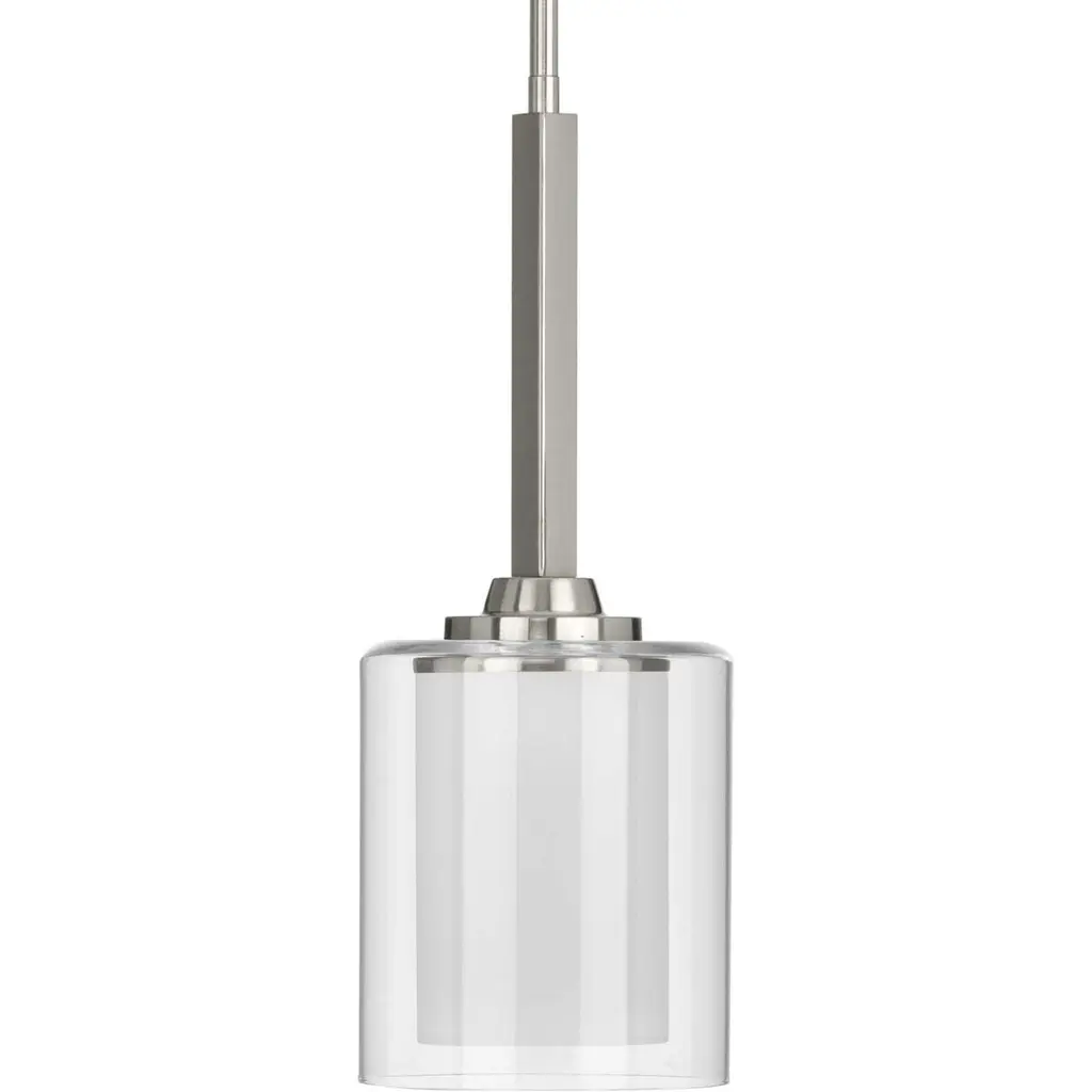Clear glass cylindrical shade rests on opal acrylic diffuser globe. Brushed plated finishes or satin coating. Down light. Custom options available.