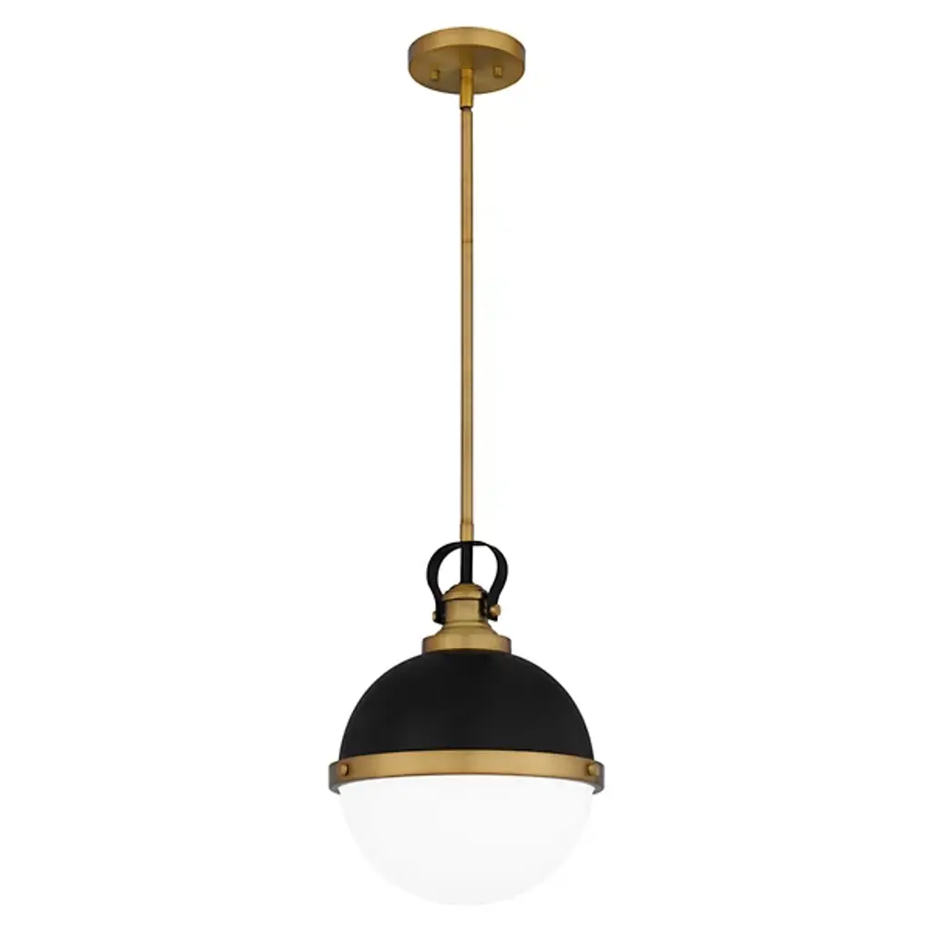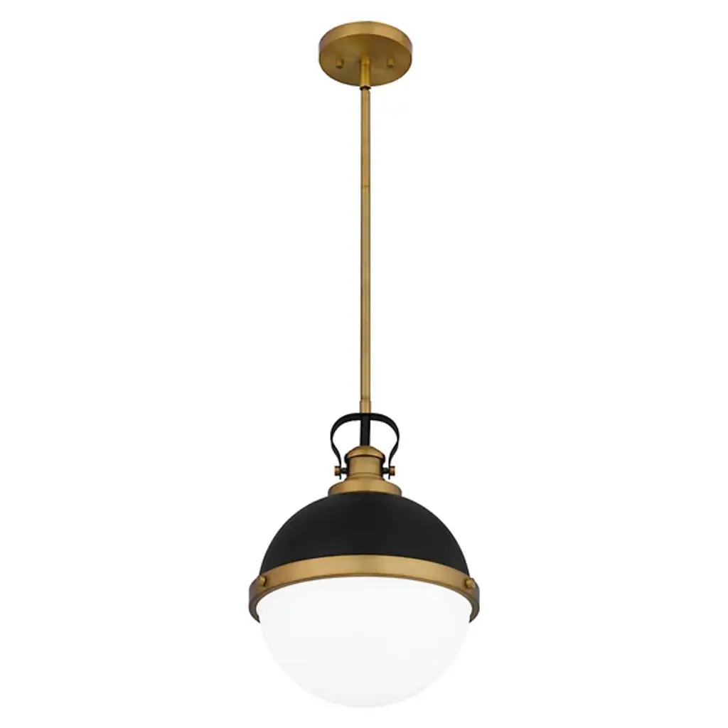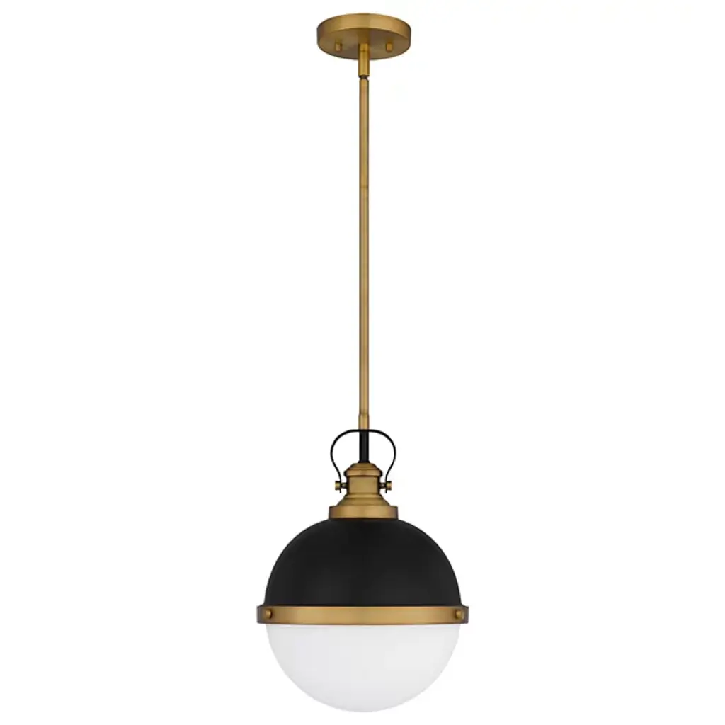 The Sullivan Pendant from Quoizel presents a stylish hemispherical shape that packs an enduring aesthetic punch with fine, artistic accents. This handsome pendant features an opal-etched glass shade paired with a matte black finish and brass trim around the upper and lower structure that lend its surroundings a vintage charm.
