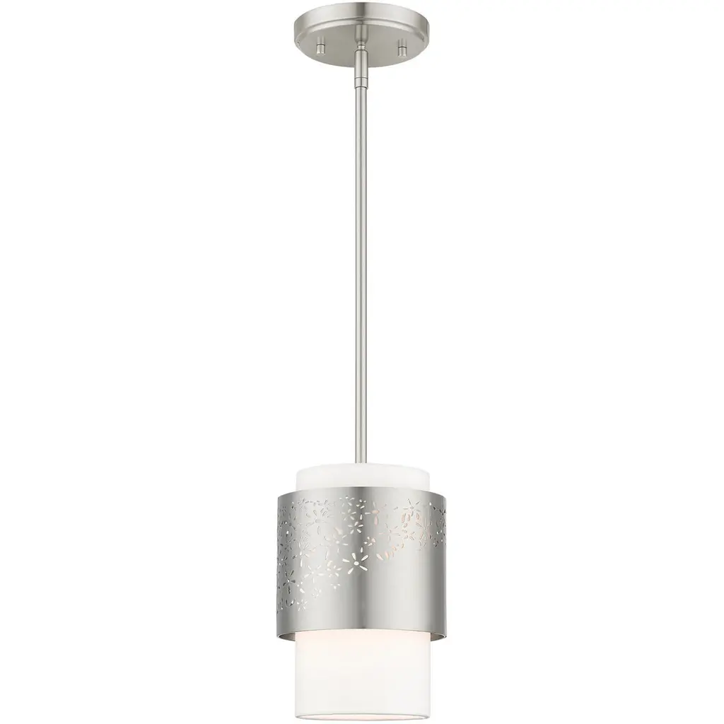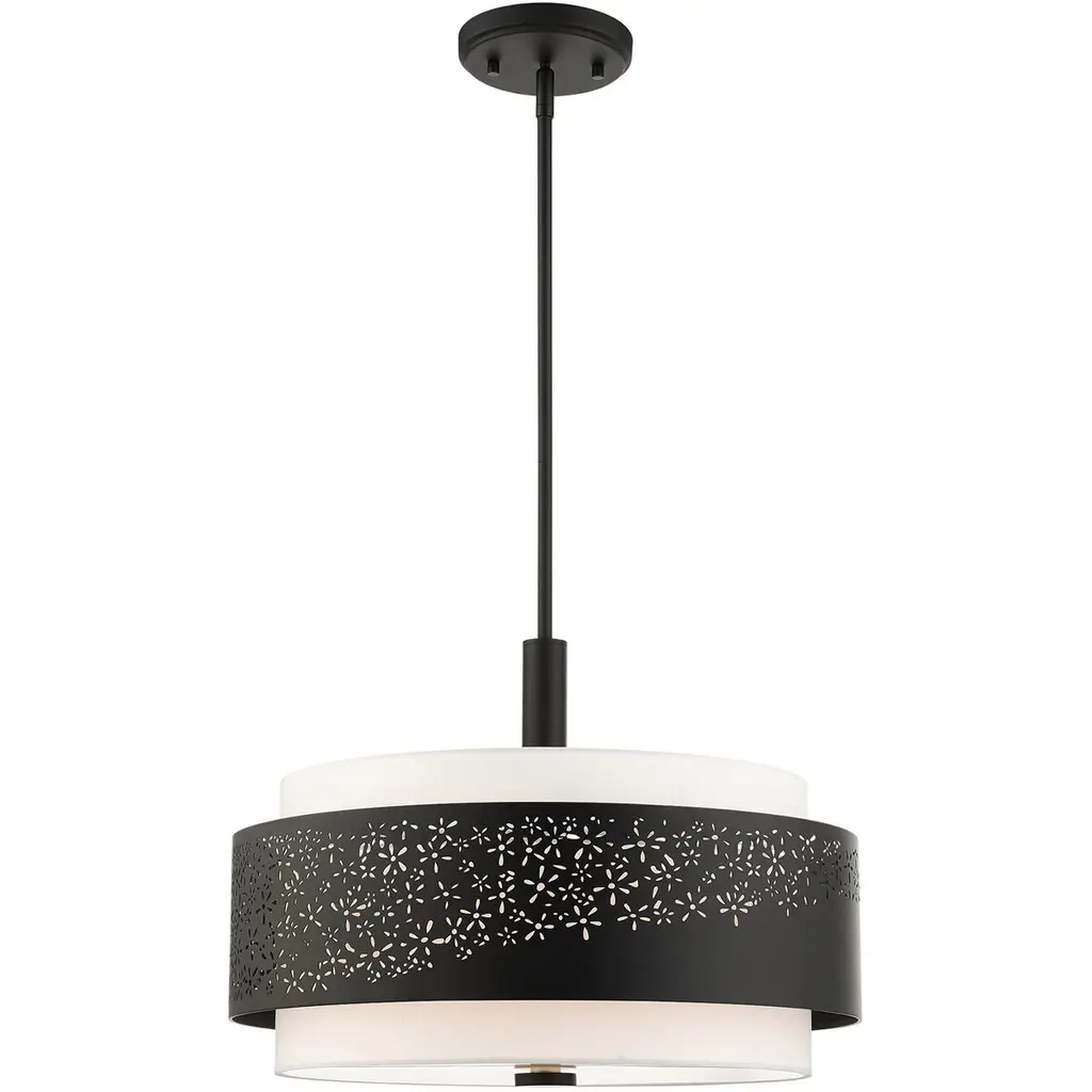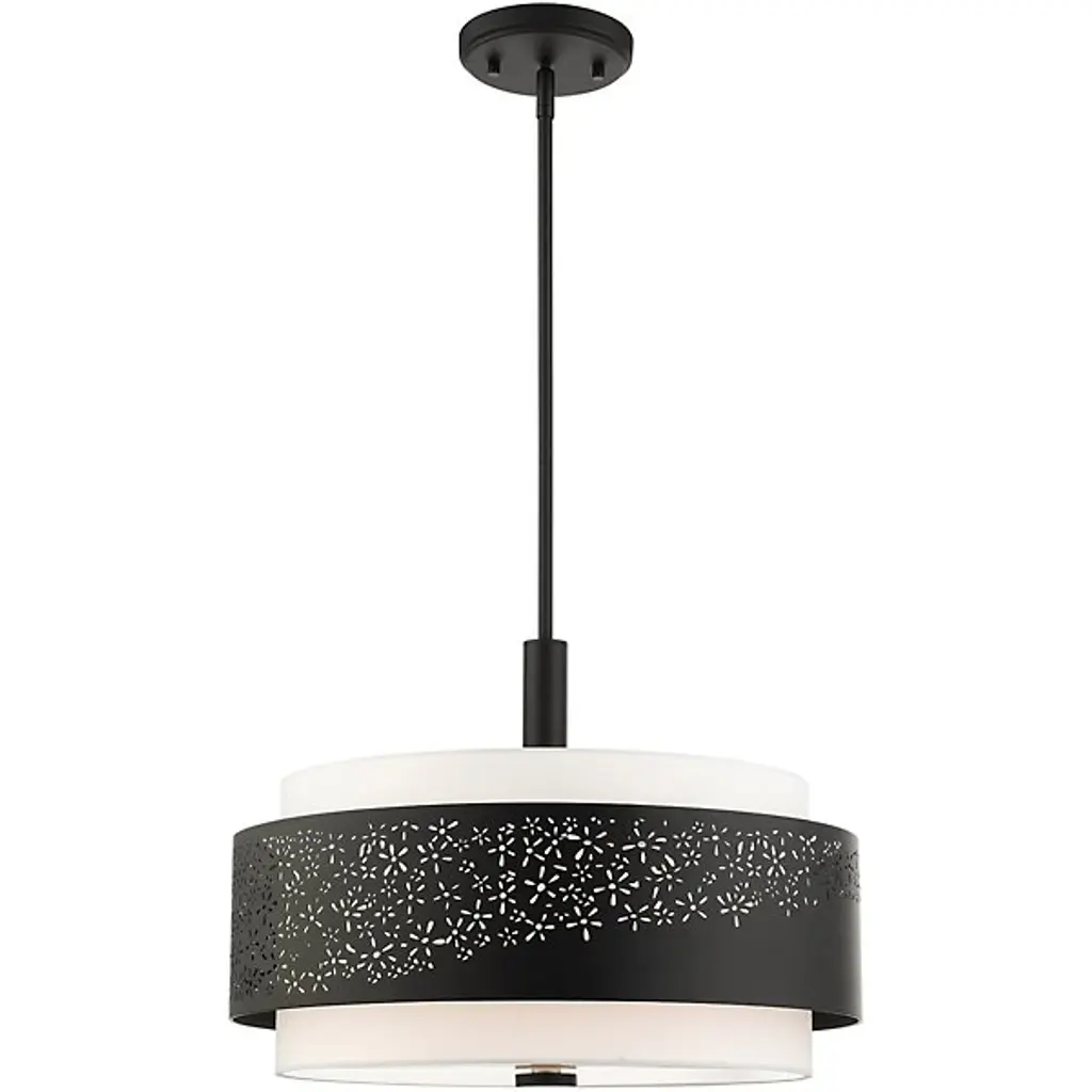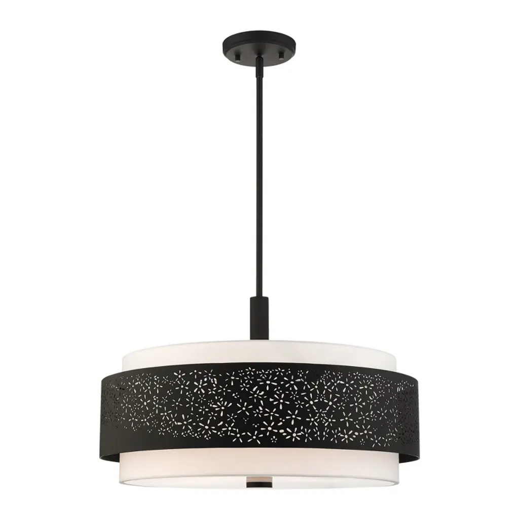 The Summer Drum Pendant by Alder & Ore is a charming addition to spaces that combines delicate details with a bold steel shade that is neatly layered over a crisp, drum-shaped fabric shade. The steel shade has a confident finish that matches the simple down rod and finial that are paired with this design and features an intricate laser-cut pattern splayed across its surface. When illuminated, this pattern comes to life, lending an artful, layered look to this handsome chandelier as it casts a welcoming layer of light onto its surroundings.