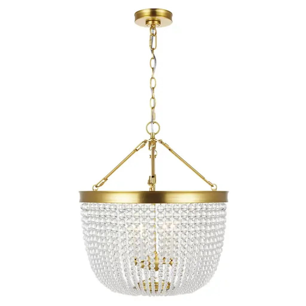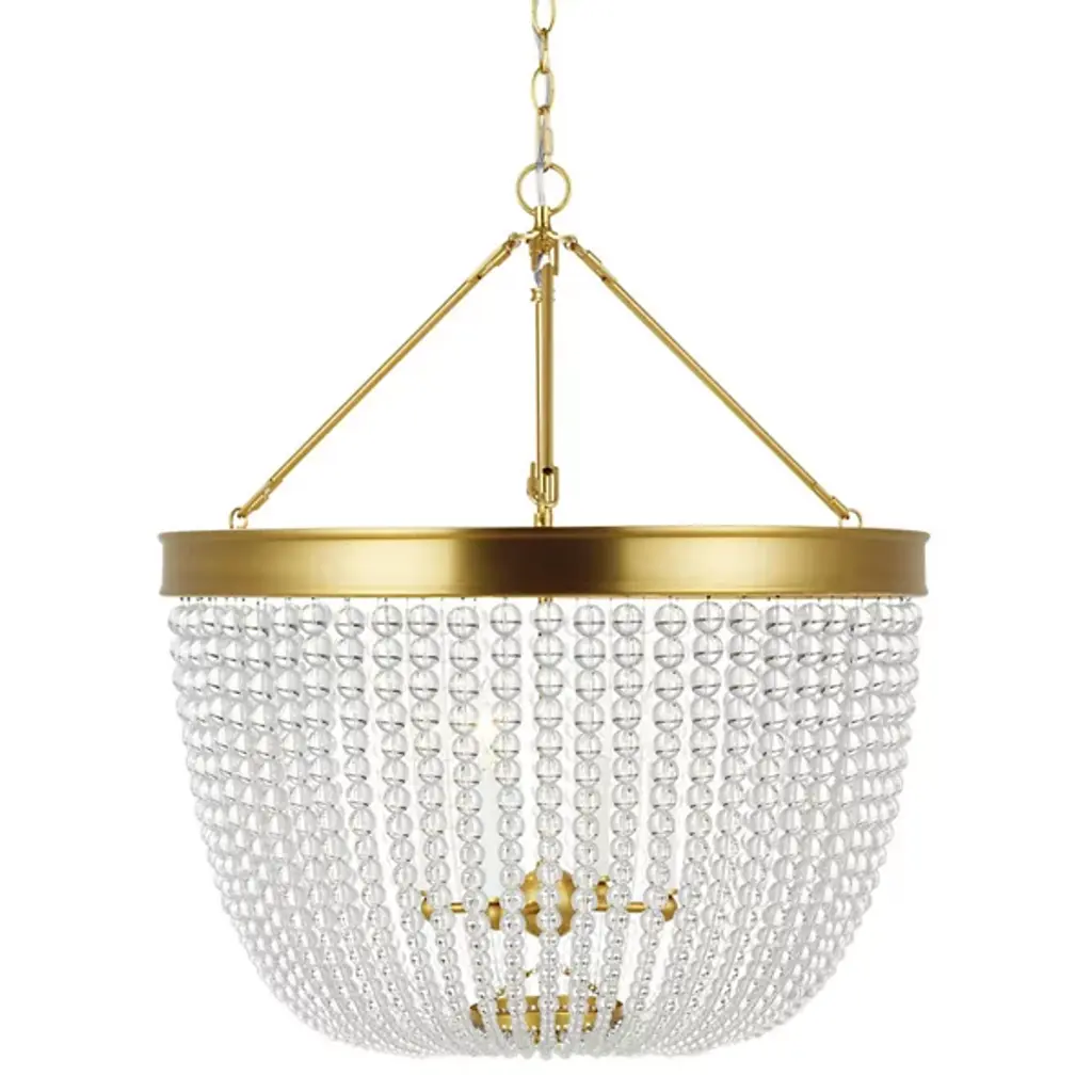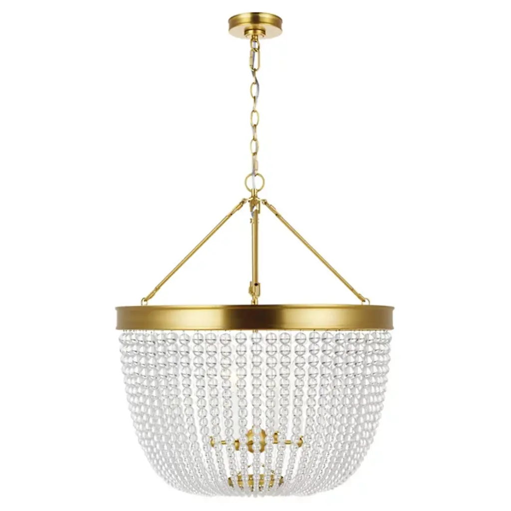 Drape gathering spaces with the dreamy silhouette and luscious glow of the Summerhill Pendant from Visual Comfort Studio, formerly known as Chapman & Myers, The pendant references mid-century modern design with a luxurious twist. Its fine suspension and ring framework catches the eye with an elegant finish. This finish shows up as touches of reflected color inside the crystal glass display. Crystal glass bead strands are arranged by hand to flow from the top to the bottom center, creating a composition of delicate curves. The bright lamping kisses each bead with beautiful highlights as it filters through to create a clean, atmospheric glow.