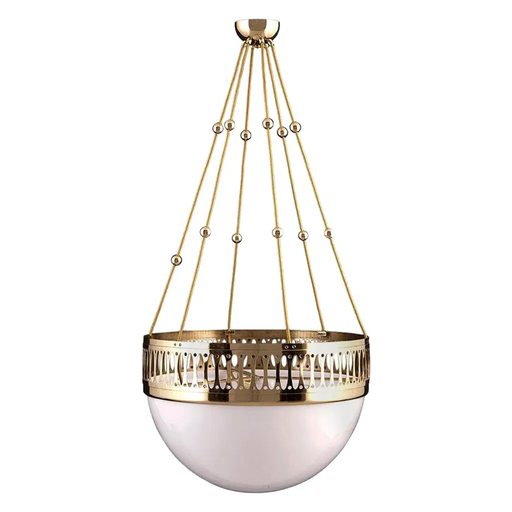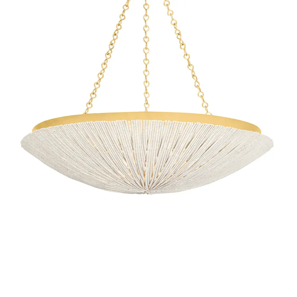 The sophisticated silhouette, ornate details, and mixed materiality of Summerside make for a truly majestic pendant light. The beautiful Coco Shell bowl on this fixture has been hand-beaded, creating a rich texture and visual dynamism. Stacked within this bowl, a Vintage Gold Leaf dish reflects light outwards, adding a tasteful material contrast. Features