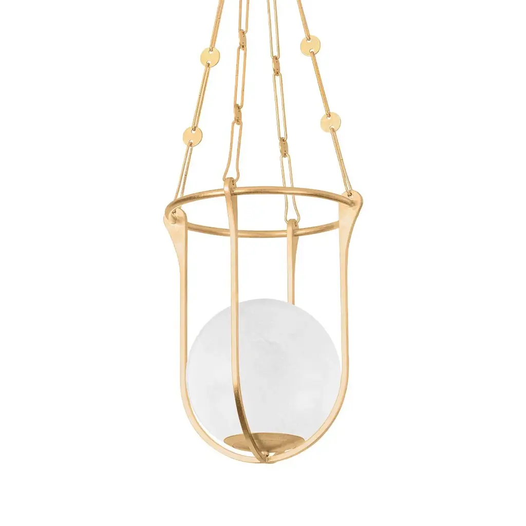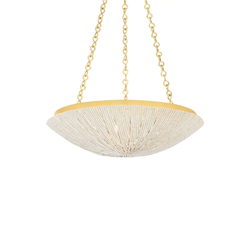 The sophisticated silhouette, ornate details, and mixed materiality of Summerside make for a truly majestic pendant light. The beautiful Coco Shell bowl on this fixture has been hand-beaded, creating a rich texture and visual dynamism. Stacked within this bowl, a Vintage Gold Leaf dish reflects light outwards, adding a tasteful material contrast. Features