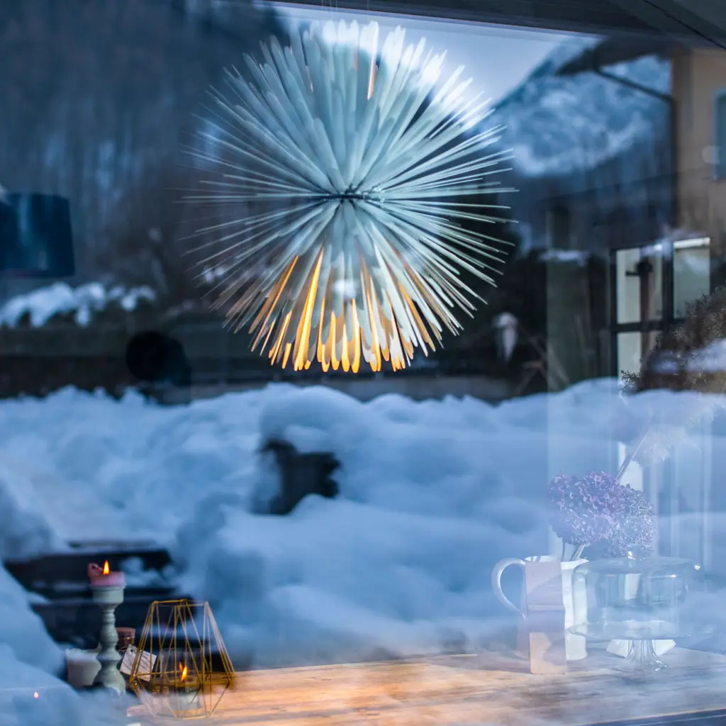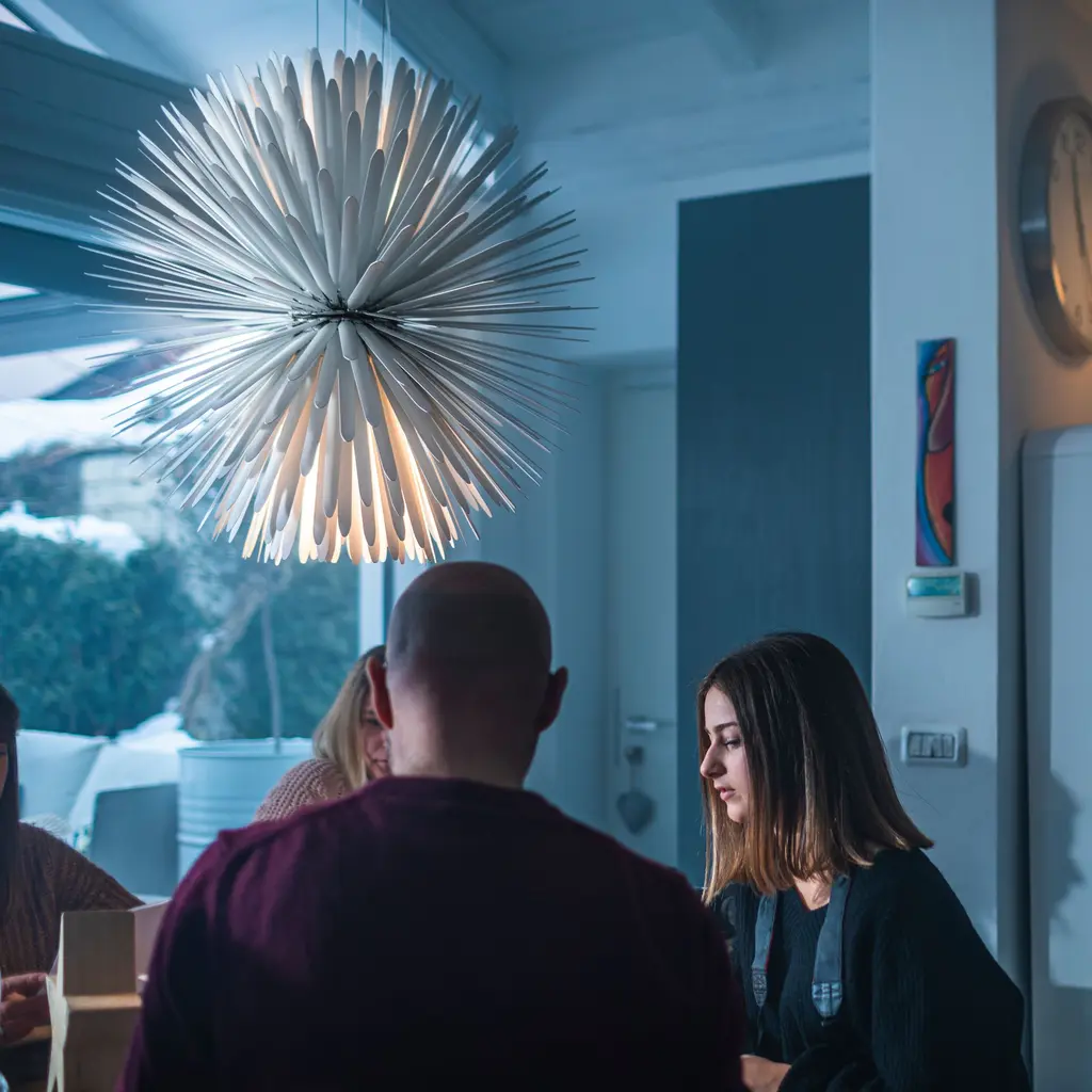 Sun-Light of Love turns metal into a burst of quiet radiance. Dutch designer Tord Boontje arranged dozens of slender aluminum “rays” around a fixed LED core, so the shade reads like a frozen sunflare—no clear inside or outside, just light slipping between petals and scattering soft shadows across the room. At about 24″ in diameter, the pendant holds its own above a dining table or floating in a double-height foyer. The integrated LED (CRI 90, warm 2700 K) shines downward in a gentle pool while back-lighting the filaments, giving the piece depth without glare. A frosted diffuser caps the bottom, keeping the view tidy from below. Choose satin White for an airy feel or Gold for a warmer, more dramatic presence. Each fixture is built and finished in Italy by Foscarini, then shipped with an adjustable suspension cable and a ceiling canopy that hides the driver—no extra boxes cluttering the line.
