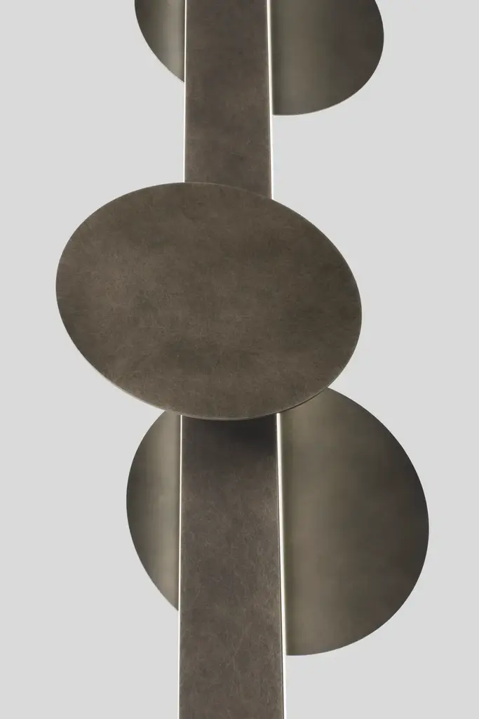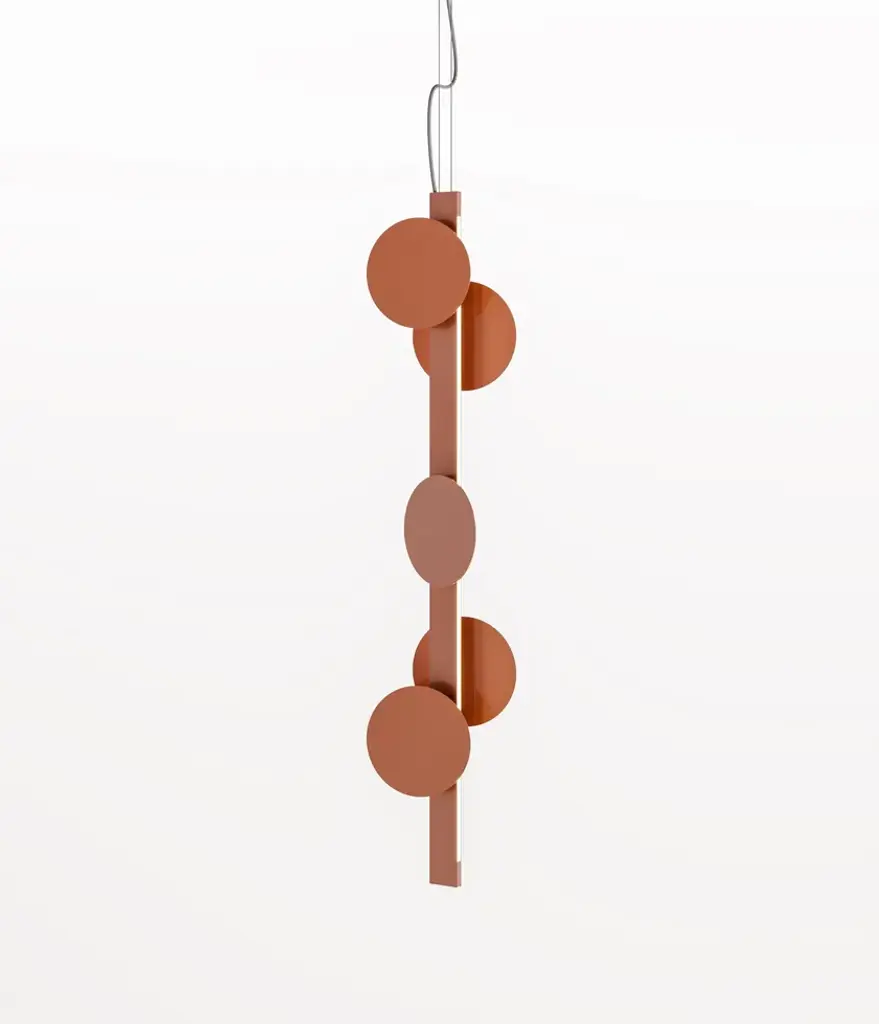Sundown Vertical is a suspended lamp consisting of a metal bar with a double strip of LED lights and magnetic circles and semicircles attached to the sides. It can be hung horizontally or vertically and has a stunningly beautiful iconic design evoking the shape of the sun and its rhythmic setting in the evening. There are endless possible custom design options, just by selecting the desired number, shape and colour of magnetic elements. The lamp hangs from the ceiling using steel wires.Materials: metalFinishes:Powder coated finishes: (White, Black, Titanium, Graphite, Brass, Copper, Canapa, Earth, Brick Red, Pistachio, Sage, Taupe)Aged (Bronze, Pewter, Aged Copper).