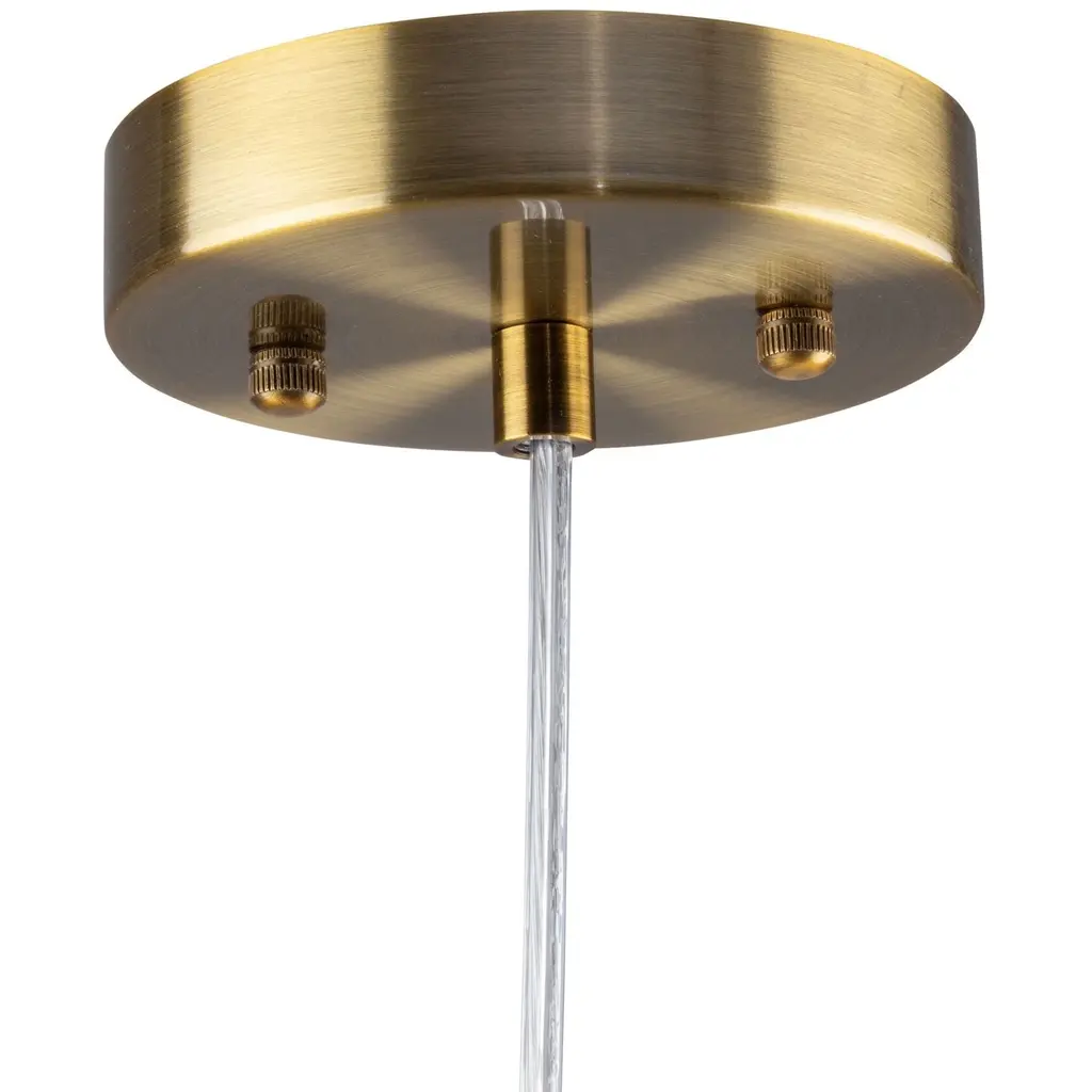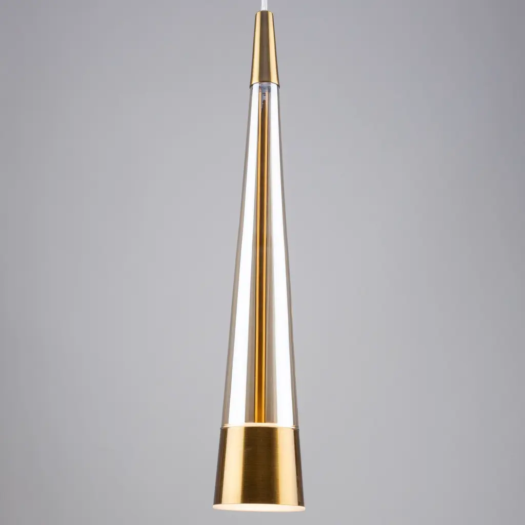 The Sunnyvale collection boasts a distinctive cone-shaped design adorned with metalwork on both the top and bottom, enveloping a captivating tea stain tinted center glass complimented with brushed brass framing. The pendant's exquisite craftsmanship and attention to detail result in a contemporary yet elegant aesthetic, making it a standout piece in any interior. With LED illumination seamlessly integrated throughout the glassware, the Sunnyvale collection not only delivers striking visual appeal but also provides efficient and ambient lighting. Single pendant shown. (easily height adjustable)