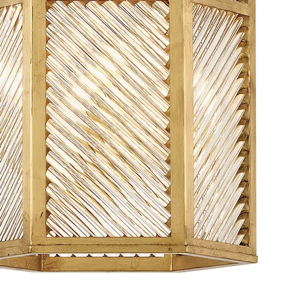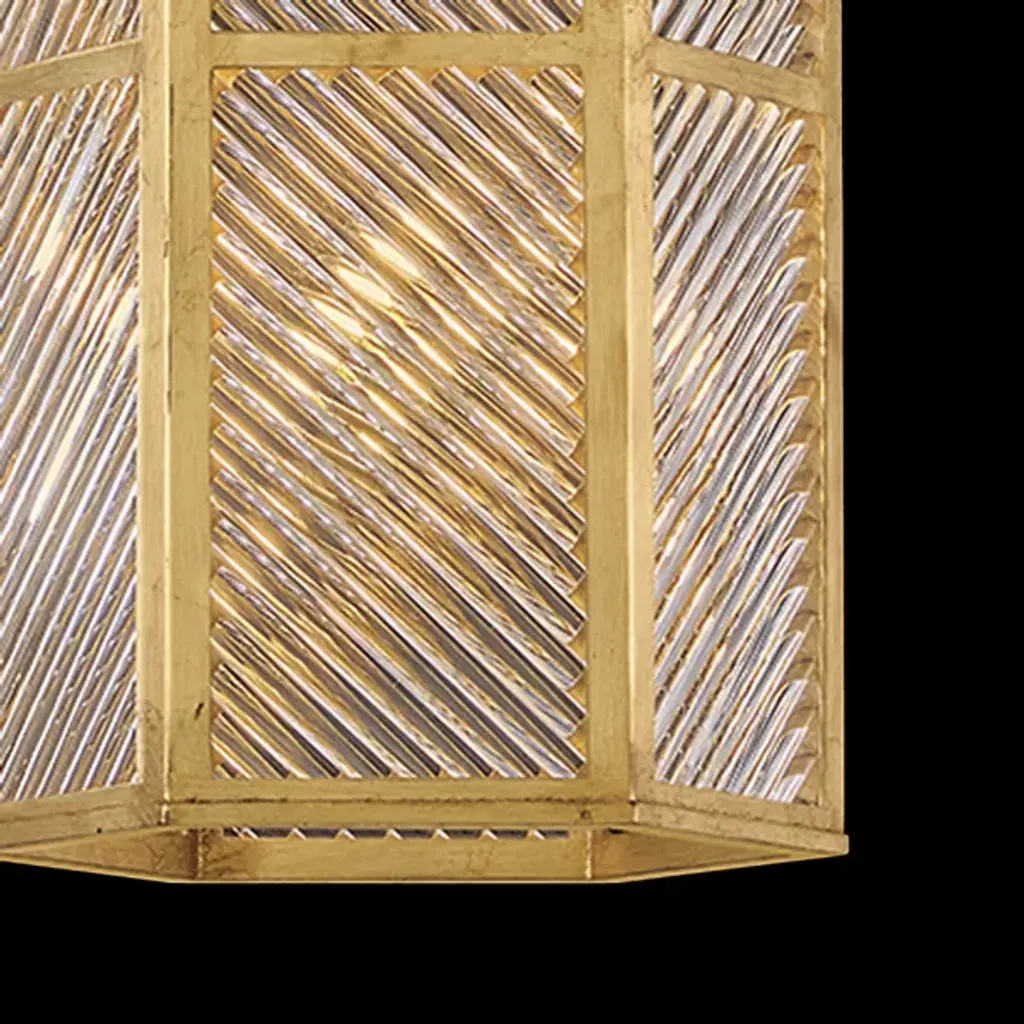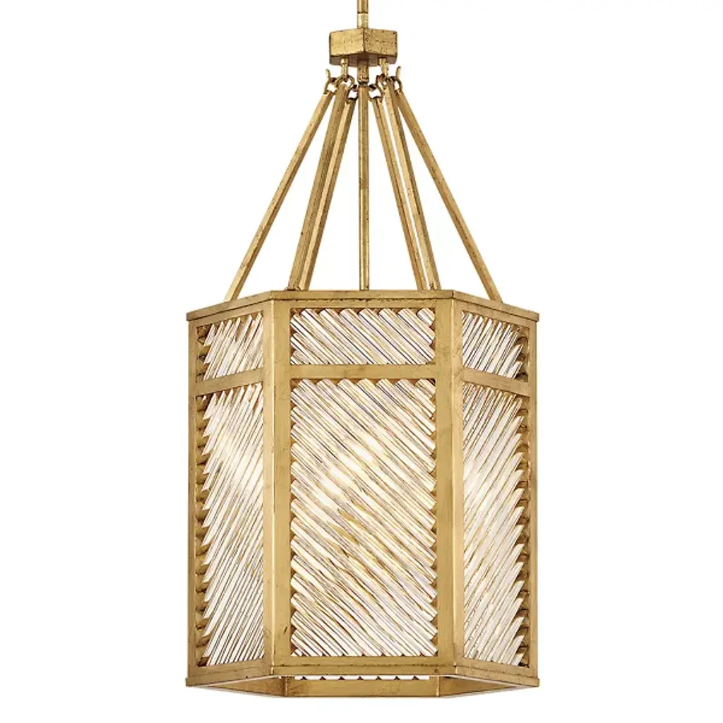 The Sura Pendant from Hinkley updates mid-century design through cylindrical glass rods set in a hexagonal frame. The alternating angles of glass create a subtle herringbone pattern within the brass structure. This layering effect produces an intricate play of light and reflection. The glass rods' arrangement adds depth to the geometric framework, while the distressed brass finish grounds the design. Multiple stem options allow for custom installation heights, making this pendant adaptable to various ceiling heights and room layouts.
