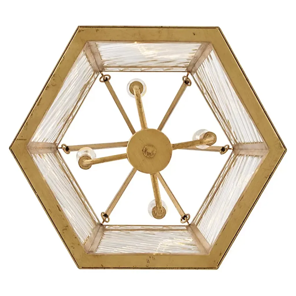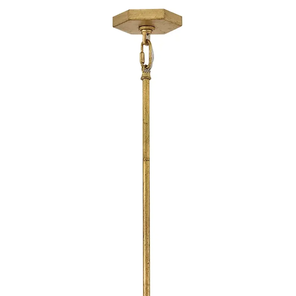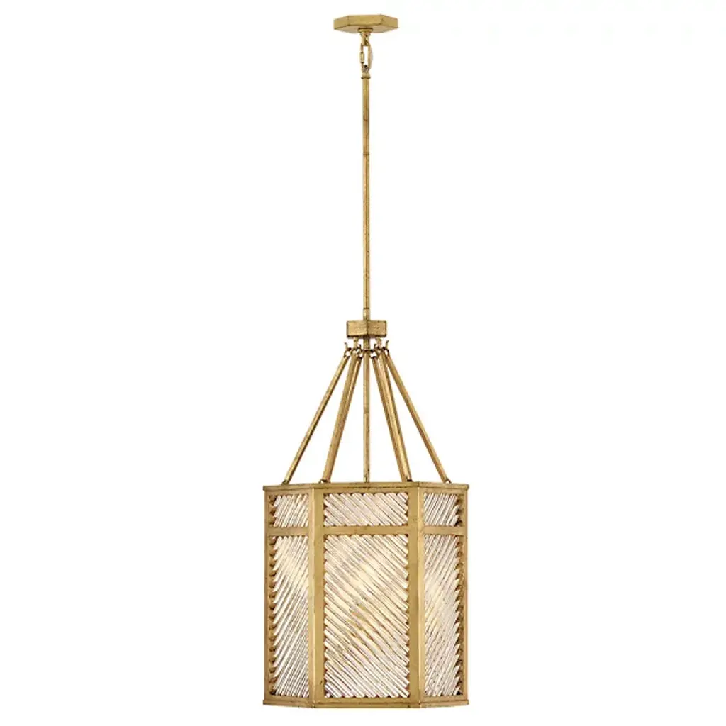 The Sura Pendant from Hinkley updates mid-century design through cylindrical glass rods set in a hexagonal frame. The alternating angles of glass create a subtle herringbone pattern within the brass structure. This layering effect produces an intricate play of light and reflection. The glass rods' arrangement adds depth to the geometric framework, while the distressed brass finish grounds the design. Multiple stem options allow for custom installation heights, making this pendant adaptable to various ceiling heights and room layouts.