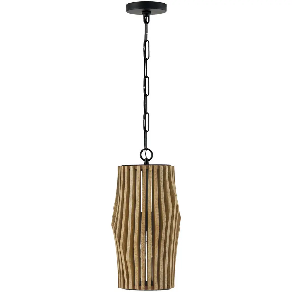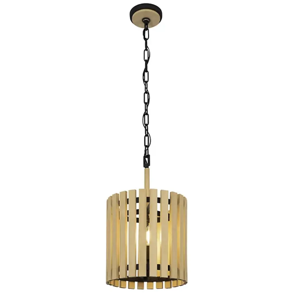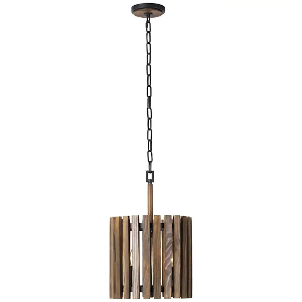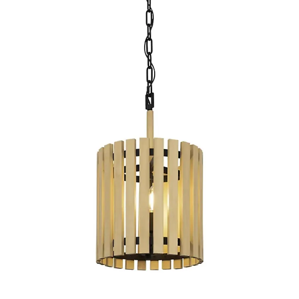 The Suratto Pendant from Varaluz is designed by Ron Henderson. It combines rustic modern style with Japanese minimalism. The drum-shaped pendant boasts a distinctive slatted appearance. Crafted from recycled steel, the frame reflects a commitment to sustainability, while the shade, composed of upcycled pallet wood, adds warmth and character. Illuminated by candelabra base LEDs, Suratto offers functional. With dimmable capabilities when paired with a separately sold ELV dimmer, you can adjust the brightness level of this CSA-certified fixture.