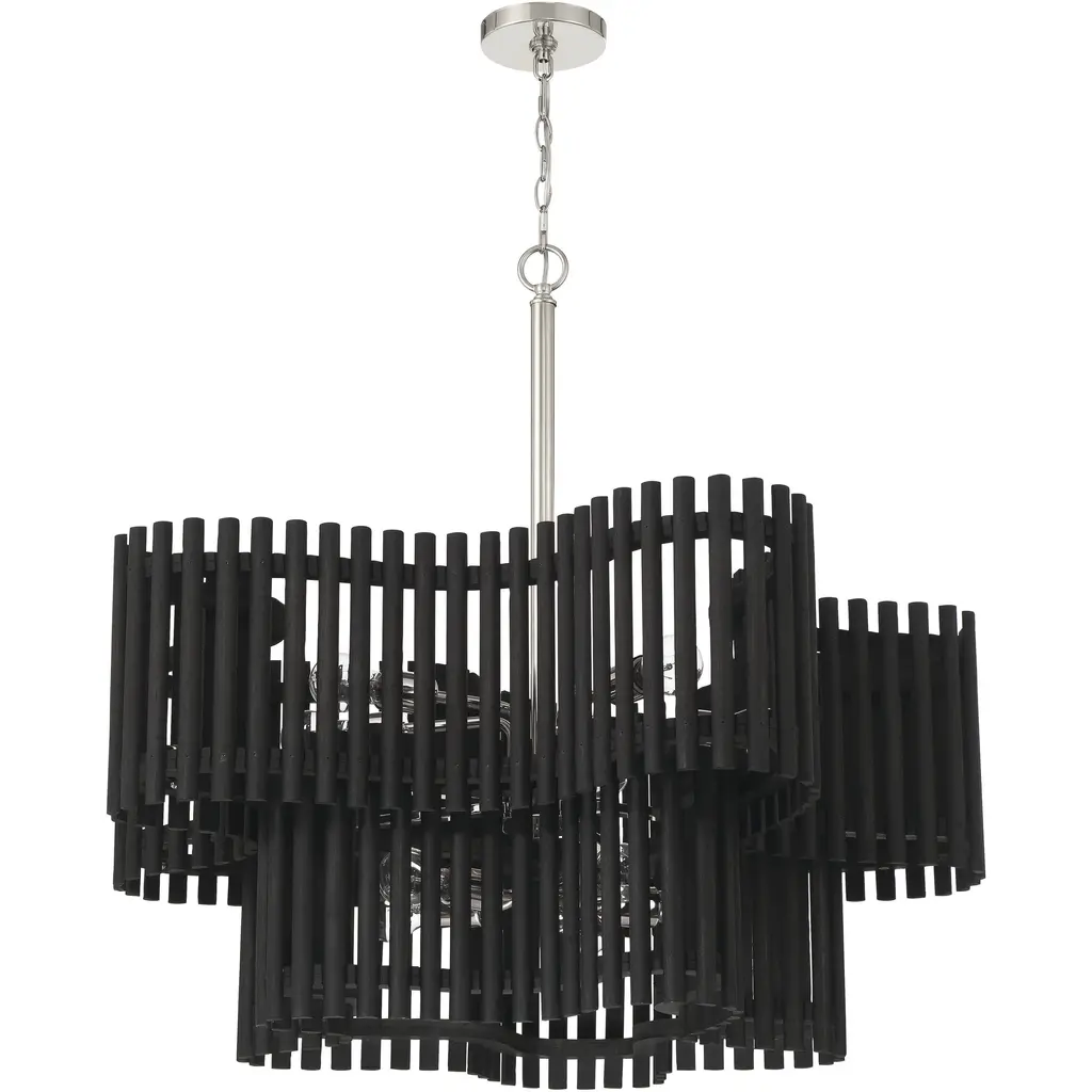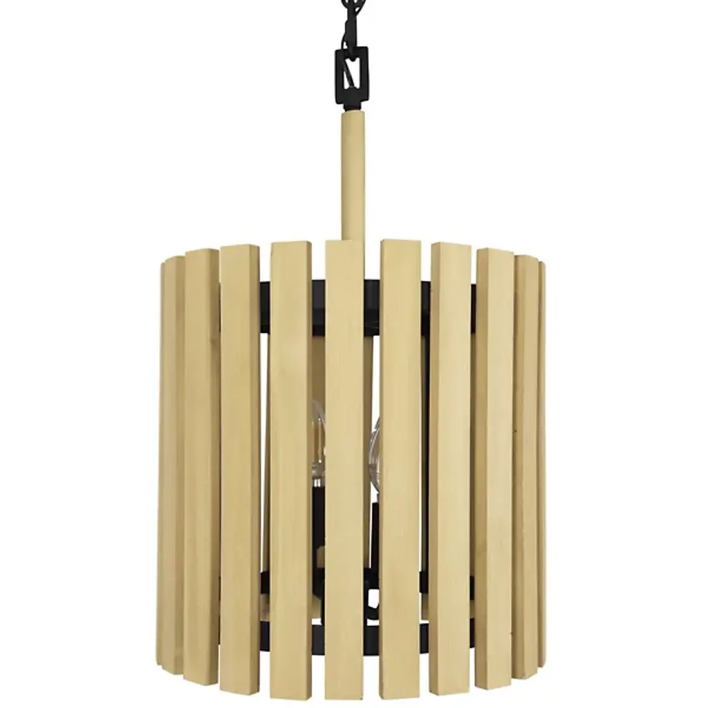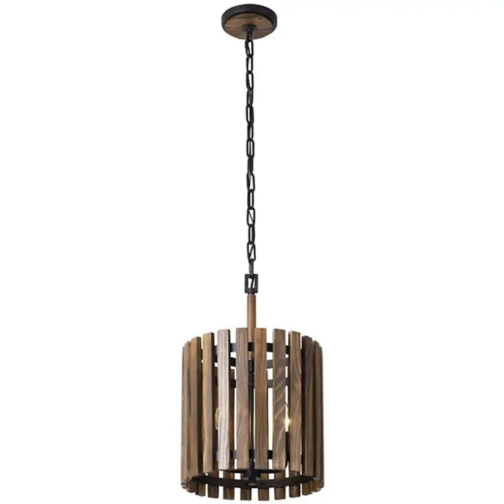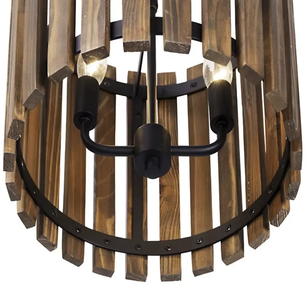 The Suratto Pendant from Varaluz is designed by Ron Henderson. It combines rustic modern style with Japanese minimalism. The drum-shaped pendant boasts a distinctive slatted appearance. Crafted from recycled steel, the frame reflects a commitment to sustainability, while the shade, composed of upcycled pallet wood, adds warmth and character. Illuminated by candelabra base LEDs, Suratto offers functional. With dimmable capabilities when paired with a separately sold ELV dimmer, you can adjust the brightness level of this CSA-certified fixture.